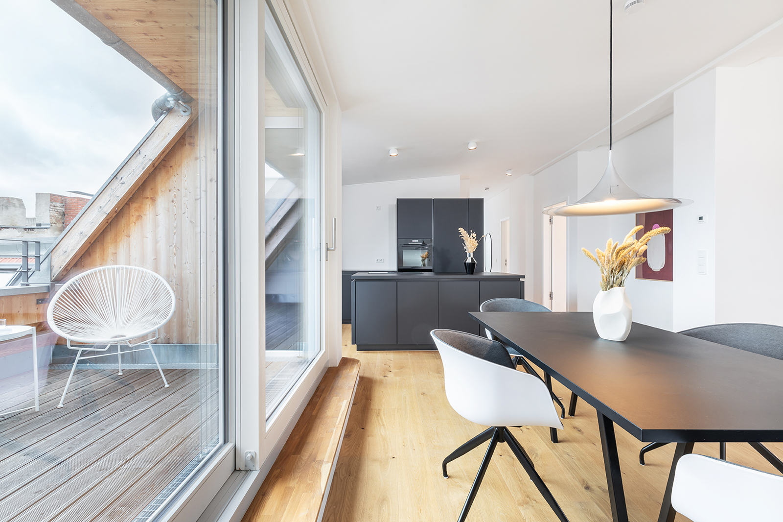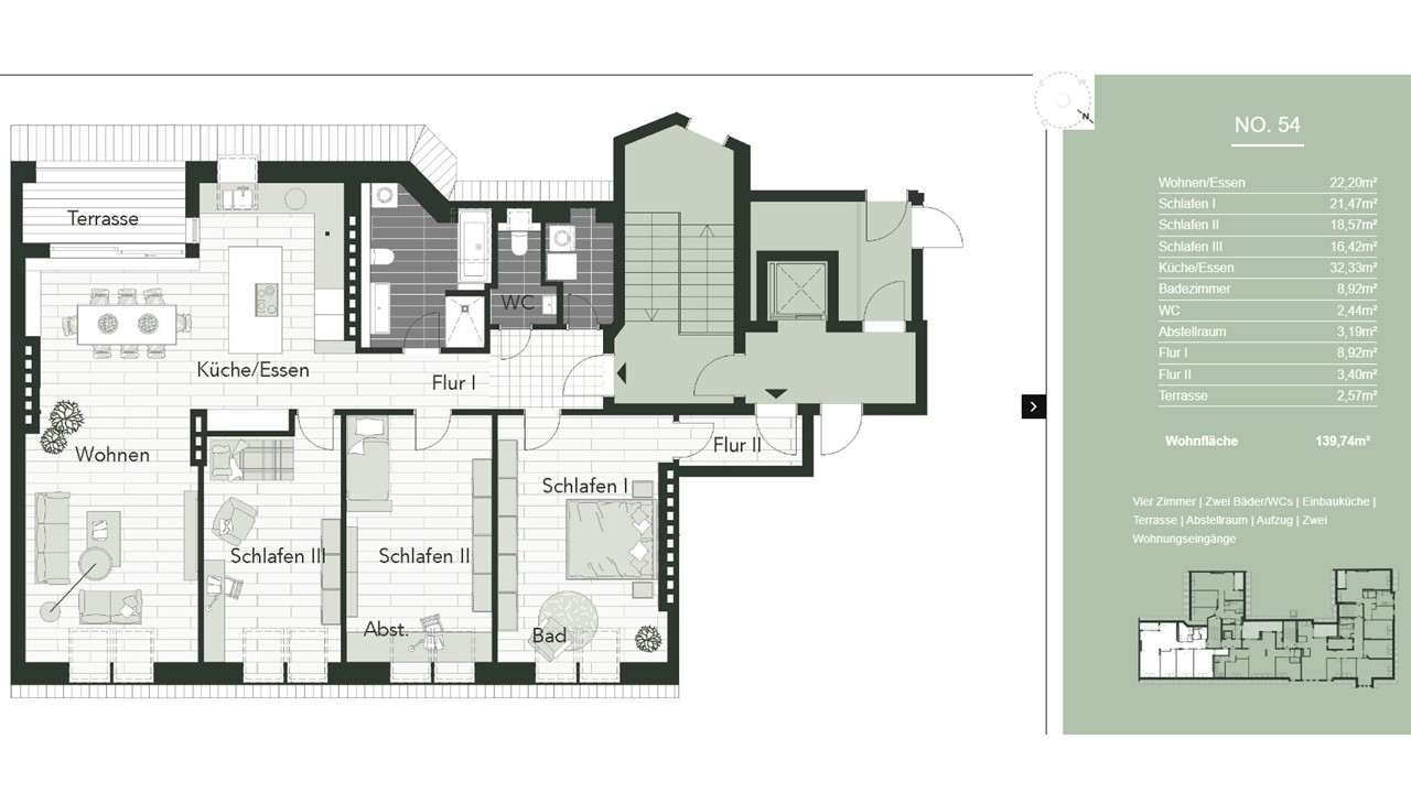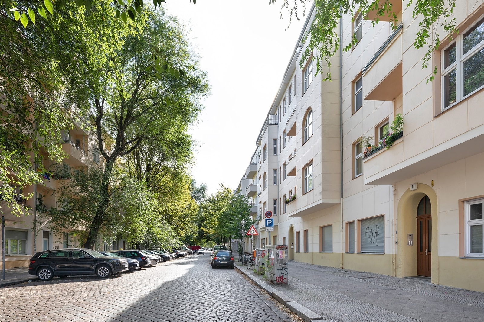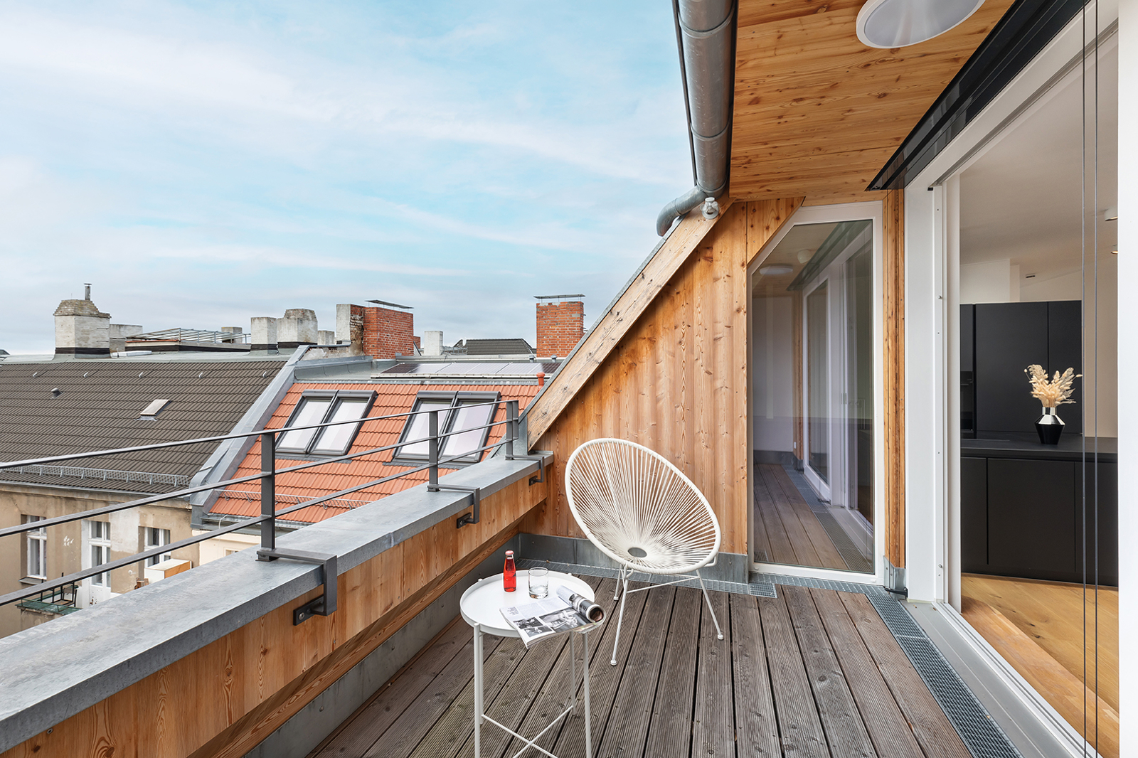 Erstbezug nach DG-Ausbau: 4 Zimmer, Lift, S-W-Terrasse, Wärmepumpe, Effizienz A - Belgisches Viertel In einem klassischen Berliner Gründerzeithaus entstanden im Zuge eines umfassenden Dachgeschossausbaus fünf Dachgeschoss-Wohnungen, die modernsten Wohnkomfort und historische Architektur auf harmonische Weise vereinen. Der Dachstuhl wurde vollständig zurückgebaut, neu geplant und errichtet. Sämtliche Deckenbalken wurden überprüft und bei Bedarf ausgetauscht. Im Zuge des Ausbaus wurde das Gemeinschaftseigentum umfassend mitsaniert, während der historische Altbaucharme bewusst erhalten blieb. Aufwendige Details wie die prachtvollen Treppenhäuser mit massiven Echtholztüren, ein Terrazzofußboden im Eingangsbereich und kunstvolle Stuckelemente tragen zur beeindruckenden Atmosphäre des Hauses bei. Der Innenhof wird neu angelegt und trägt so zu einem ansprechenden Gesamteindruck bei. Zwei neu installierte Aufzüge ermöglichen einen bequemen Zugang zu vier der fünf Dachgeschosswohnungen. Die entstandenen Dachgeschosswohnungen sind zwischen 88 und 163 qm groß und bieten 3 bis 5 Zimmer, was sie ideal für Familien, Paare oder auch Singles macht. Jede Wohnung verfügt über eine durchdachte Raumaufteilung und eine großzügige, halb-überdachte Terrasse, die mit robusten Terrassendielen aus Nordischer Lärche sowie einer Markise für sommerlichen Licht- und Wärmeschutz ausgestattet ist. Große Fensterflächen und Oberlichter sorgen für viel Tageslicht und eine einladende Atmosphäre. Hohe Decken von 2,60 bis 3,20 Metern, ein langlebiges sowie edles Eichenparkett und eine per App steuerbare Fußbodenheizung mitsamt Trittschalldämmung sorgen für zusätzlichen Wohnkomfort. Maßstäbe setzen die Wohnungen in Bezug auf die Energieeffizienz: Jede Einheit verfügt über eine eigene Luft-Wärmepumpe von VIESSMANN sowie eine private Photovoltaik-Anlage mit Stromspeicher. Dreifach verglaste Fenster aus Fichtenholz bieten exzellenten Schallschutz und zusätzliche Wärmeisolierung. Mit einer Energieeffizienzklasse von A für die Dachgeschosseinheiten und C für das übrige Gebäude werden hier höchste Ansprüche in Puncto Energieeffizienz erfüllt. Die Badezimmer präsentieren sich dank stilvollen Fliesen, Regendusche, separaten Wanne in einem modernen Look. Hochwertigen Marken-Sanitärgegenständen von Villeroy & Boch bzw. Duravit zeugen von einer stilvollen Ausstattungslinie. Mit Ausnahme der kleinsten Wohnung steht auch ein separates Gäste-WC zu Verfügung. Jede Wohnung ist mit einer praktischen Abstellkammer mit Waschmaschinenanschluss ausgestattet. Zusätzlich ist jeder Wohnung ein Kellerraum für zusätzlichen Stauraum zugeordnet. Bei der hier angebotenen Wohnung WE 54 handelt es um eine ca. 140 qm große 4-Zimmerwohnung (3 Schlafzimmer sowie einem ca. 55 qm großen Wohn-Essbereich), S-W-Terrasse, Vollbad sowie Gäste-WC und ist bequem per Aufzug erreichbar. Als einzige Wohnung ist hier eine hochwertige Einbauküche vorinstalliert.
