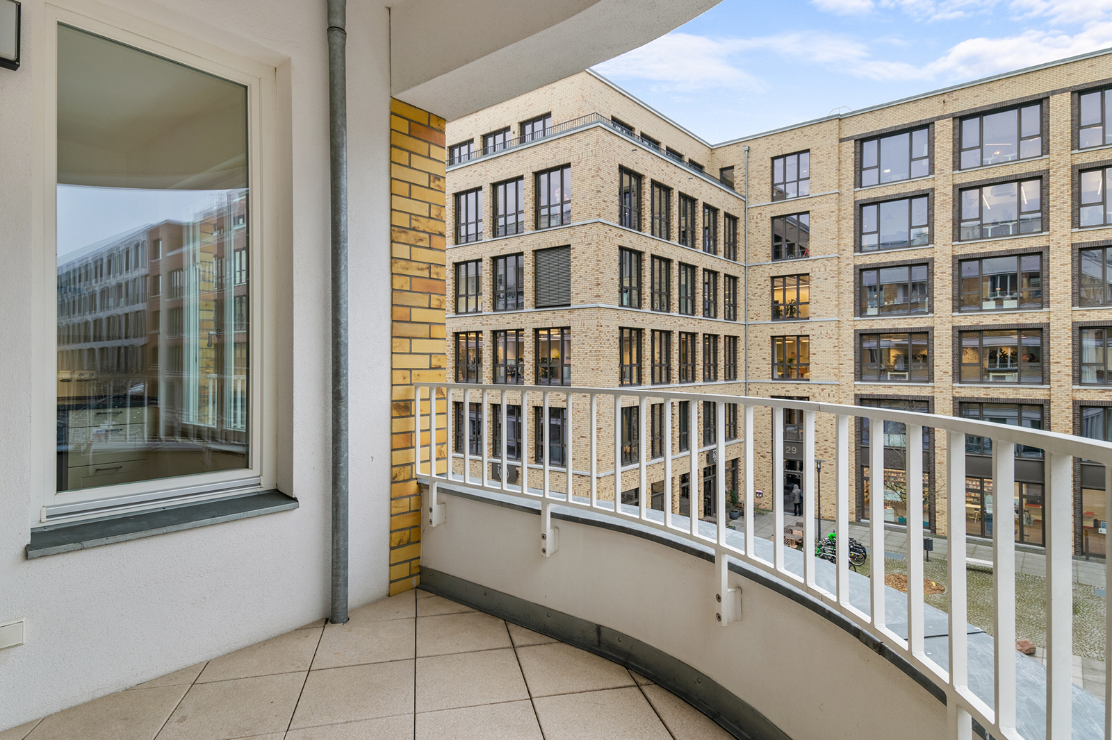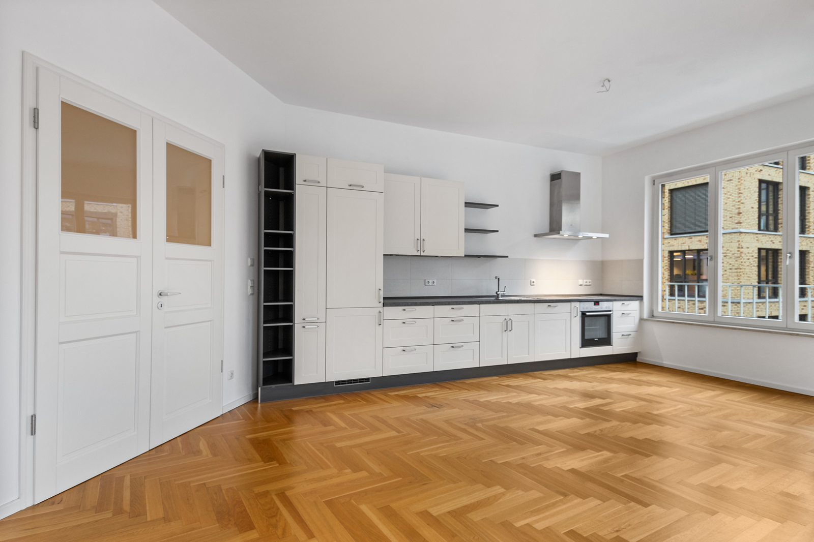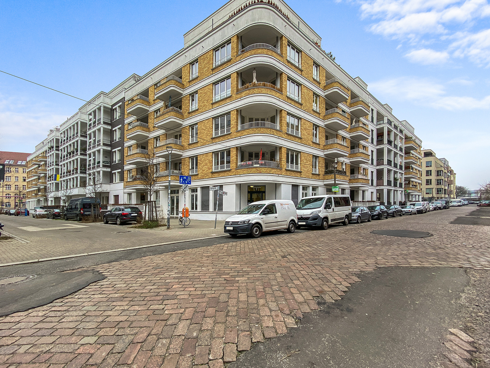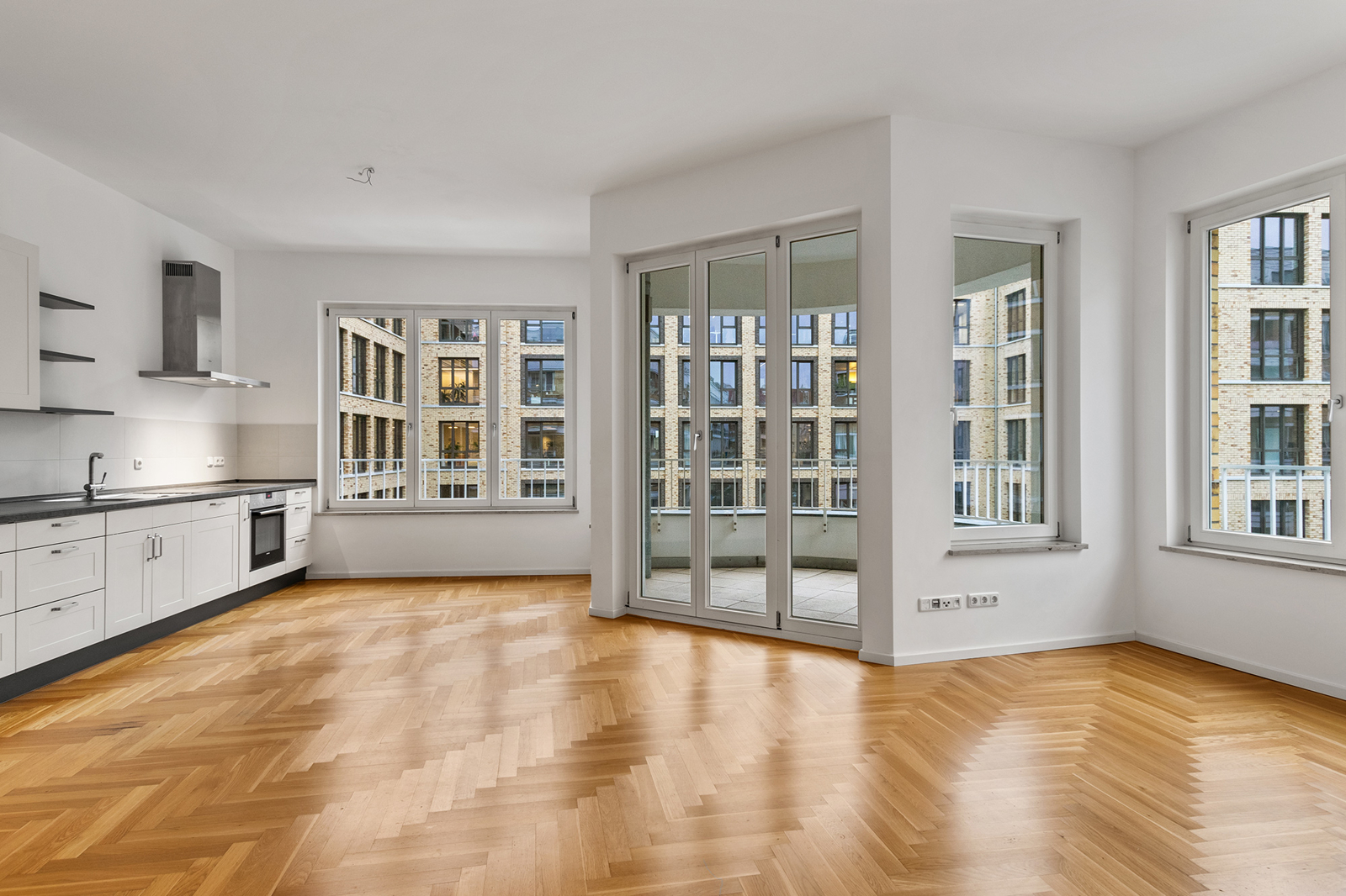 Friedrichshain: Lichtdurchflutete 3-Zimmer-Wohnung mit Aufzug & 2 Balkonen in einem familienfreundlichen Haus Die hier angebotene Wohnung befindet sich im 2. Obergeschoss eines 2014 errichteten Neubaus in Berlin Friedrichshain und ist bequem mit dem Aufzug zu erreichen. Die 3-Zimmer Wohnung empfängt Sie mit einem geräumigen Eingangsbereich, der ausreichend Platz für eine Garderobe hat. Der angrenzende großzügige Wohnbereich mit offener Küche und Zugang zur Loggia bildet zweifellos den Mittelpunkt der Wohnung. Dank der Ecklage innerhalb des Baukörpers wird dieser Raum von zwei Seiten belichtet und wirkt sehr freundlich. Diese luftige Atmosphäre wird durch das helle Eichenparkett noch unterstrichen. Hier lässt sich das gesellige Beisammensein mit Familie und Gästen vortrefflich mit dem Zubereiten und Genießen von kulinarischen Köstlichkeiten kombinieren. In der warmen Jahreszeit lädt die geräumige Loggia zum Verweilen ein. Zwei separate Schlafzimmer, eines davon mit Zugang zu einer weiteren Loggia, bieten weiteren Platz. Ein stilvolles, modernes Bad mit Wanne und bodengleicher Dusche sowie ein Gäste-WC sorgen für Komfort. Der Hauswirtschaftsraum komplettiert das Platzangebot innerhalb der Wohnung. Auch unter energetischen Gesichtspunkten ist diese moderne Wohnung in Friedrichshain sehr attraktiv. Dreifach verglaste Fenster und eine Fußbodenheizung sind energieeffizient.