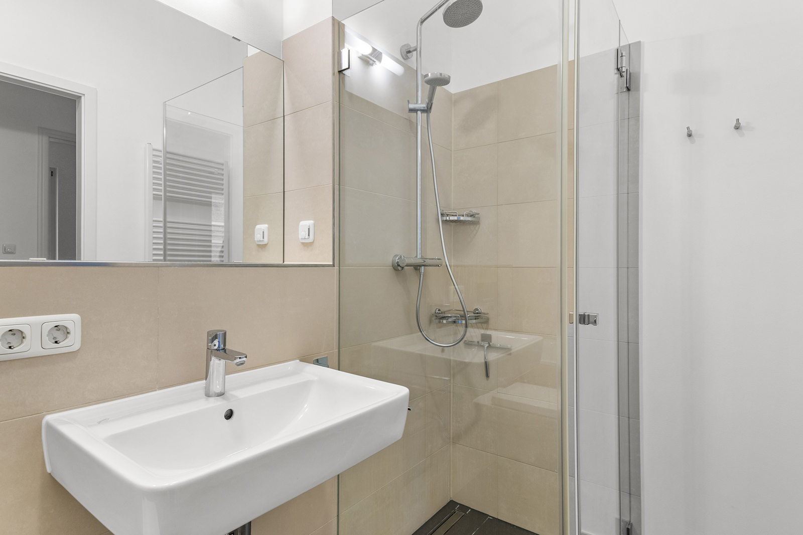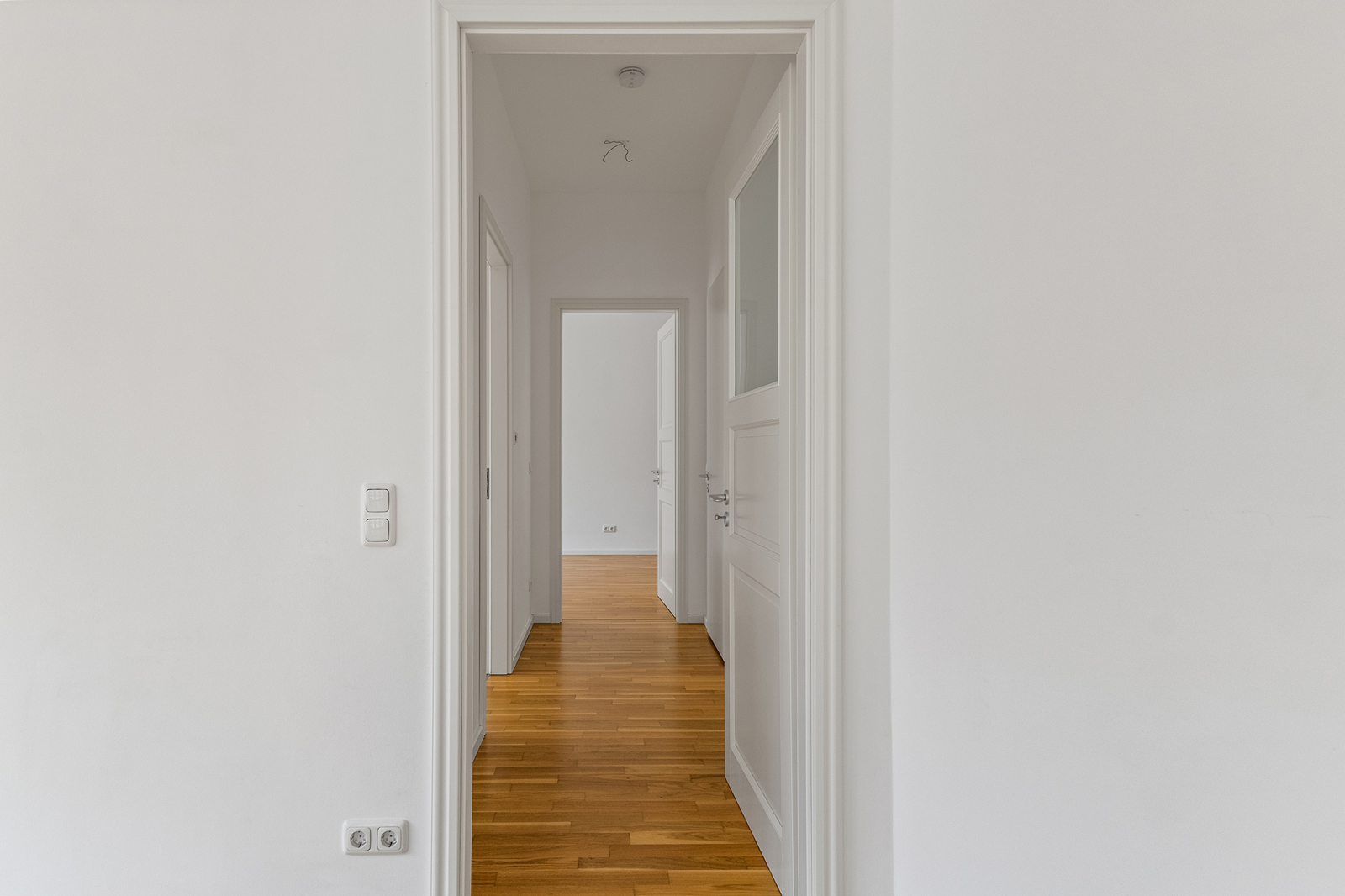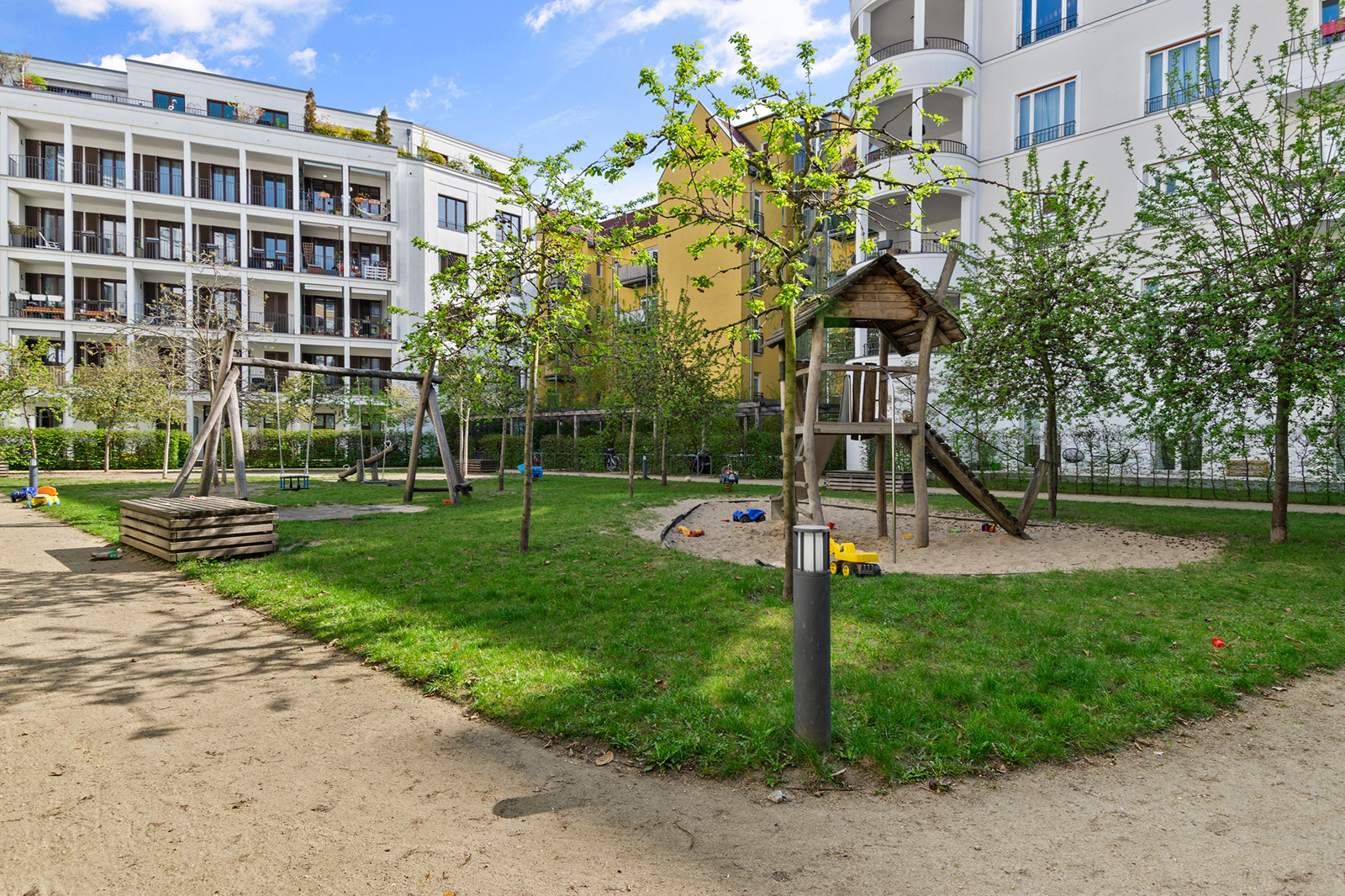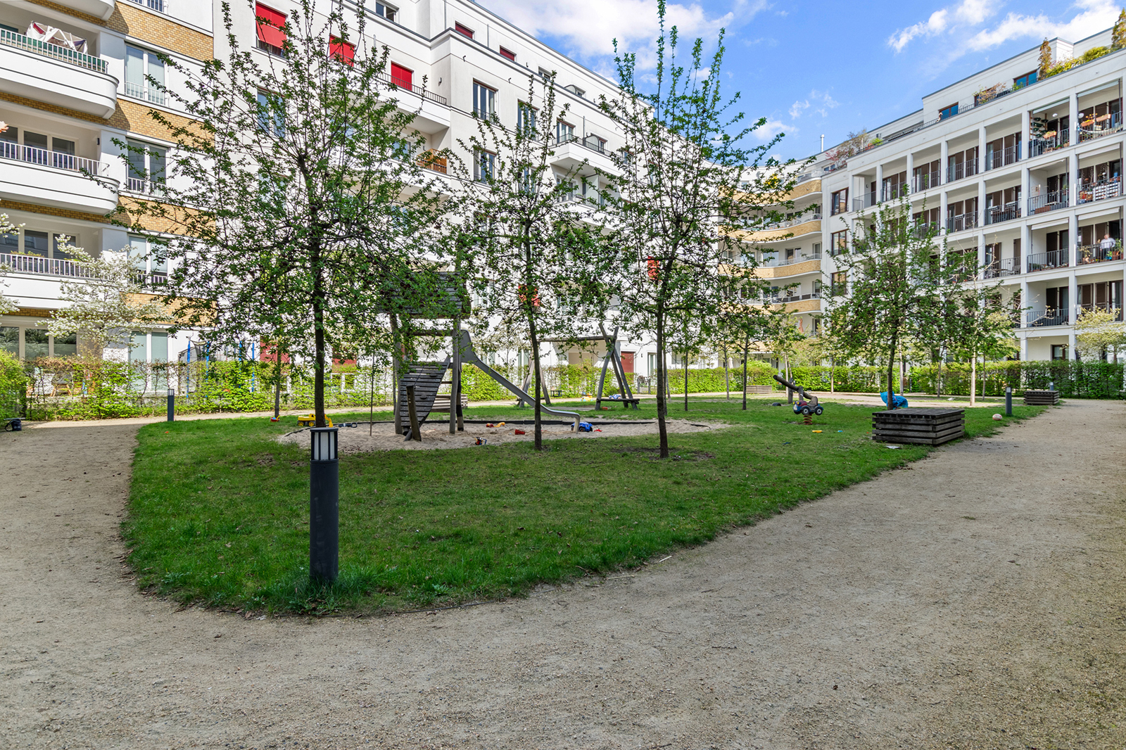 Friedrichshain: Lichtdurchflutete 3-Zimmer-Wohnung mit Aufzug & 2 Balkonen in einem familienfreundlichen Haus Die hier angebotene Wohnung befindet sich im 2. Obergeschoss eines 2014 errichteten Neubaus in Berlin Friedrichshain und ist bequem mit dem Aufzug zu erreichen. Die 3-Zimmer Wohnung empfängt Sie mit einem geräumigen Eingangsbereich, der ausreichend Platz für eine Garderobe hat. Der angrenzende großzügige Wohnbereich mit offener Küche und Zugang zur Loggia bildet zweifellos den Mittelpunkt der Wohnung. Dank der Ecklage innerhalb des Baukörpers wird dieser Raum von zwei Seiten belichtet und wirkt sehr freundlich. Diese luftige Atmosphäre wird durch das helle Eichenparkett noch unterstrichen. Hier lässt sich das gesellige Beisammensein mit Familie und Gästen vortrefflich mit dem Zubereiten und Genießen von kulinarischen Köstlichkeiten kombinieren. In der warmen Jahreszeit lädt die geräumige Loggia zum Verweilen ein. Zwei separate Schlafzimmer, eines davon mit Zugang zu einer weiteren Loggia, bieten weiteren Platz. Ein stilvolles, modernes Bad mit Wanne und bodengleicher Dusche sowie ein Gäste-WC sorgen für Komfort. Der Hauswirtschaftsraum komplettiert das Platzangebot innerhalb der Wohnung. Auch unter energetischen Gesichtspunkten ist diese moderne Wohnung in Friedrichshain sehr attraktiv. Dreifach verglaste Fenster und eine Fußbodenheizung sind energieeffizient.