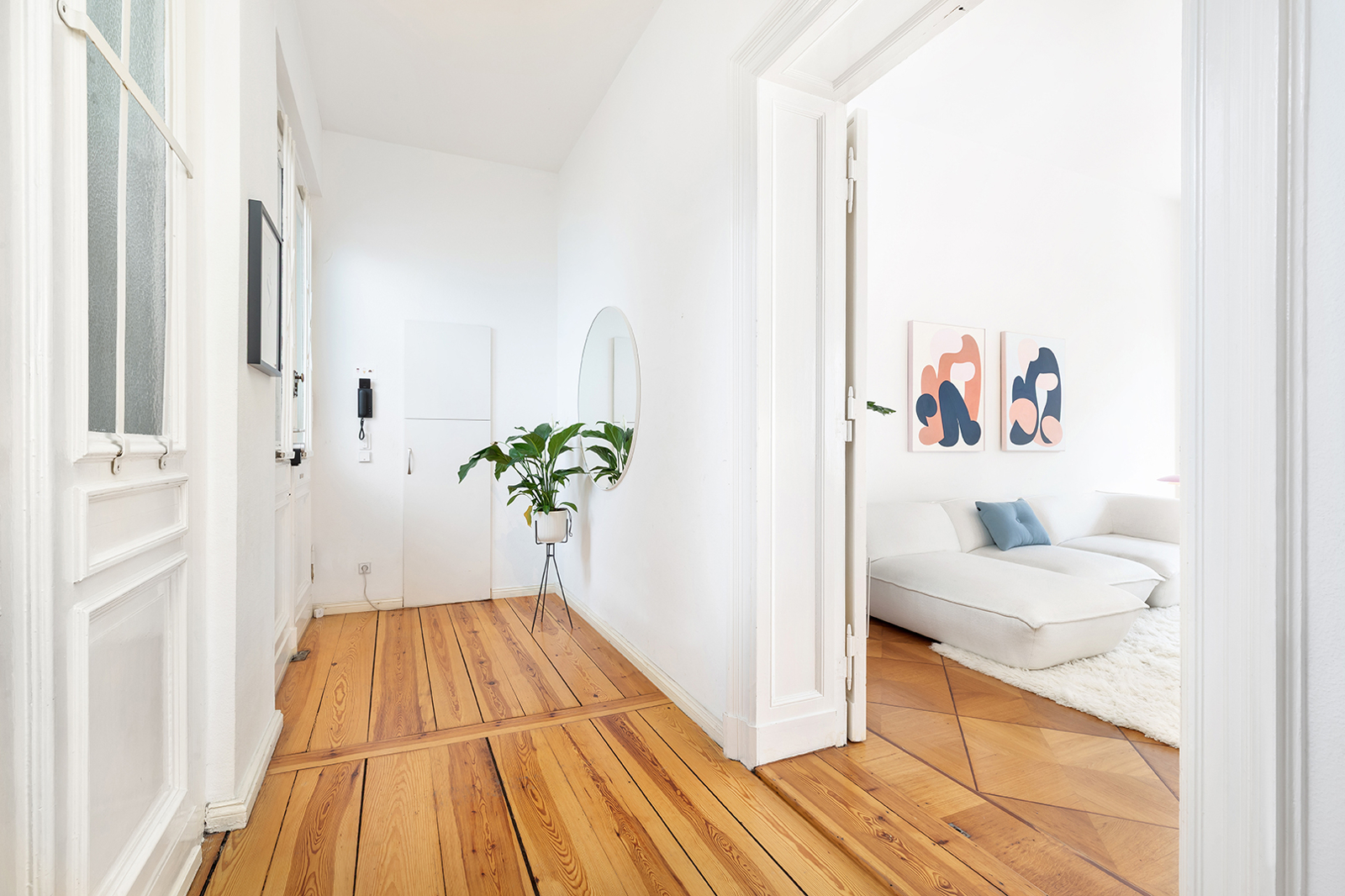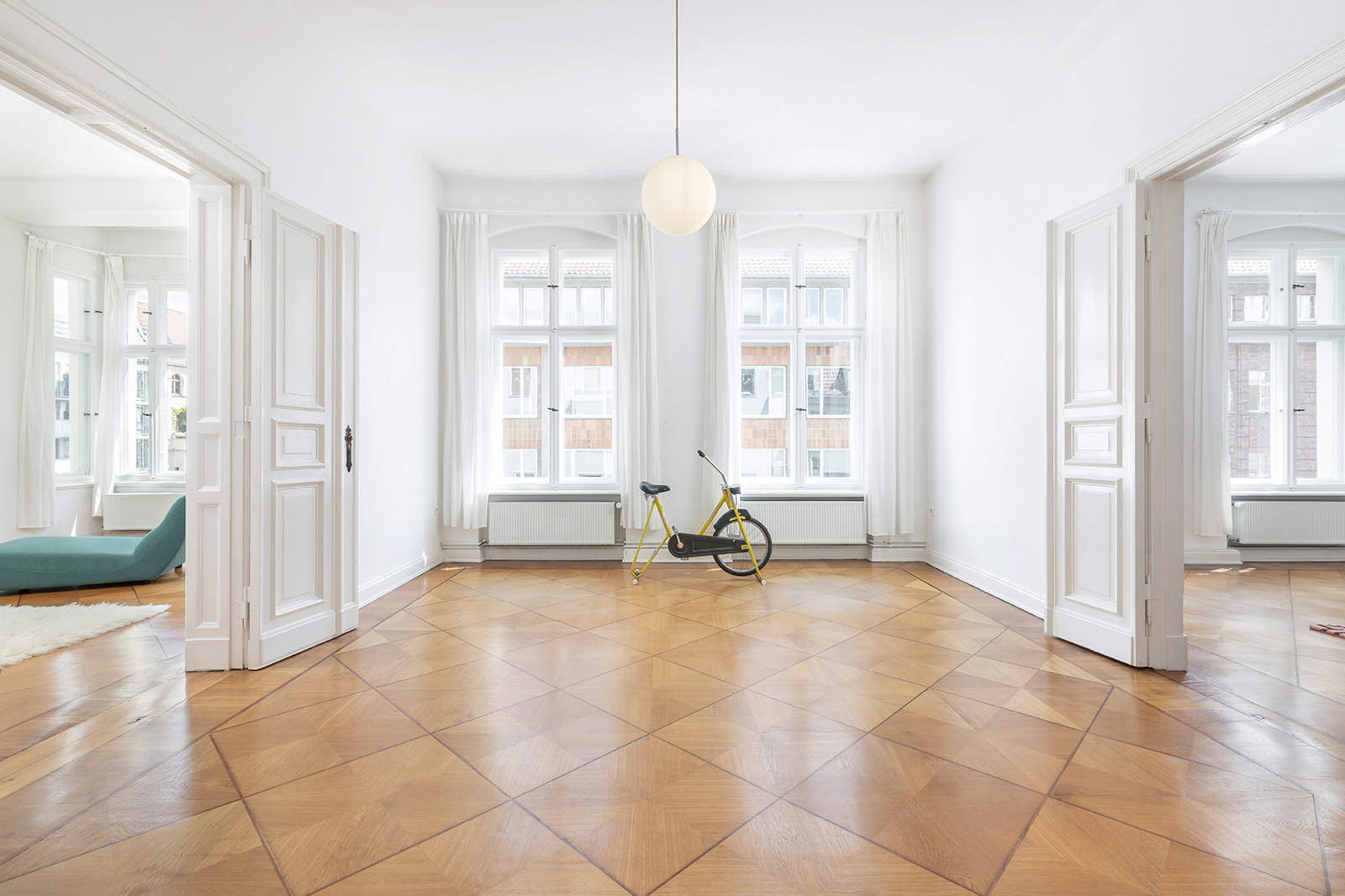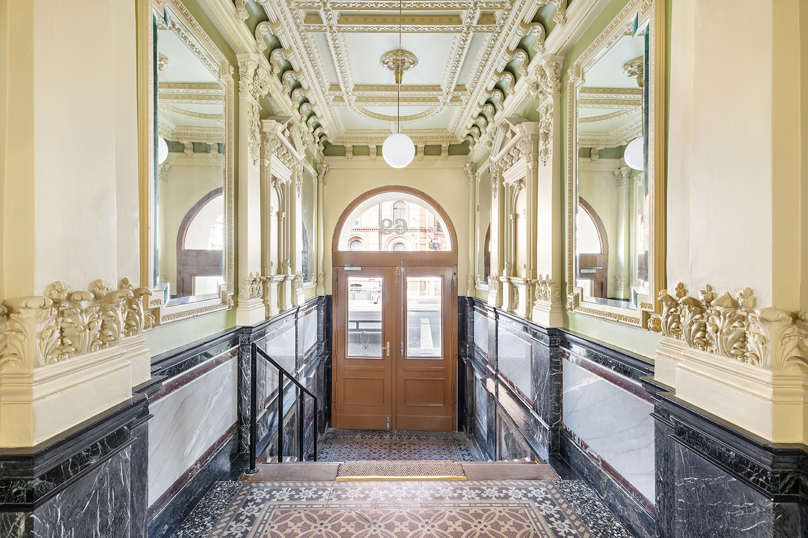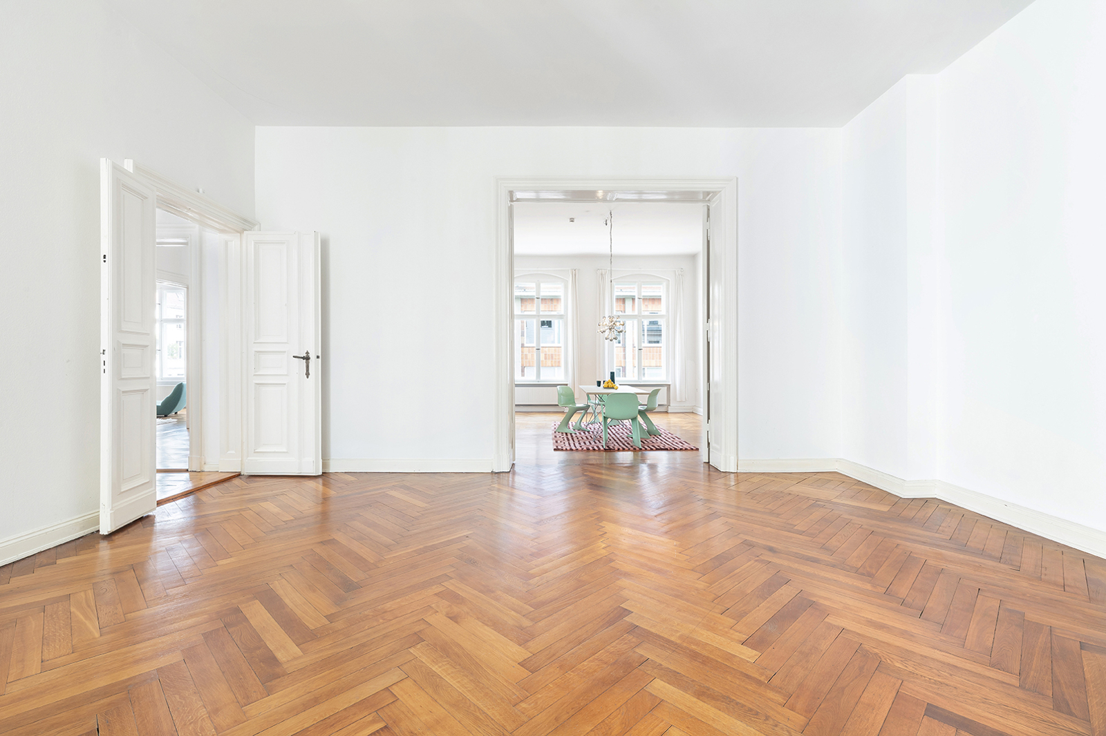Oranienburger Straße, Berlin Mitte: Großzügige 5–6 Zimmerwohnung im sanierten Denkmal-Altbau mit charaktervollen Details An der Ecke Oranienburger Straße und Tucholskystraße erhebt sich ein traditionsreiches Wohn- und Geschäftshaus, das 1886 für den Kaufmann Philipp Wertheim erbaut wurde. Das heute denkmalgeschützte Gebäude beeindruckt bereits beim Betreten: Hinter dem schweren Holztor mit verglasten Elementen öffnet sich ein prachtvoll restauriertes Treppenhaus. Historische Stuckverzierungen, eine sorgfältig rekonstruierte Farbgestaltung, schmiedeeiserne Geländer sowie ein Sisalläufer vermitteln das unverkennbare Ambiente der Gründerzeit. Insgesamt umfasst das markante Eckhaus 14 Einheiten, die sowohl als Wohnräume als auch für gewerbliche Nutzung dienen. In unmittelbarer Umgebung liegen bekannte Bauwerke wie das Postfuhramt, die Neue Synagoge, die Heckmannhöfe sowie die Museumsinsel, was die kulturelle Bedeutung dieser Lage besonders hervorhebt. Die im dritten Obergeschoss gelegene Wohnung besticht durch ihre großzügige Raumaufteilung. Drei aufeinanderfolgende Zimmer zur Tucholskystraße, verbunden durch klassische Flügeltüren, schaffen eine elegante Wohnatmosphäre mit viel Offenheit. Durch die Ostlage fällt reichlich Morgenlicht in die Räume und belebt das Ensemble zusätzlich. Aktuell dient eines der Zimmer als Essbereich, angrenzend an das Berliner Zimmer, das sich durch eine große Falttür öffnen lässt. Diese Fläche könnte – je nach Wunsch – auch hervorragend zu einer offenen Küche umgestaltet werden. Die derzeit separate Küche liegt etwas zurückversetzt und ist über einen weiteren Flur mit dem Berliner Zimmer verbunden. Von hier aus führt der Weg in eine Vorratskammer sowie zu einem zweiten Eingang, der über das ehemalige Dienstbotentreppenhaus erschlossen ist. In einer alternativen Planung ließe sich dieser Bereich in ein komfortables Schlafzimmer mit Ankleide verwandeln. Ergänzt wird das Angebot durch ein Tageslichtbad mit Badewanne und ein separates Gäste-WC. Die Ausstattung zeichnet sich durch zahlreiche historische Elemente aus: hohe Decken, originales Tafelparkett, klassische Dielen sowie sorgfältig überarbeitete Doppelkastenfenster. In den letzten Jahren wurden Fassade, Treppenhaus und weitere Gebäudeteile umfassend und denkmalgerecht saniert. Damit verbindet sich der historische Charakter mit einem funktionalen Grundriss und schafft eine ausgesprochen seltene Gelegenheit, eine großzügige Altbauwohnung mitten in Berlin Mitte zu erwerben.