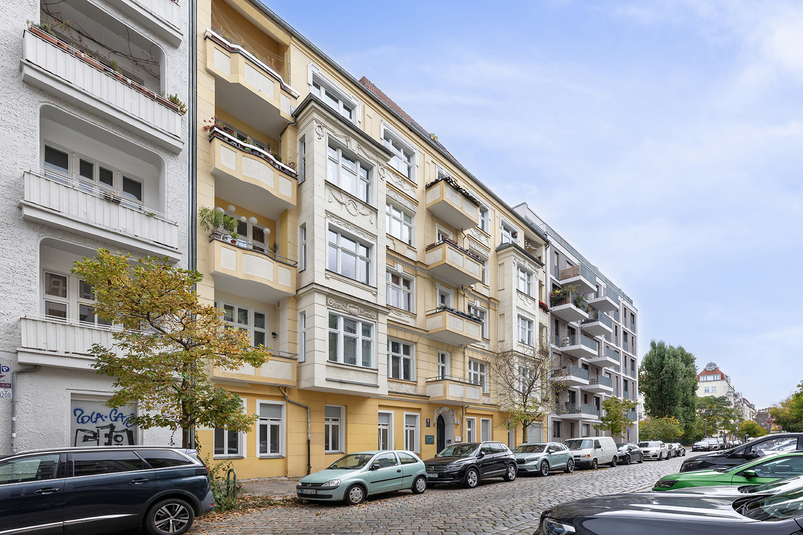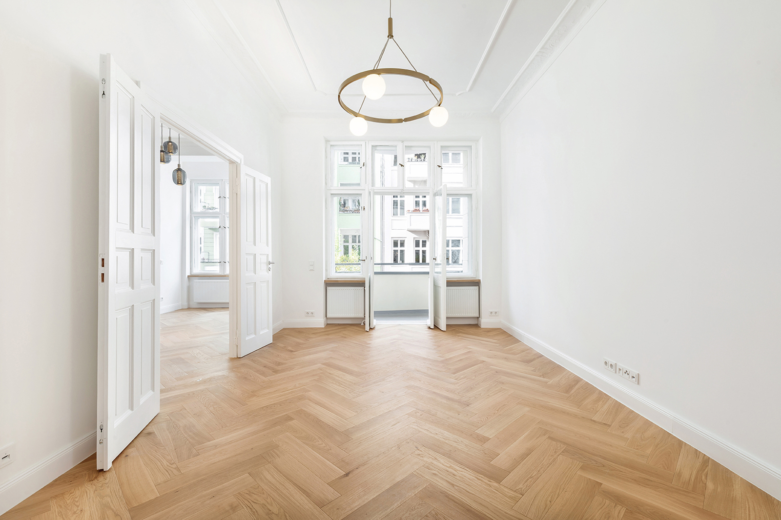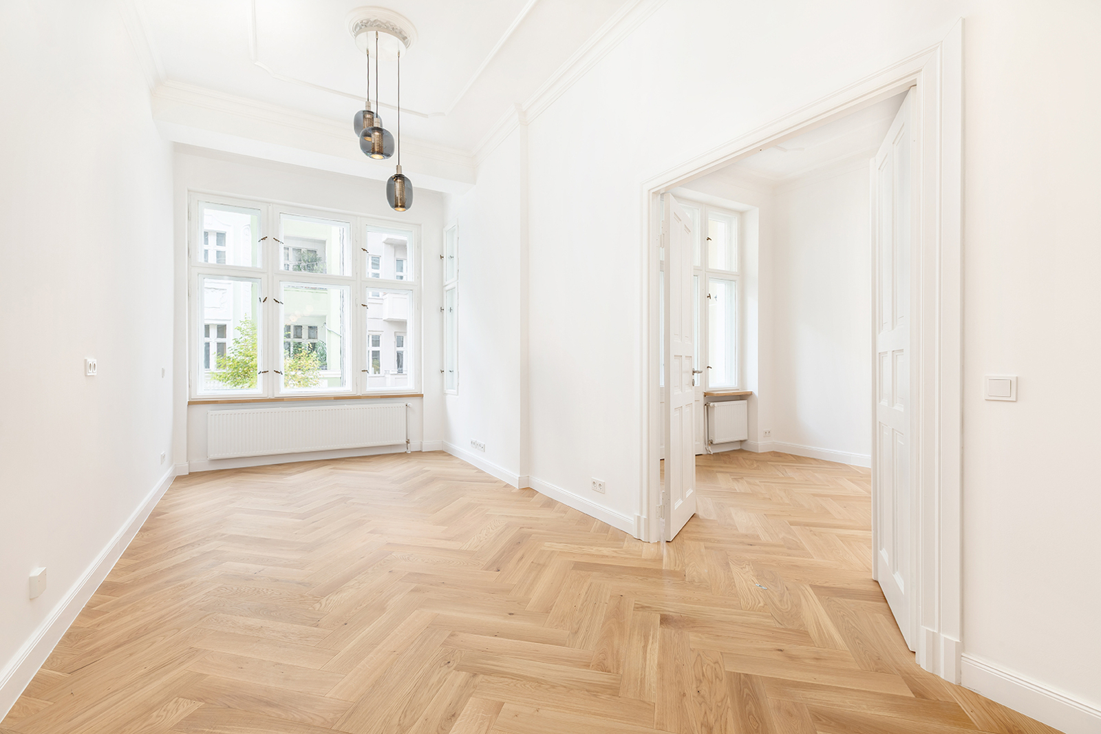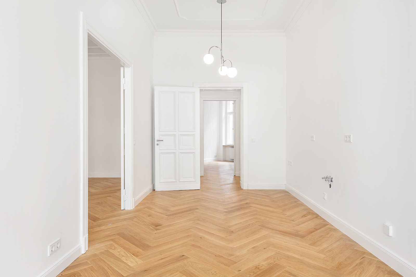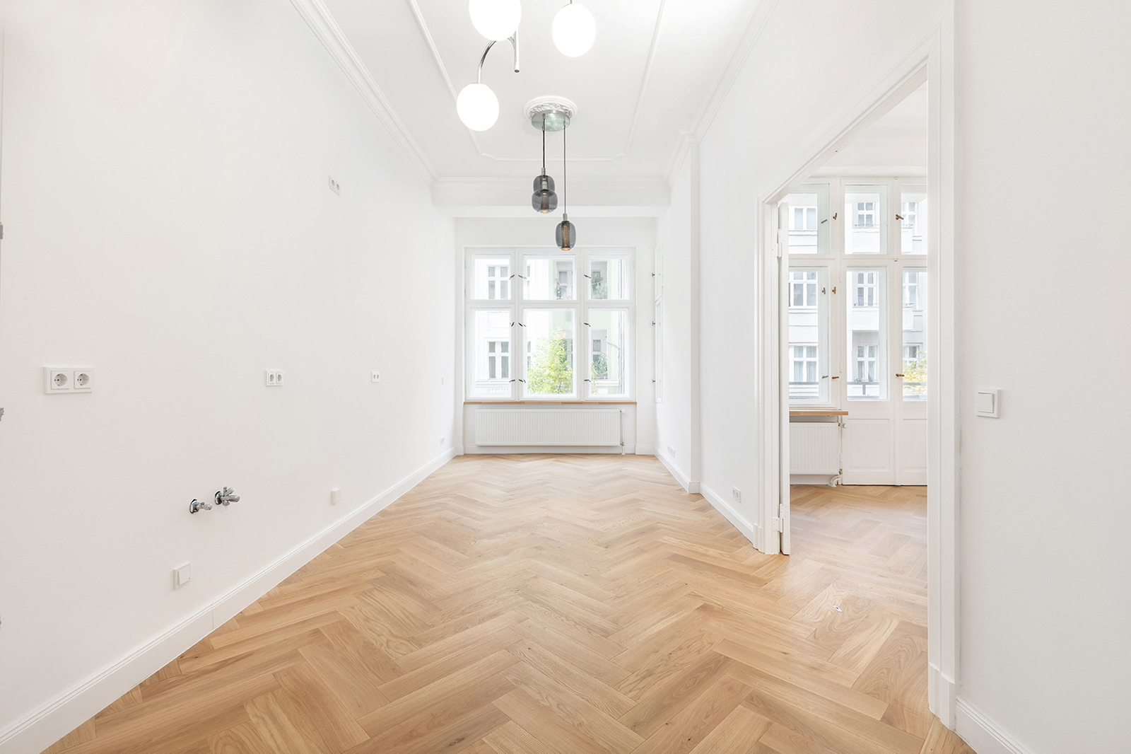 Driesener Straße, Prenzlauer Berg: Renovierte 3-Zimmer-Wohnung mit hohen Decken, Stuck & Balkon Diese stilvolle Altbauwohnung liegt im 1. Obergeschoss des Vorderhauses eines gepflegten Mehrfamilienhauses aus der Jahrhundertwende. Das klassisch gegliederte Gebäude mit Vorderhaus und Seitenflügel wurde 2001 saniert und wird seitdem laufend instand gehalten. Das Gemeinschaftseigentum präsentiert sich entsprechend in einem sehr gepflegten Zustand. Ein Kellerraum gehört zur Wohnung, das Gebäude ist vollständig unterkellert. Die Wohnung selbst verfügt über ca. 95 m², die sich auf Wohnzimmer, 2 Schlafzimmer, Wohn-/Essküche und Wannenbad mit Tageslicht verteilen. Das große Wohnzimmer öffnet sich zum West-Balkon über der ruhigen Anwohnerstraße. Durch eine elegante Flügeltür gelangen wir in die ca. 20 m² große Wohnküche. Hier liegen alle Anschlüsse bereit, so dass Sie direkt Ihre persönliche Wunschküche einbauen können. Zum ruhigen Innenhof gelegen finden wir die 2 Schlafzimmer - eines davon so groß, dass hier bereits ein begehbarer Kleiderschrank abgeteilt wurde. Ein neues, stilvolles Tageslichtbad mit Badewanne und Platz für die Waschmaschine vervollständigt das Bild. Die gesamte Wohnung wurde gerade erst umfangreich renoviert. In allen Räumen liegt helles und elegantes Parkett im Fischgrät-Muster, der Stuck wurde aufgearbeitet, die Elektrik erneuert, alle Innen-Türen durch historisch passende Kassetten-Türen ersetzt. Eine neue Gas-Etagenheizung erfüllt auch moderne Energie-Standards. Die großen Holz-Doppelkasten-Fenster fügen sich ins Bild ein: Eine gelungene Mischung aus moderner Ausstattung und klassischem Stil. Die Wohnung ist kurzfristig bezugsfrei.