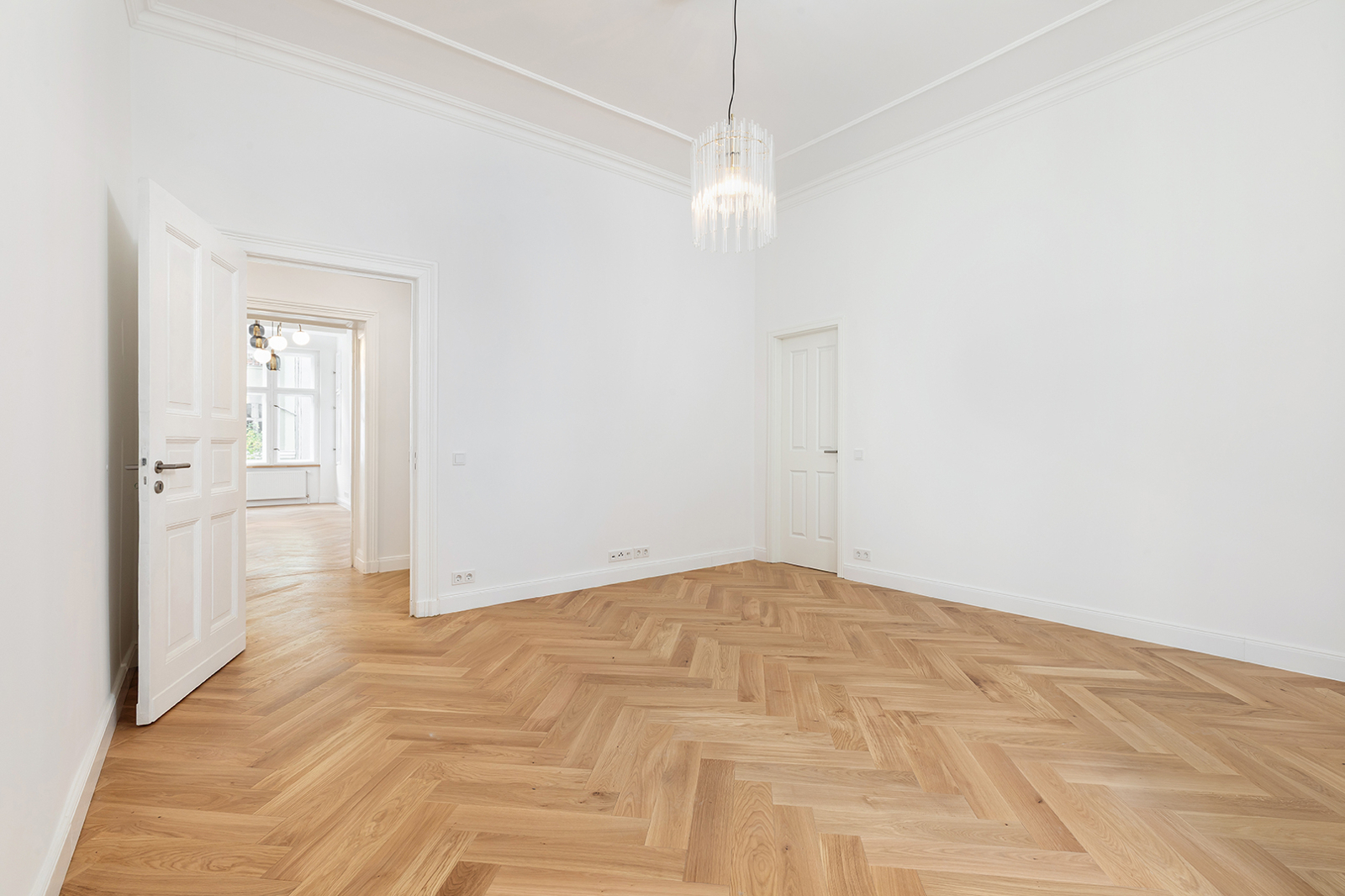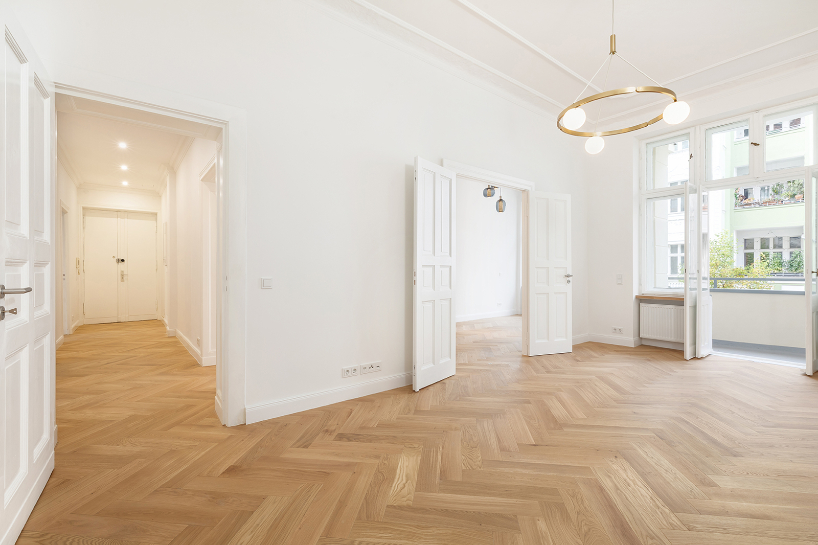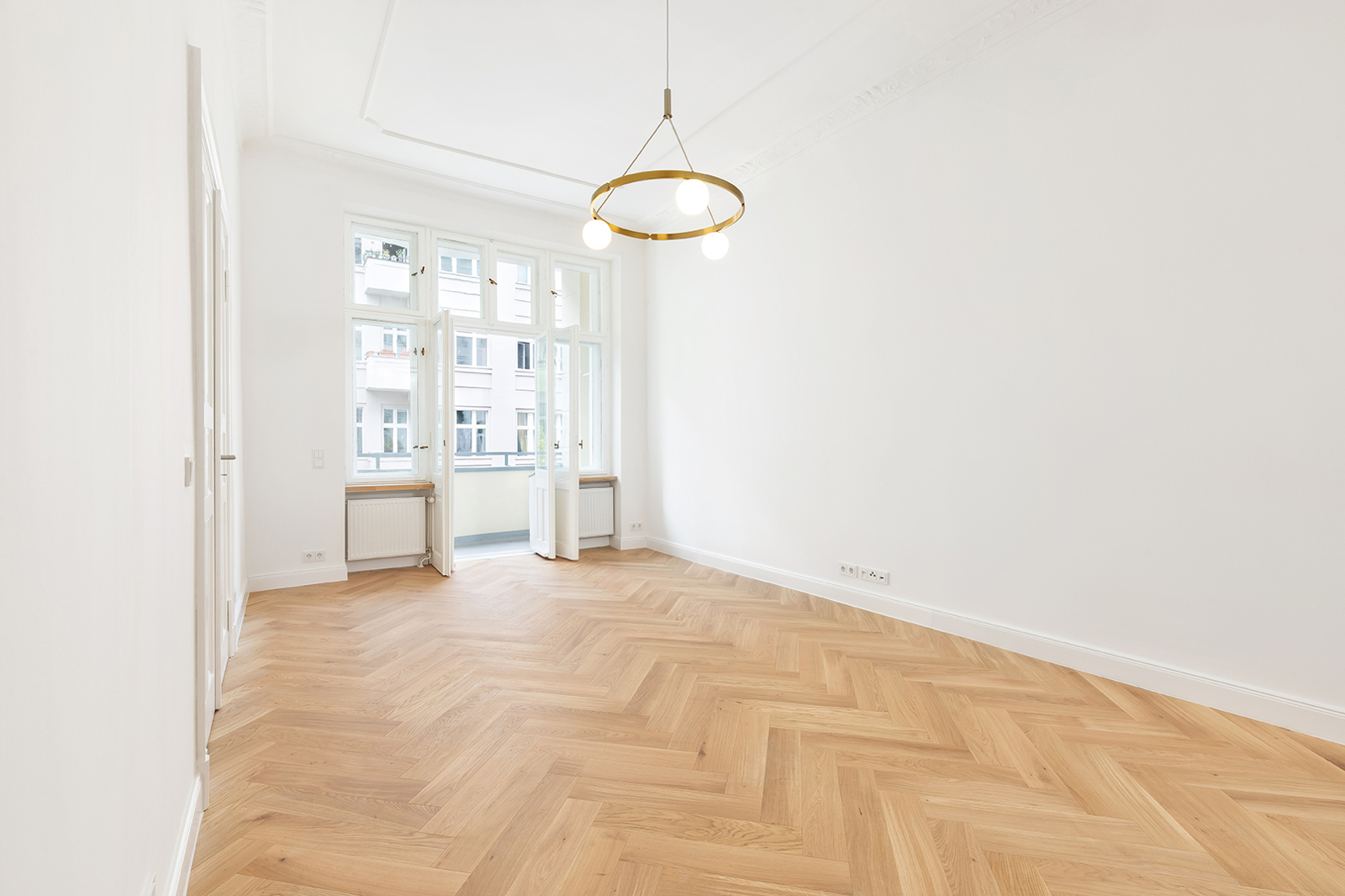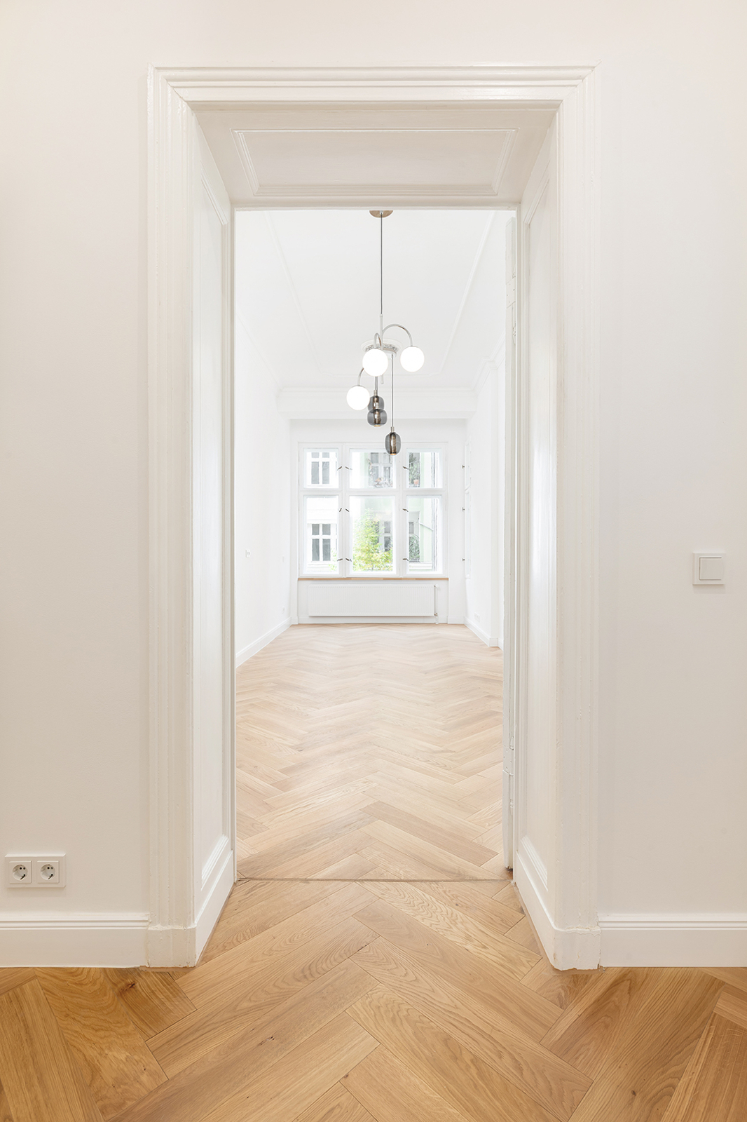 Driesener Straße, Prenzlauer Berg: Renovierte 3-Zimmer-Wohnung mit hohen Decken, Stuck & Balkon Diese stilvolle Altbauwohnung liegt im 1. Obergeschoss des Vorderhauses eines gepflegten Mehrfamilienhauses aus der Jahrhundertwende. Das klassisch gegliederte Gebäude mit Vorderhaus und Seitenflügel wurde 2001 saniert und wird seitdem laufend instand gehalten. Das Gemeinschaftseigentum präsentiert sich entsprechend in einem sehr gepflegten Zustand. Ein Kellerraum gehört zur Wohnung, das Gebäude ist vollständig unterkellert. Die Wohnung selbst verfügt über ca. 95 m², die sich auf Wohnzimmer, 2 Schlafzimmer, Wohn-/Essküche und Wannenbad mit Tageslicht verteilen. Das große Wohnzimmer öffnet sich zum West-Balkon über der ruhigen Anwohnerstraße. Durch eine elegante Flügeltür gelangen wir in die ca. 20 m² große Wohnküche. Hier liegen alle Anschlüsse bereit, so dass Sie direkt Ihre persönliche Wunschküche einbauen können. Zum ruhigen Innenhof gelegen finden wir die 2 Schlafzimmer - eines davon so groß, dass hier bereits ein begehbarer Kleiderschrank abgeteilt wurde. Ein neues, stilvolles Tageslichtbad mit Badewanne und Platz für die Waschmaschine vervollständigt das Bild. Die gesamte Wohnung wurde gerade erst umfangreich renoviert. In allen Räumen liegt helles und elegantes Parkett im Fischgrät-Muster, der Stuck wurde aufgearbeitet, die Elektrik erneuert, alle Innen-Türen durch historisch passende Kassetten-Türen ersetzt. Eine neue Gas-Etagenheizung erfüllt auch moderne Energie-Standards. Die großen Holz-Doppelkasten-Fenster fügen sich ins Bild ein: Eine gelungene Mischung aus moderner Ausstattung und klassischem Stil. Die Wohnung ist kurzfristig bezugsfrei.