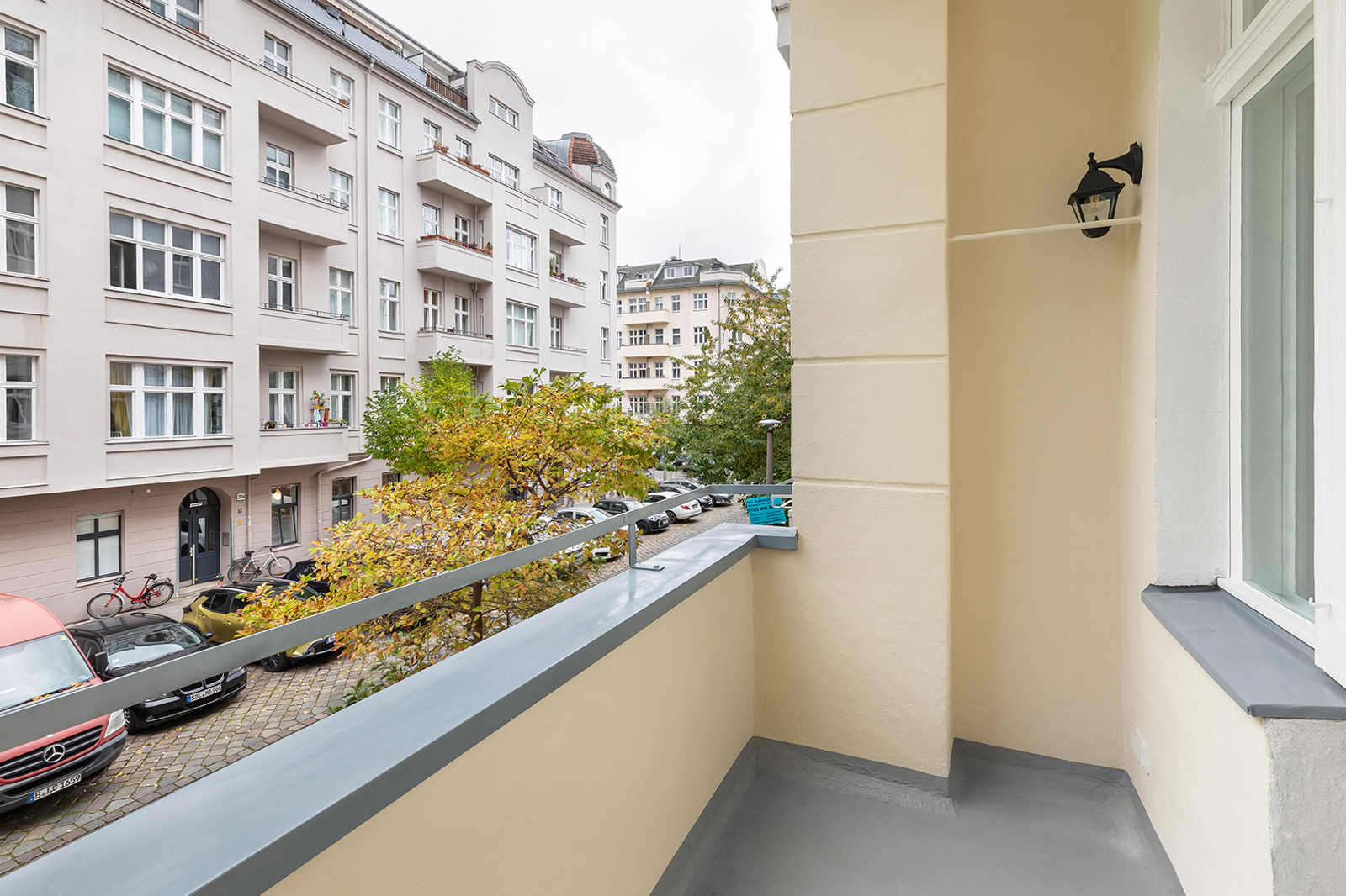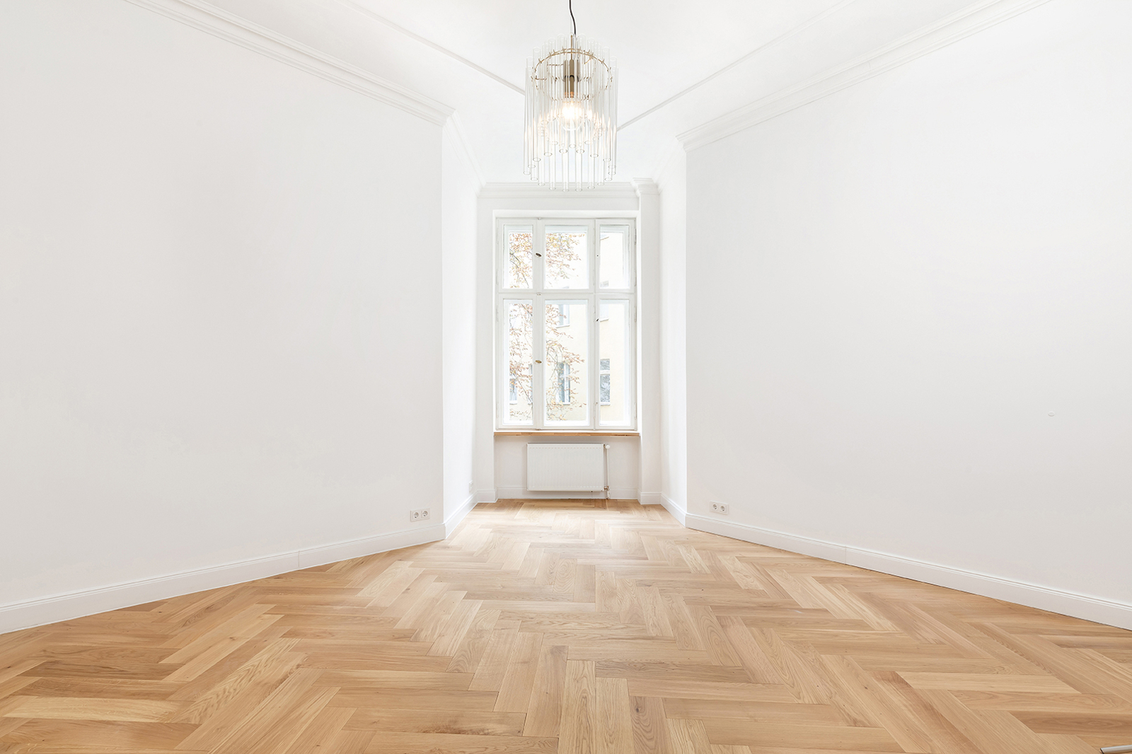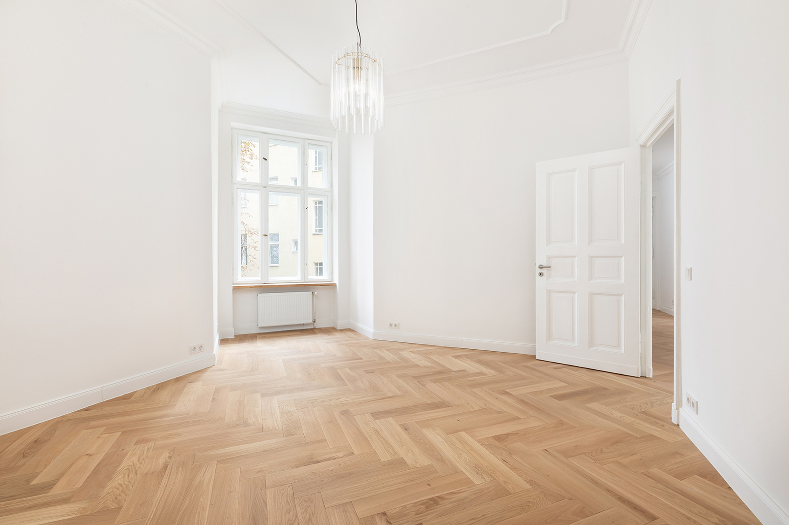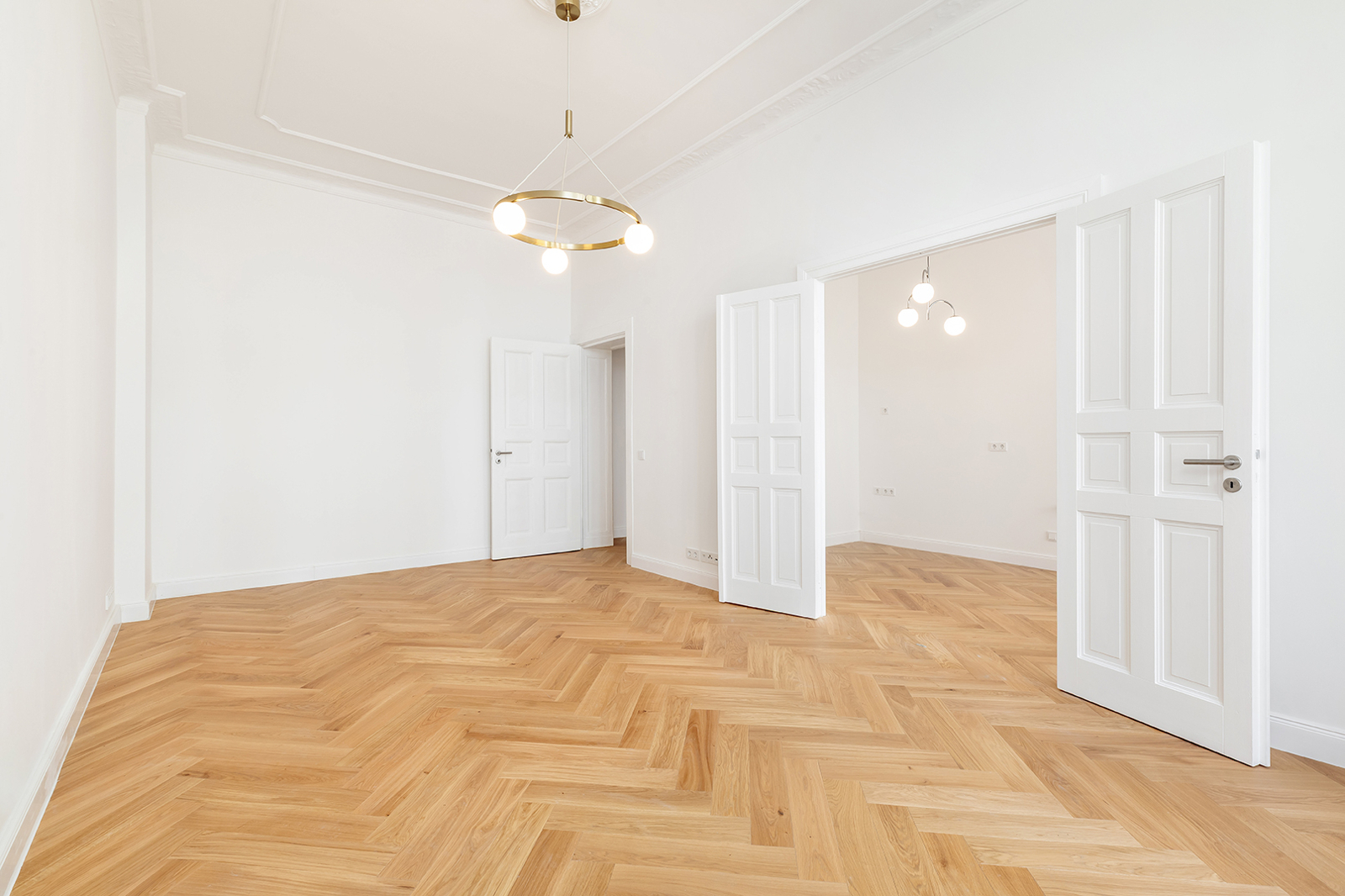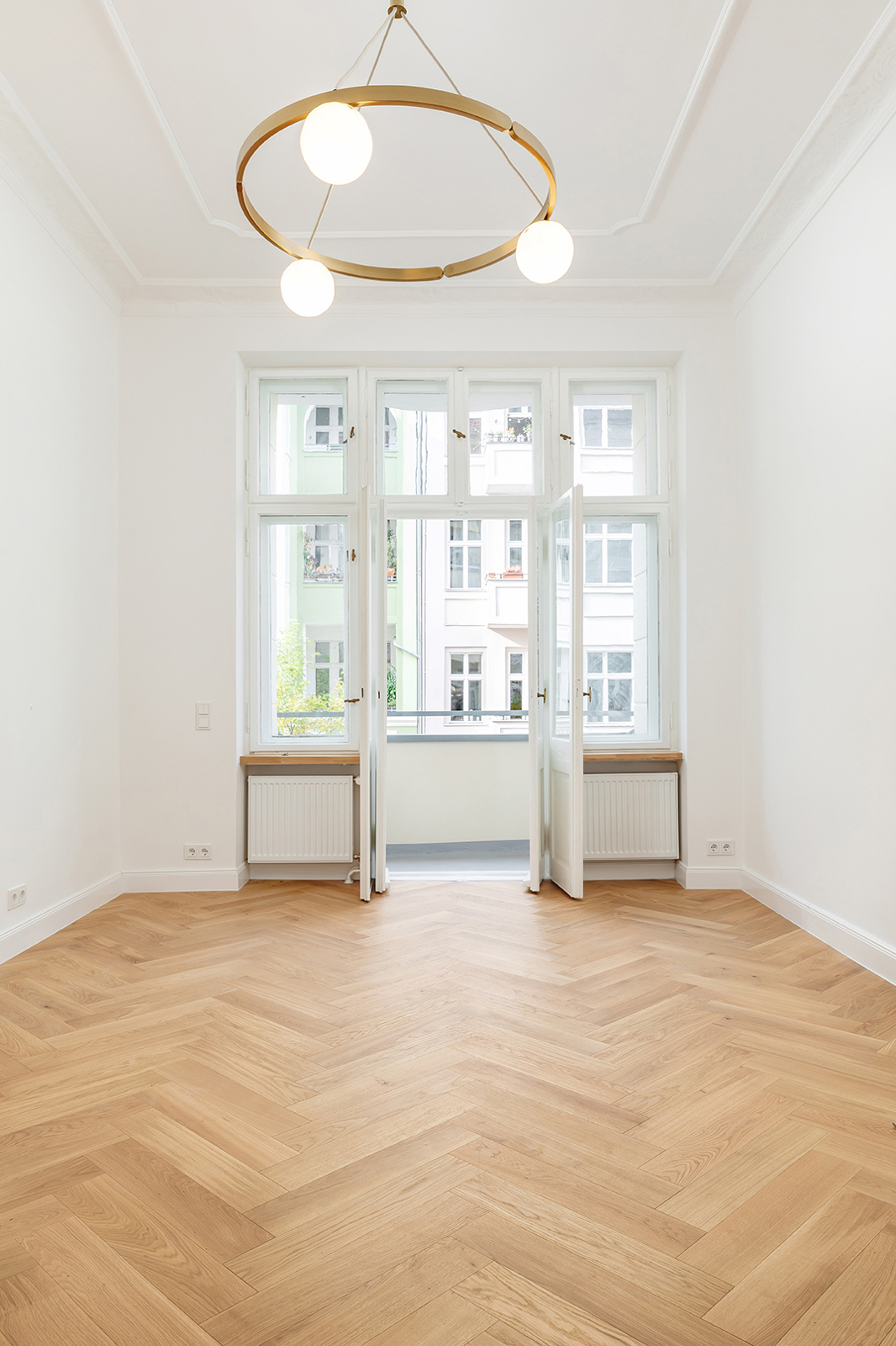 Driesener Straße, Prenzlauer Berg: Renovierte 3-Zimmer-Wohnung mit hohen Decken, Stuck & Balkon Diese stilvolle Altbauwohnung liegt im 1. Obergeschoss des Vorderhauses eines gepflegten Mehrfamilienhauses aus der Jahrhundertwende. Das klassisch gegliederte Gebäude mit Vorderhaus und Seitenflügel wurde 2001 saniert und wird seitdem laufend instand gehalten. Das Gemeinschaftseigentum präsentiert sich entsprechend in einem sehr gepflegten Zustand. Ein Kellerraum gehört zur Wohnung, das Gebäude ist vollständig unterkellert. Die Wohnung selbst verfügt über ca. 95 m², die sich auf Wohnzimmer, 2 Schlafzimmer, Wohn-/Essküche und Wannenbad mit Tageslicht verteilen. Das große Wohnzimmer öffnet sich zum West-Balkon über der ruhigen Anwohnerstraße. Durch eine elegante Flügeltür gelangen wir in die ca. 20 m² große Wohnküche. Hier liegen alle Anschlüsse bereit, so dass Sie direkt Ihre persönliche Wunschküche einbauen können. Zum ruhigen Innenhof gelegen finden wir die 2 Schlafzimmer - eines davon so groß, dass hier bereits ein begehbarer Kleiderschrank abgeteilt wurde. Ein neues, stilvolles Tageslichtbad mit Badewanne und Platz für die Waschmaschine vervollständigt das Bild. Die gesamte Wohnung wurde gerade erst umfangreich renoviert. In allen Räumen liegt helles und elegantes Parkett im Fischgrät-Muster, der Stuck wurde aufgearbeitet, die Elektrik erneuert, alle Innen-Türen durch historisch passende Kassetten-Türen ersetzt. Eine neue Gas-Etagenheizung erfüllt auch moderne Energie-Standards. Die großen Holz-Doppelkasten-Fenster fügen sich ins Bild ein: Eine gelungene Mischung aus moderner Ausstattung und klassischem Stil. Die Wohnung ist kurzfristig bezugsfrei.