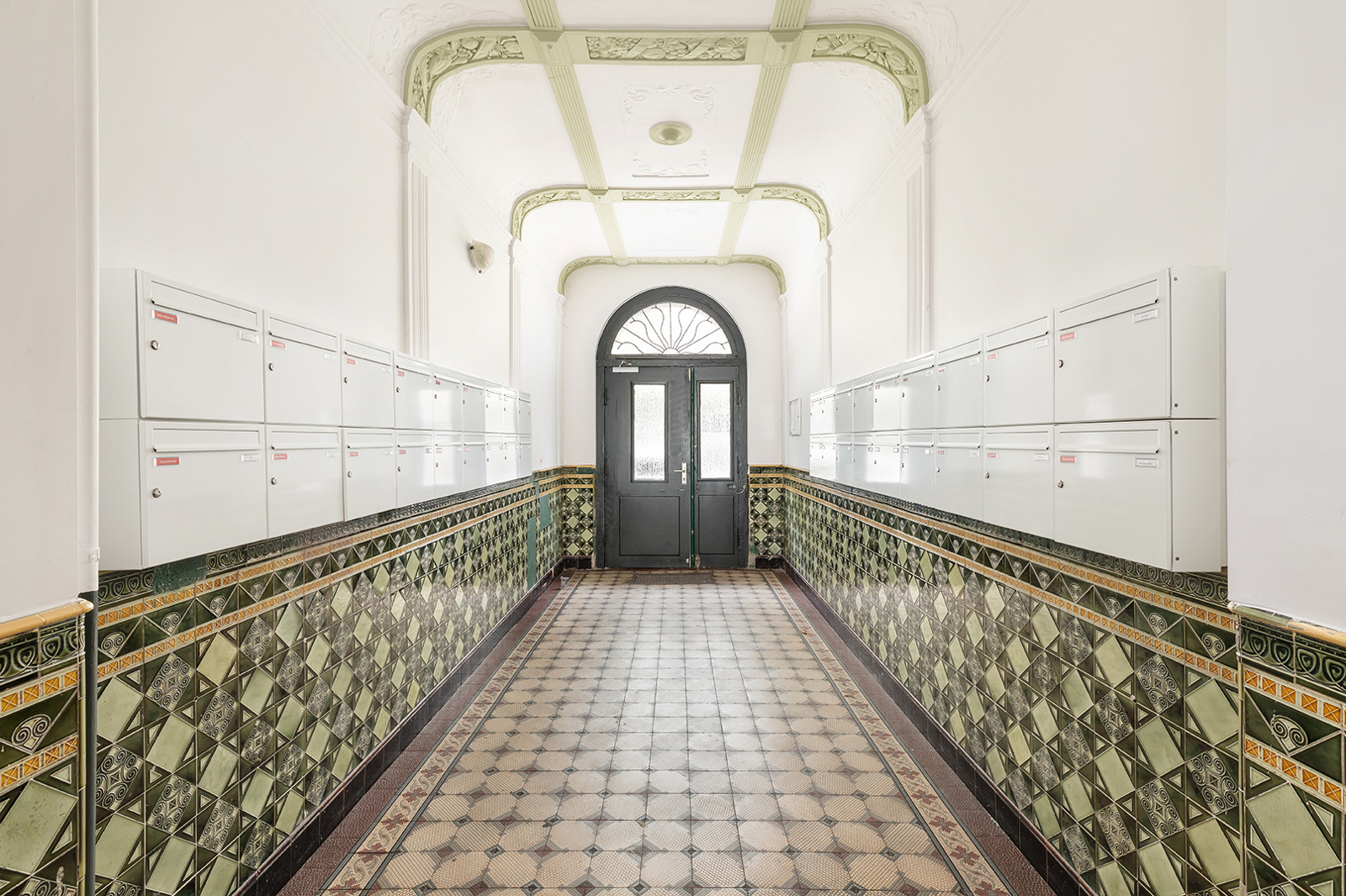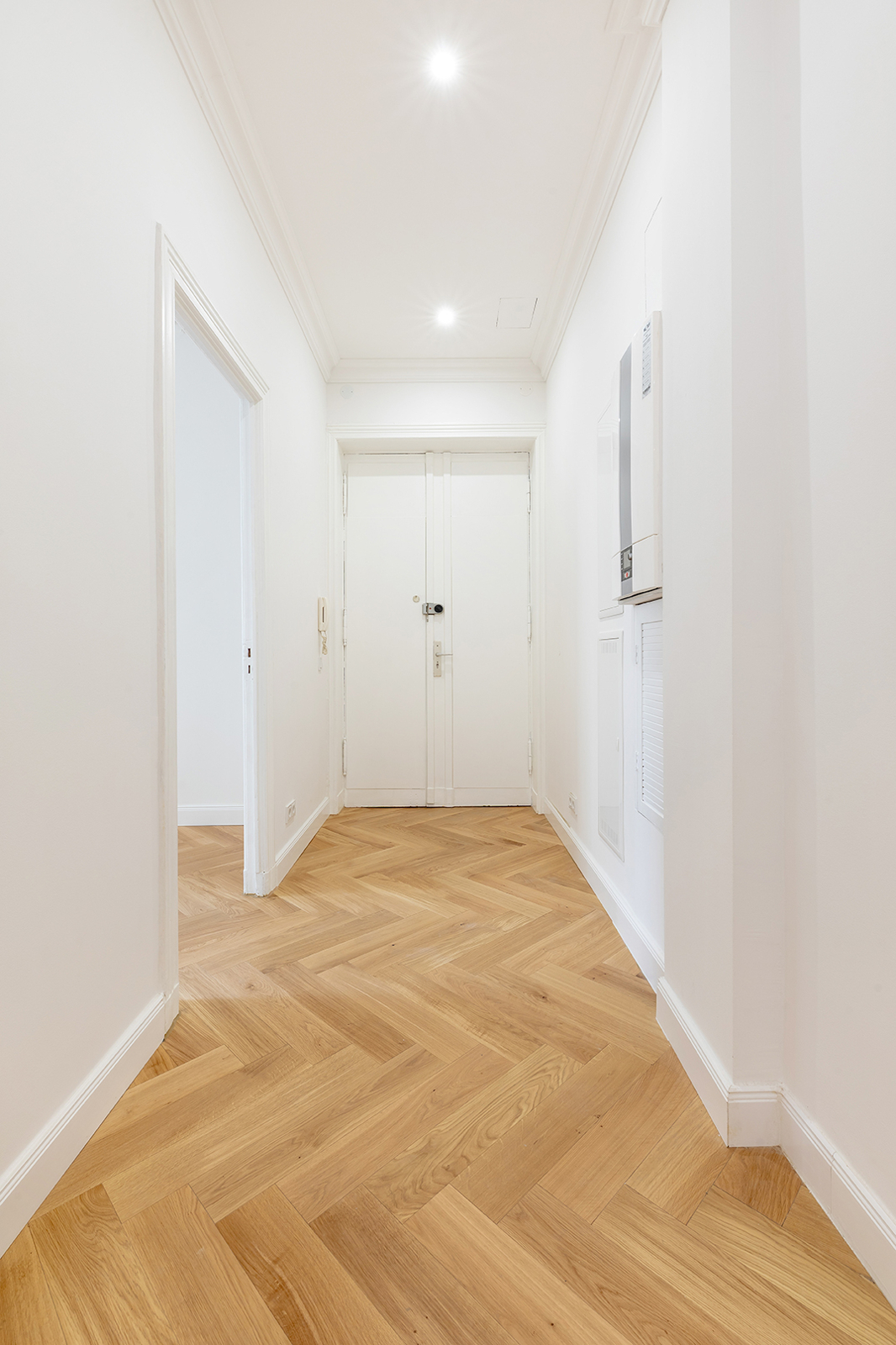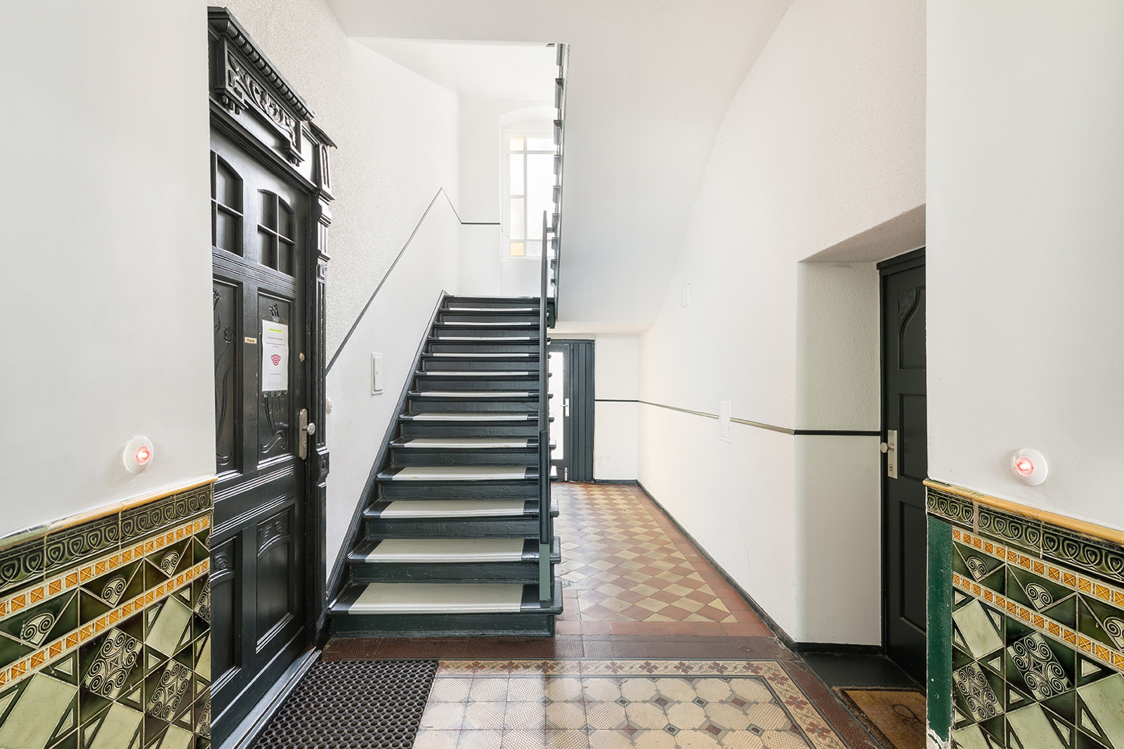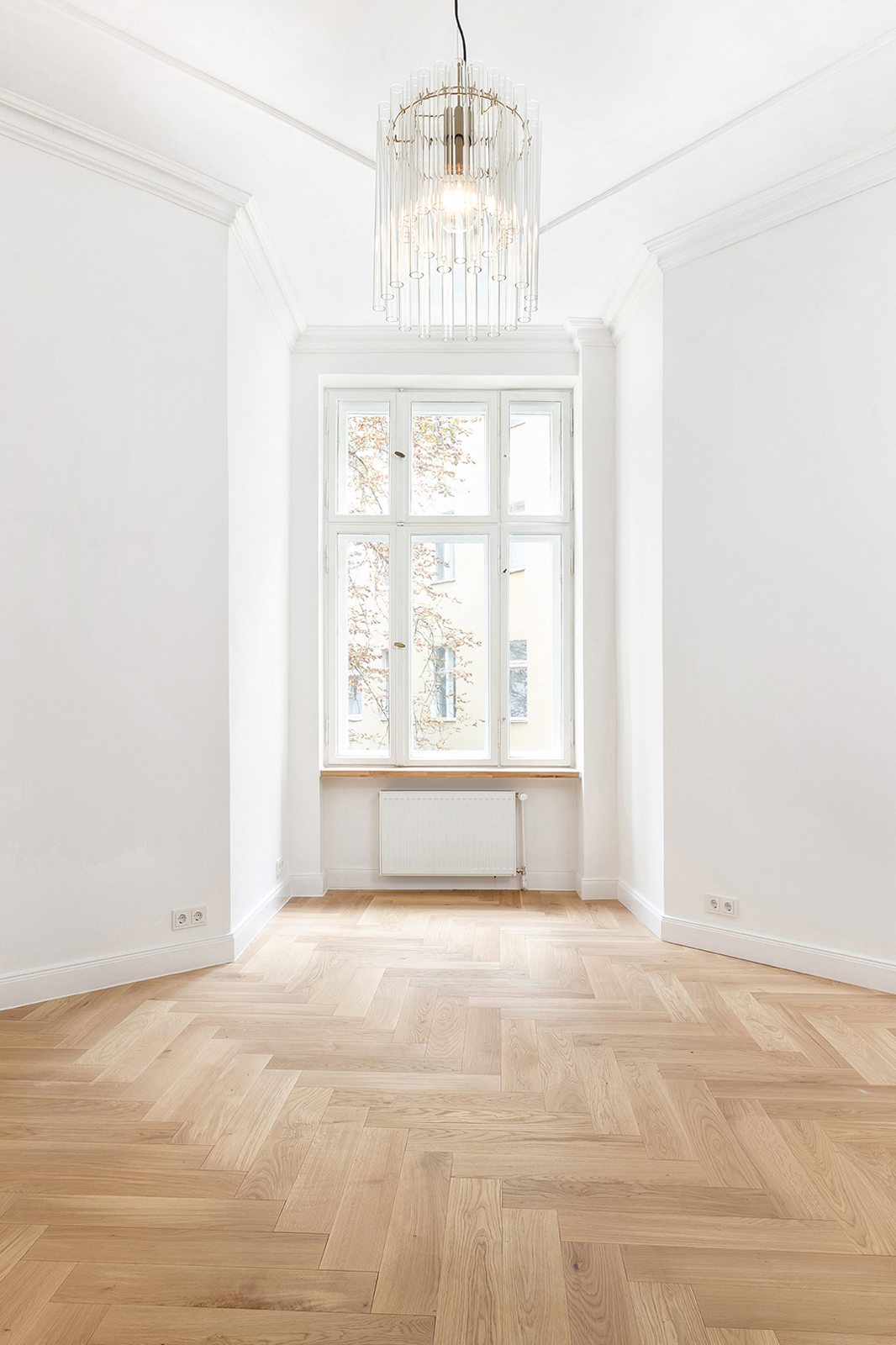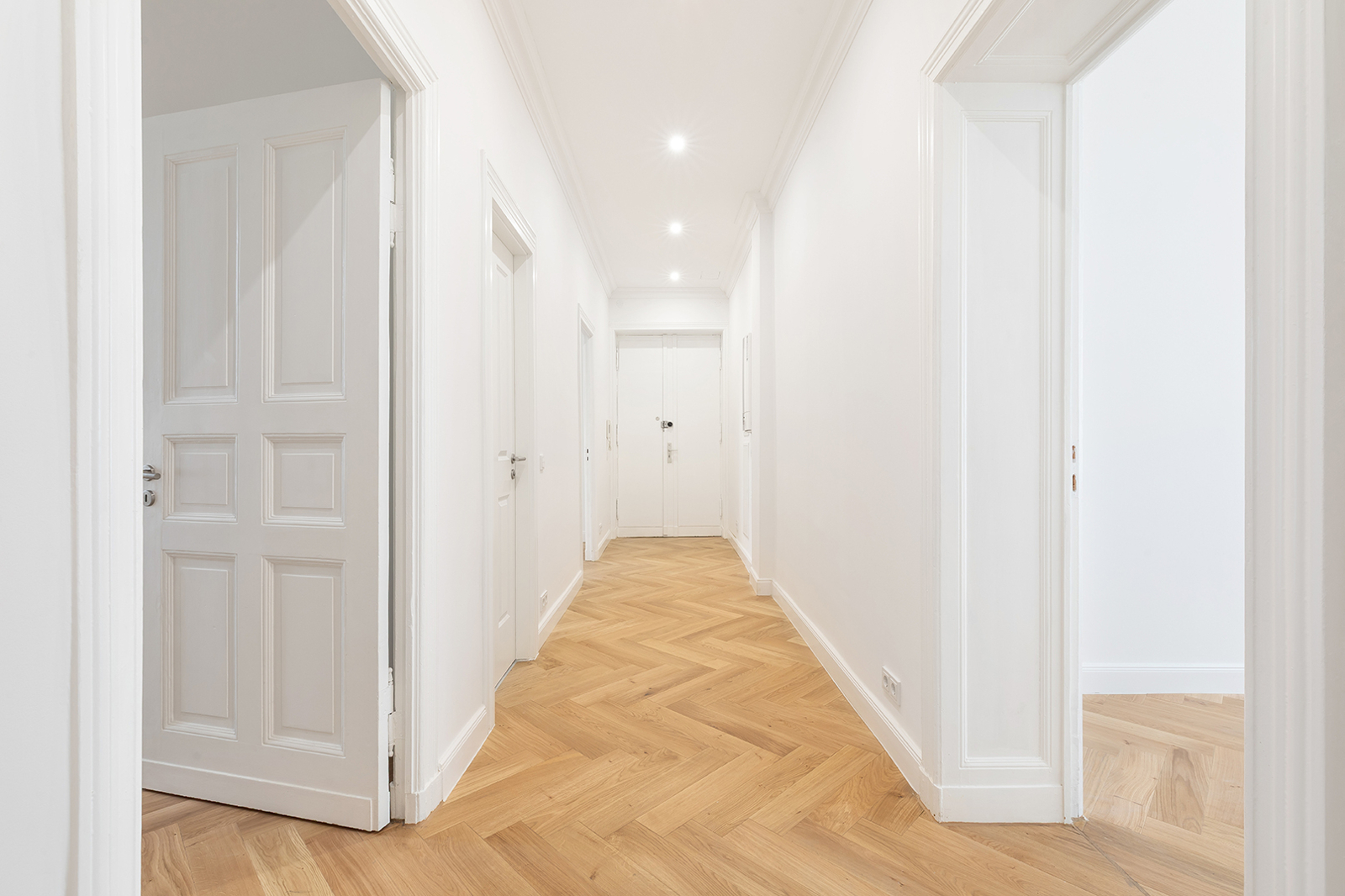 Driesener Straße, Prenzlauer Berg: Renovierte 3-Zimmer-Wohnung mit hohen Decken, Stuck & Balkon Diese stilvolle Altbauwohnung liegt im 1. Obergeschoss des Vorderhauses eines gepflegten Mehrfamilienhauses aus der Jahrhundertwende. Das klassisch gegliederte Gebäude mit Vorderhaus und Seitenflügel wurde 2001 saniert und wird seitdem laufend instand gehalten. Das Gemeinschaftseigentum präsentiert sich entsprechend in einem sehr gepflegten Zustand. Ein Kellerraum gehört zur Wohnung, das Gebäude ist vollständig unterkellert. Die Wohnung selbst verfügt über ca. 95 m², die sich auf Wohnzimmer, 2 Schlafzimmer, Wohn-/Essküche und Wannenbad mit Tageslicht verteilen. Das große Wohnzimmer öffnet sich zum West-Balkon über der ruhigen Anwohnerstraße. Durch eine elegante Flügeltür gelangen wir in die ca. 20 m² große Wohnküche. Hier liegen alle Anschlüsse bereit, so dass Sie direkt Ihre persönliche Wunschküche einbauen können. Zum ruhigen Innenhof gelegen finden wir die 2 Schlafzimmer - eines davon so groß, dass hier bereits ein begehbarer Kleiderschrank abgeteilt wurde. Ein neues, stilvolles Tageslichtbad mit Badewanne und Platz für die Waschmaschine vervollständigt das Bild. Die gesamte Wohnung wurde gerade erst umfangreich renoviert. In allen Räumen liegt helles und elegantes Parkett im Fischgrät-Muster, der Stuck wurde aufgearbeitet, die Elektrik erneuert, alle Innen-Türen durch historisch passende Kassetten-Türen ersetzt. Eine neue Gas-Etagenheizung erfüllt auch moderne Energie-Standards. Die großen Holz-Doppelkasten-Fenster fügen sich ins Bild ein: Eine gelungene Mischung aus moderner Ausstattung und klassischem Stil. Die Wohnung ist kurzfristig bezugsfrei.
