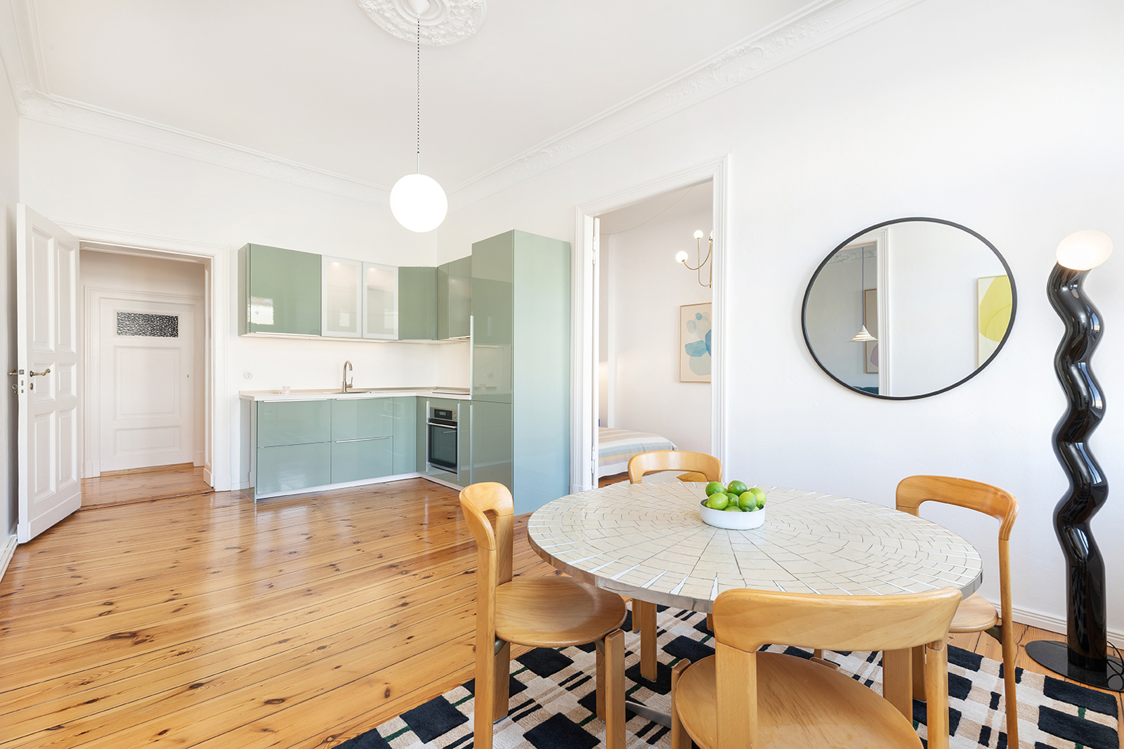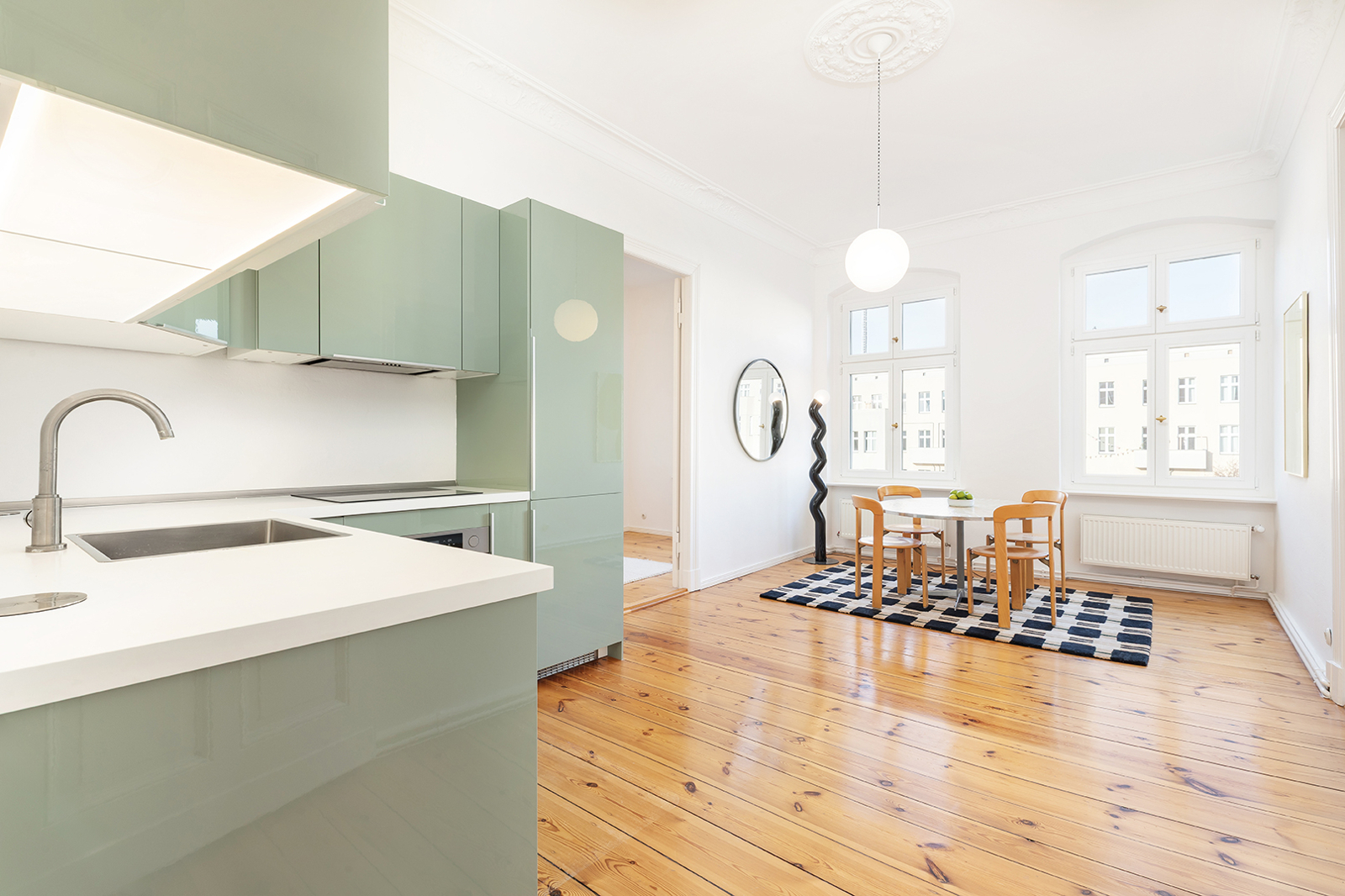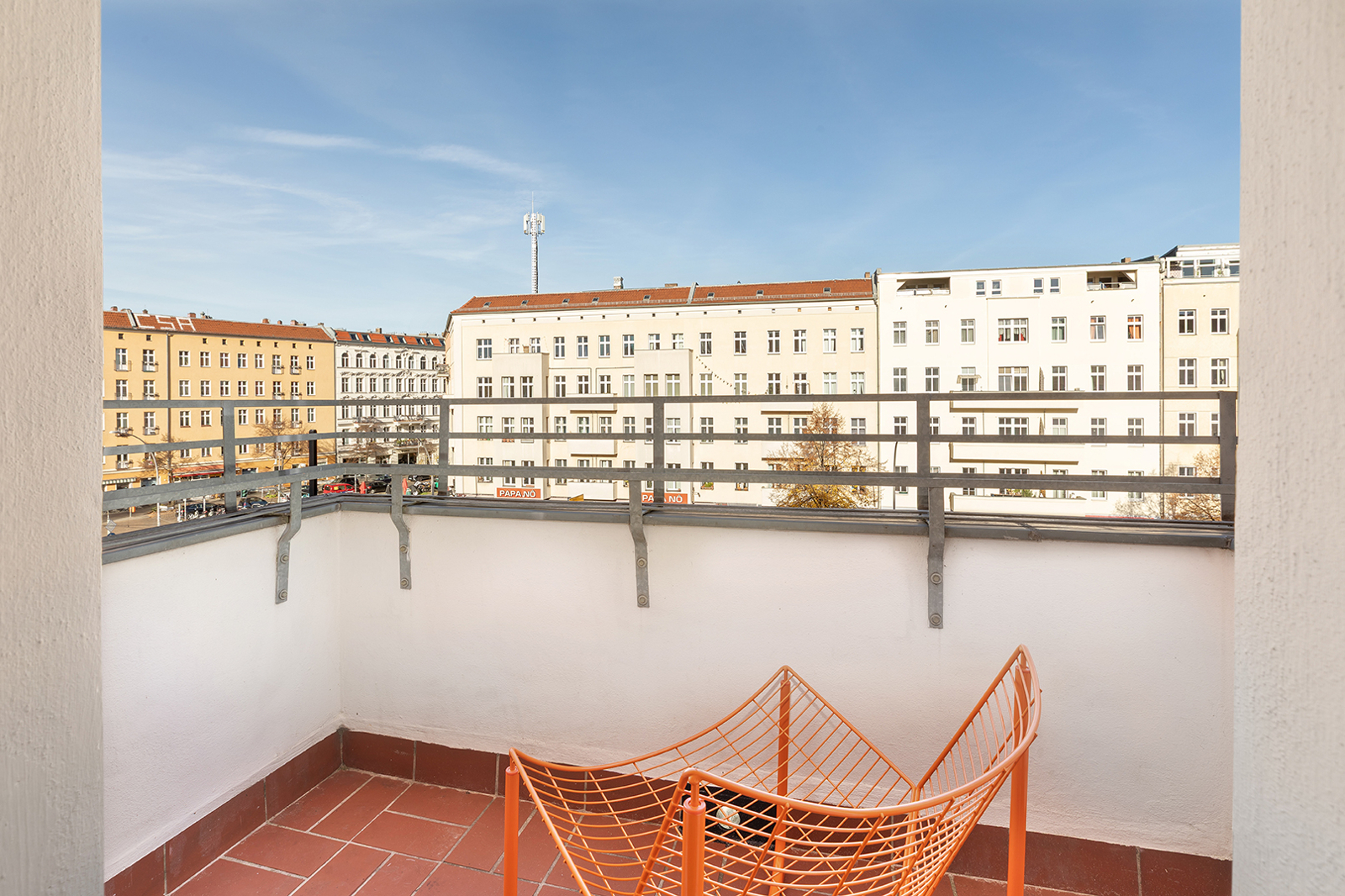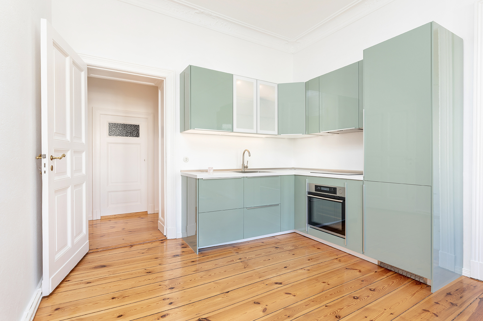 Zwischen Kollwitz- und Helmholzkiez: Zauberhafte Altbauwohnung, 3 Zimmer + Wohnküche, Kachelofen, Balkon, Lift Das um 1895 errichtete Eckhaus befindet sich an der Danziger Straße / Ecke Knaackstraße und liegt damit an der Schwelle zwischen Kollwitz- und Helmholtzkiez. Das Gemeinschaftseigentum präsentiert sich in sehr gepflegtem Zustand und wird laufend instand gehalten; das Dachgeschoss wurde zu Wohnzwecken ausgebaut. Der mit Bäumen bepflanzte Innenhof bietet ausreichend Fahrradstellplätze. Die hier angebotene Wohnung liegt im dritten Obergeschoss des Vorderhauses und ist bequem mit dem Fahrstuhl erreichbar, der auf halber Treppe hält. Auf rund 92 m² überzeugt sie durch eine durchdachte Raumaufteilung mit einer Wohnküche, drei separaten Zimmern sowie einem Tageslichtbad. Originale Altbautüren, aufgearbeitete Dielenböden und imposante Deckenhöhen mit Stuckverzierungen verleihen der Wohnung ihren unverwechselbaren Altbaucharme. Zentrum der Wohnung ist die Wohnküche mit ihrer in dezenten Grüntönen gehaltenen, gepflegten Einbauküche, die vollständig ausgestattet ist und im Kaufpreis enthalten bleibt. Rechts anschließend gelangt man über eine elegante Flügeltür in das helle Wohnzimmer mit Zugang zum Balkon, der einen weiten Blick in die Straßenschlucht eröffnet. Der funktionsfähige, weiß geflieste Kachelofen sorgt hier für eine behagliche Atmosphäre. Das links von der Wohnküche gelegene Zimmer eignet sich ideal als Schlaf-, Arbeits- oder Kinderzimmer. Freigelegtes Mauerwerk verleiht dem Raum einen besonderen Charakter. Wohnküche sowie die beiden benachbarten Zimmer sind zur Danziger Straße ausgerichtet und genießen eine herrliche Weitsicht bei außergewöhnlicher Helligkeit. In allen drei Räumen wurden 2016 hochwertige Holzfenster mit Schallschutzverglasung eingebaut, die für besonderen Wohnkomfort sorgen. Zum ruhigen Innenhof hin befindet sich das zweite Schlafzimmer, das ausreichend Platz für ein Doppelbett und einen großen Schrank bietet. Das Tageslichtbad mit Dusche, WC und Waschbecken ist in freundlichen Blautönen gefliest und fügt sich harmonisch in das Gesamtbild der Wohnung ein. Ein praktischer Abstellraum, der über den Flur erreichbar ist, bietet zusätzliche Staufläche und einen Waschmaschinenanschluss. Zur Wohnung gehört ein Keller; die Wohnung ist kurzfristig bezugsfrei.