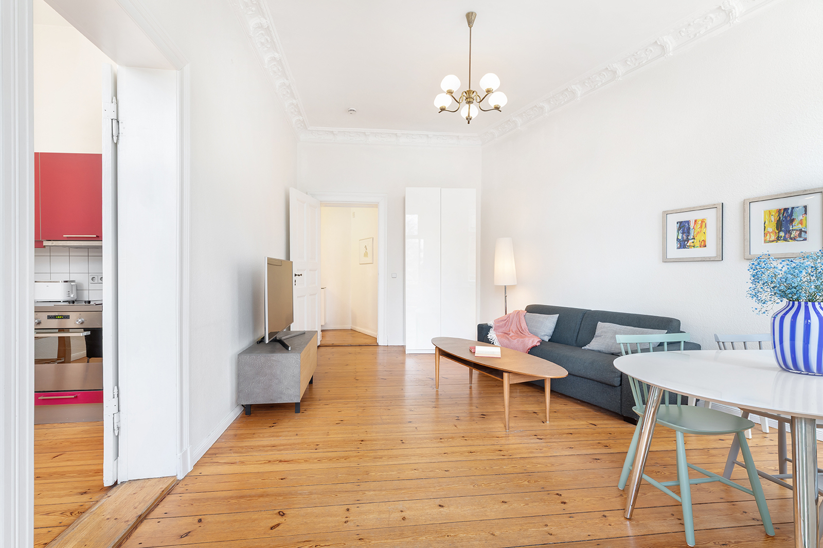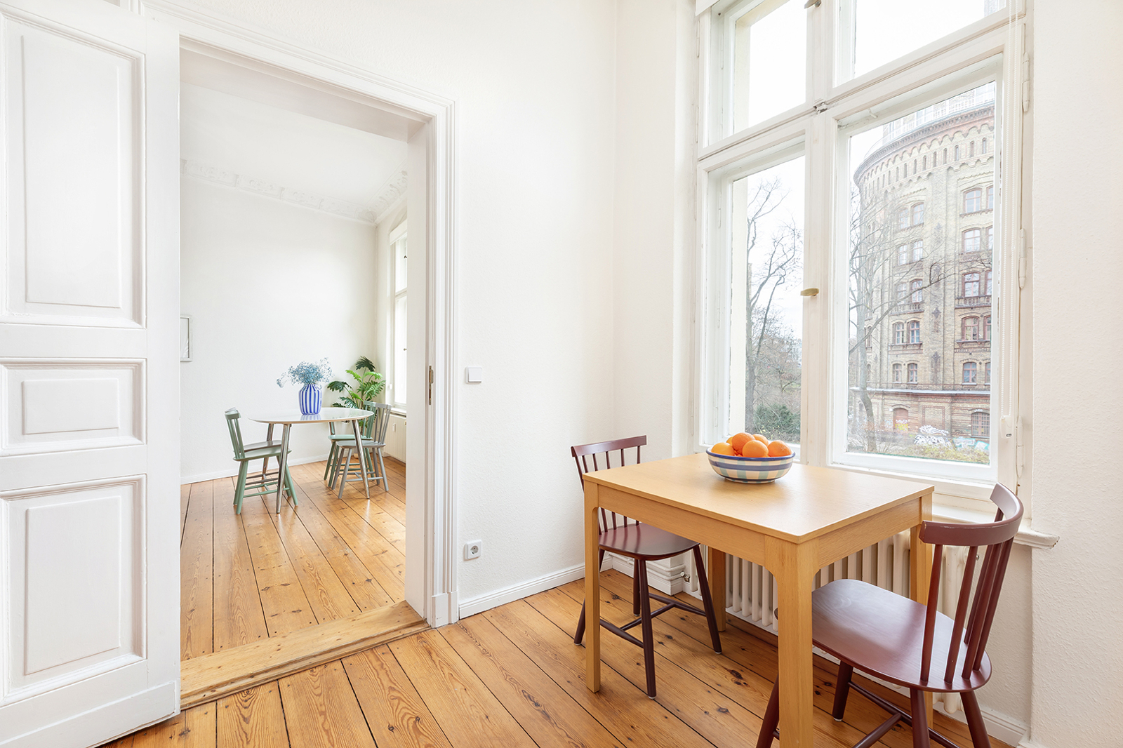 Blick auf den Wasserturm, Prenzlauer Berg: Einzigartige 2 Zimmer-Altbauwohnung mit Süd-Balkon, Dielen, Aufzug Das sehr gepflegte Mehrfamilienhaus wurde um die Jahrhundertwende errichtet und vor wenigen Jahren umfassend saniert. Es wird über zwei Eingänge erschlossen und gliedert sich in Vorder- und Gartenhaus. Im Zuge der Sanierung wurde zudem ein Aufzug angebaut, der Sie komfortabel zu Ihrer Wohnung im 2. Obergeschoss bringt. Die Wohnung verfügt über zwei Zimmer, eine separate Küche, ein innenliegendes Bad sowie einen Balkon mit traumhaftem Südblick direkt auf den bekannten Wasserturm. In der gesamten Wohnung unterstreichen klassische Altbaudetails wie Stuck, Dielenboden, Kassettentüren, Holz-Doppelkastenfenster und hohe Decken den besonderen Charme dieser Immobilie. Das knapp 22 m² große, nach Süden ausgerichtete Wohnzimmer präsentiert sich hell und freundlich und bietet direkten Zugang zum Balkon. Angrenzend befindet sich die Küche, die sich über eine Tür flexibel zum Wohnbereich hin öffnen oder separat nutzen lässt. Die Küche ist mit Einbaugeräten und -schränken ausgestattet und bietet ausreichend Platz für eine kleine Essecke. Wohnzimmer, Küche und Balkon eröffnen gemeinsam einen beeindruckenden, unverbaubaren Blick auf den Wasserturm. Dank der idealen Ausrichtung und Weitsicht sind beide Räume äußerst lichtdurchflutet. Das Schlafzimmer ist zum ruhigen Innenhof ausgerichtet und bietet beste Voraussetzungen für erholsamen Schlaf. Das innenliegende, weiß geflieste Badezimmer ist mit einer Badewanne ausgestattet. Ein separater Kellerraum sorgt für zusätzlichen Stauraum. Die Wohnung ist nach Absprache bezugsfrei.