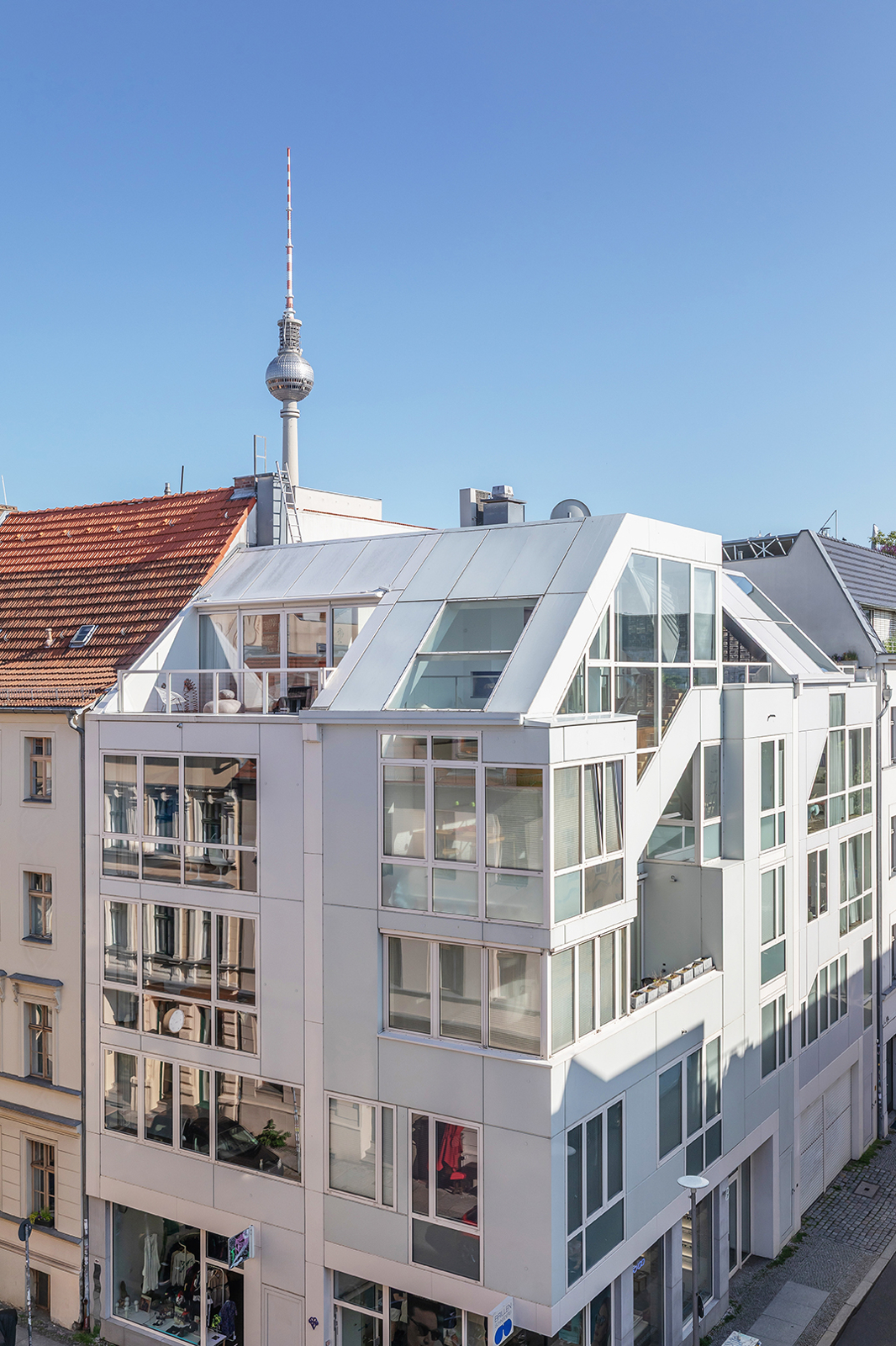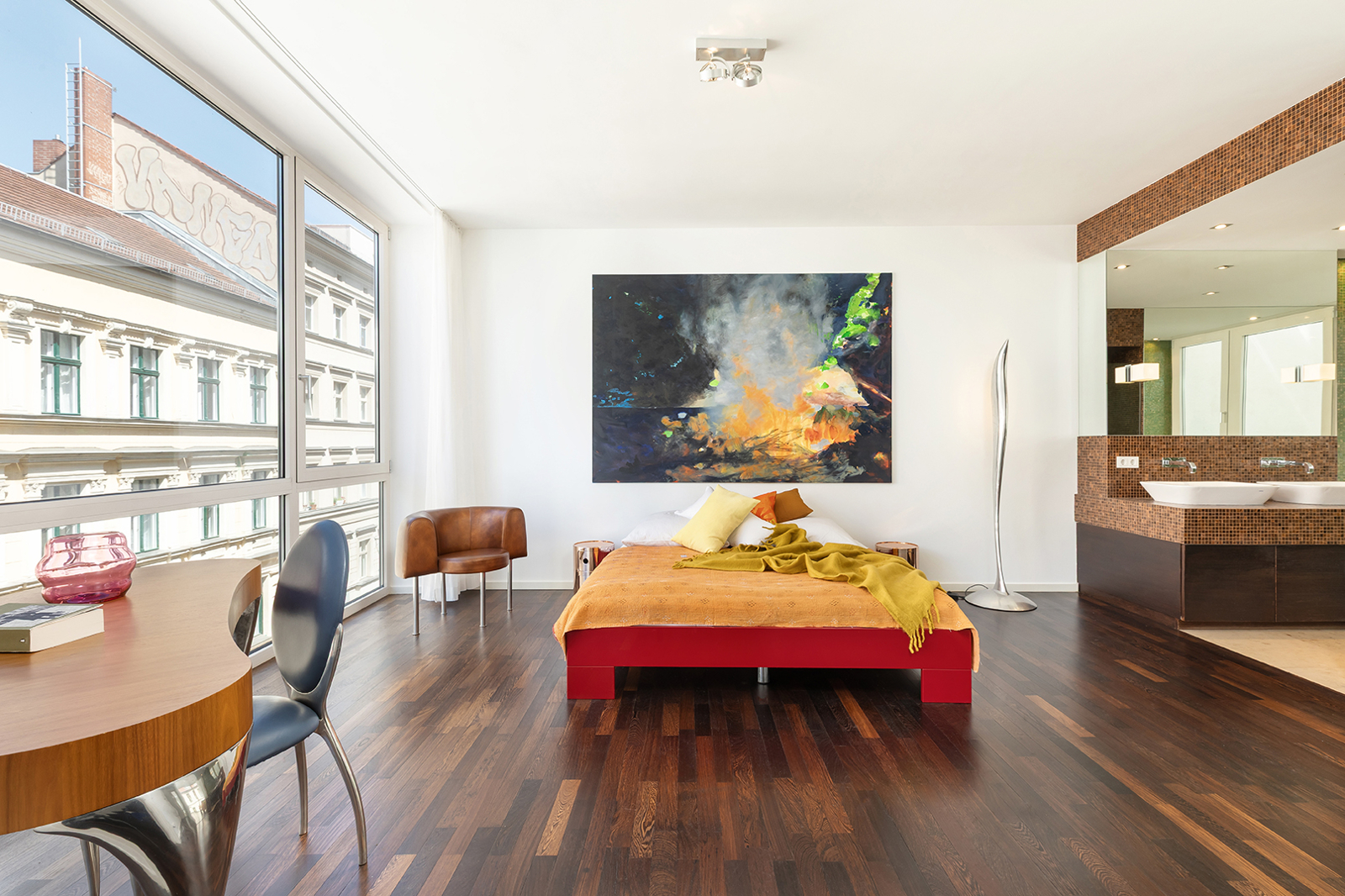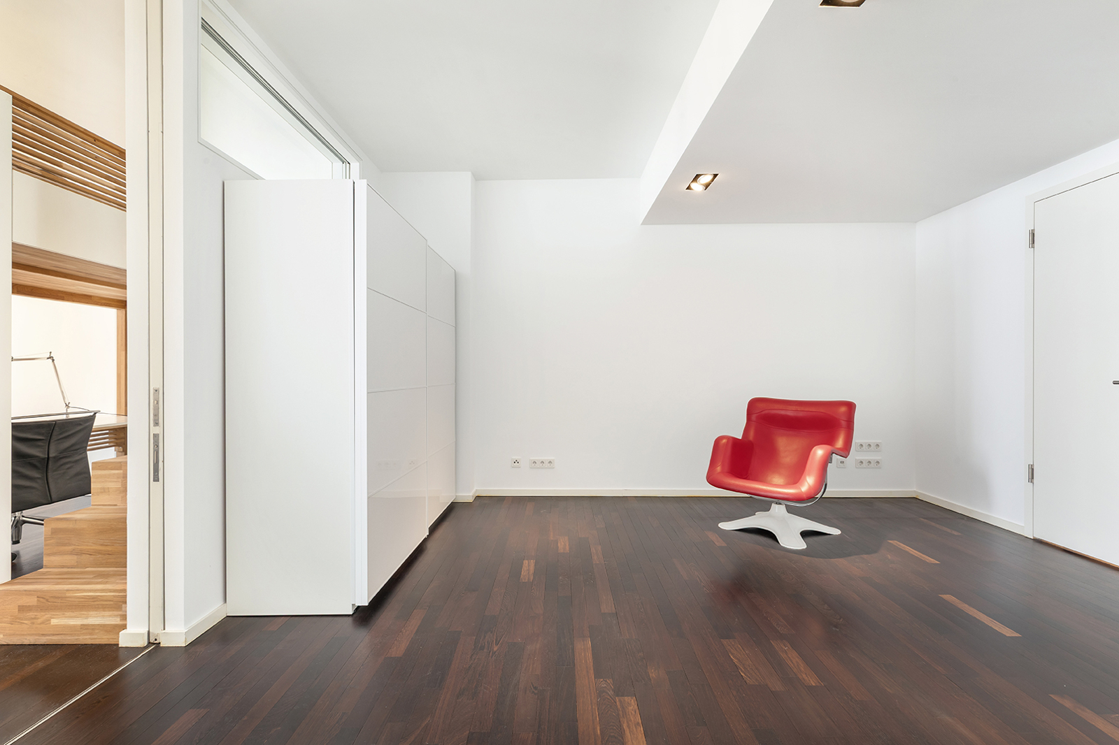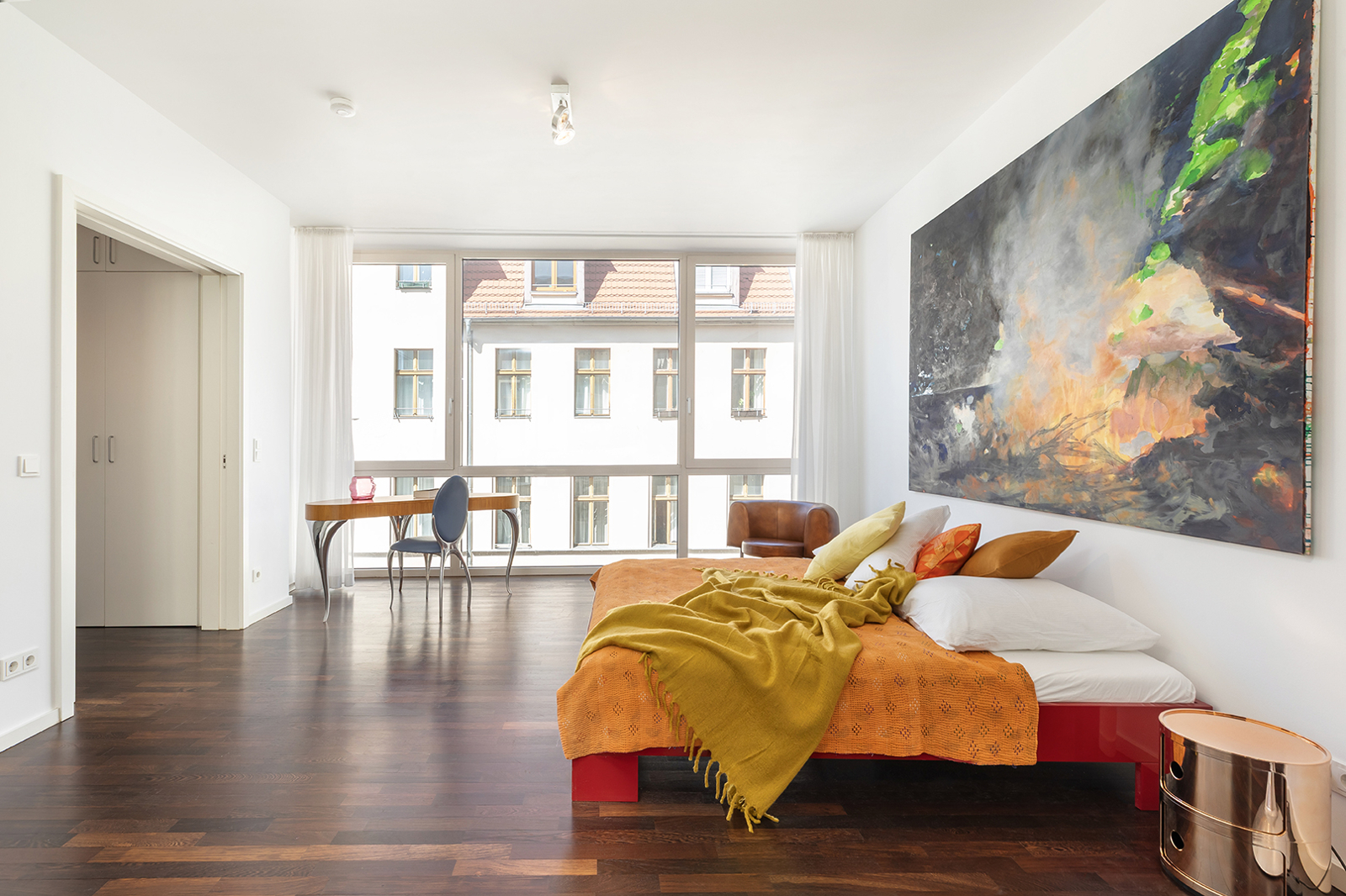 Gormannstraße, Mitte: Spektakuläres Townhouse mit Aufzug, Kamin, Terrassen, Zen-Bereich, Stellplatz „Meine Vision war es, das Townhouse in erster Linie als Familienhaus zu sehen, das sich zugleich perfekt als Ort zur Präsentation einer Kunstsammlung eignet: ein Art House mit Charakter.“ Eigentümer dieses Townhouses „Meine Vision war es, das Townhouse in erster Linie als Familienhaus zu sehen, das sich zugleich perfekt als Ort zur Präsentation einer Kunstsammlung eignet: ein Art House mit Charakter.“ Eigentümer dieses Townhouses Mitten im historischen Scheunenviertel von Berlin Mitte befindet sich dieses architektonisch anspruchsvolle Townhouse, realisiert von den vielfach ausgezeichneten HS-Architekten aus Berlin und stilvoll interpretiert durch den britischen Interior Designer Peter Harvey. Das Haus wurde 2008 in massiver Bauweise errichtet und verfügt über eine Wohn- und Nutzfläche von rund 198 m². Die markante Fassade reflektiert den Himmel und bildet einen spannenden Kontrast zur beinahe dörflichen Nachbarschaft – und das nur wenige Schritte von der Mulackstraße entfernt. In unmittelbarer Umgebung liegen die Boutiquen der Alten Schönhauser Straße sowie die renommierten Galerien und Restaurants der Auguststraße. Das Haus ist auf zwei Wegen zugänglich: Über den repräsentativen Eingang in der Gormannstraße gelangt man per Aufzug direkt auf jede Etage. Alternativ führt ein separater Zugang von der Mulackstraße über ein Treppenhaus in alle vier Ebenen. Großzügige Glasflächen, hohe Decken, fließende Übergänge zwischen Innen- und Außenbereichen sowie Balkone, Patio und Terrasse sorgen für ein lichtdurchflutetes Raumgefühl. Das Townhouse erstreckt sich über vier Etagen und bietet modernes Wohnen mit hoher Flexibilität: 1. Etage: Variabel nutzbarer, großzügiger Raum (ein oder zwei Zimmer) mit eigenem Bad sowie Hauswirtschaftsraum. 2. Etage: Master-Schlafzimmer mit offen gestaltetem En-Suite-Bad und großer Walk-in-Dusche. Edle Bisazza-Glasmosaike greifen das Licht des geschützten Zen-Patios mit Bepflanzung und Wasserbecken auf. 3. Etage: Offene Küche mit weitläufigem Essbereich. Eine Trennwand mit integriertem Aquarium separiert das Gäste-WC. Zusätzlich ein Balkon mit Blick in das Patio. 4. Etage: Das Treppenhaus öffnet sich nach oben zum Himmel. Hier befindet sich der Wohnbereich mit Kamin, der nahtlos auf die große Dachterrasse mit Blick über die Dächer Berlins führt. Ergänzt wird diese Ebene durch einen weiteren Balkon sowie das darunterliegende Patio. Ein Tiefgaragen-Duplexstellplatz mit Aufzug und barrierefreiem Zugang ist im Angebot bereits enthalten. Die in den Räumen präsentierten Kunstwerke stammen von der Künstlerin Teresa Mazuela Sequeira.