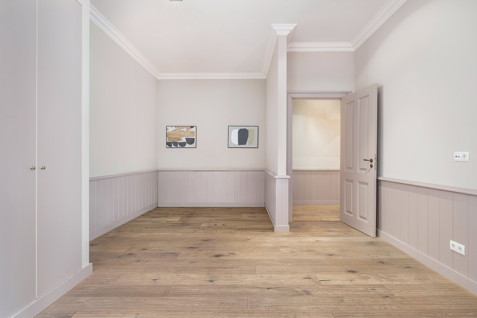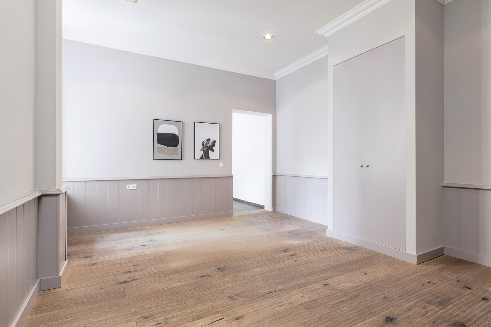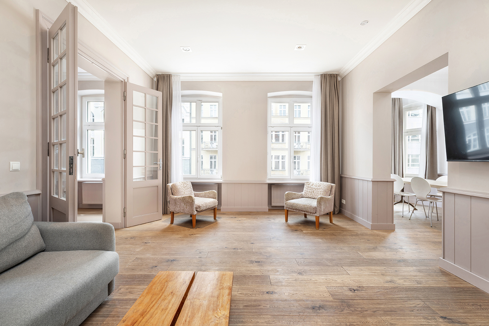 Nahe Rosa-Luxemburg-Platz: 4 Zimmer Altbau-Wohnung, 2 Bäder, elegant und aufwendig saniert Dieser 1900 erbaute und in den letzten Jahren sanierte Altbau bietet einen spannenden Mix aus Gewerbe und Wohnungen. Das Treppenhaus empfängt mit einer eleganten runden Treppe, die für Berlin sehr ungewöhnliche Blicke gewährt. Die Wohnung liegt im 2. OG des Vorderhauses. Auf rund 118 m² vereint sie den unverwechselbaren Charme klassischer Berliner Altbauten mit einer durchdachten und großzügigen Raumaufteilung – ideal für Paare oder kleine Familien. Bereits beim Betreten der Wohnung spürt man die besondere Atmosphäre: Ein großzügiger Flur begrüßt Sie und führt in die weiteren Räume. Direkt rechts liegt das Wohn- und Esszimmer mit Blick zur Schönhauser Allee. Daneben ein weiteres Zimmer, erreichbar über eine Flügeltür. Hier liegt auch die Küche, die genug Platz für eine Einbauküche und einen großzügigen Essbereich bietet. Ein echtes Highlight: Der Blick auf den Fernsehturm direkt vom Esstisch. Im hinteren Teil der Wohnung liegen 2 weitere Zimmer: Eines als Durchgangszimmer, ideal zB als Arbeitszimmer oder zweites Wohnzimmer, direkt dahinter ein weiteres Schlafzimmer. Diese 2 liegen zum ruhigen Innenhof. In allen Räumen liegt elegantes Parkett, die Wände wurden mit aufwendigen Holzverkleidungen ausgekleidet. Wände, Verkleidungen, Türen, die Küche und alle Einbauten: Alles ist hier Ton in Ton gehalten. Die Wohnung verfügt somit über einen ganz besonderen Charme: Elegant und gleichzeitig modern. Des weiteren verfügt die Wohnung über ein modernes Tageslicht-Bad mit Dusche und Badewanne sowie ein weiteres Duschbad. Eine praktische Abstellkammer mit Wasseranschluss für die Waschmaschine vervollständigt das Angebot. Die Wohnung ist kurzfristig bezugsfrei.