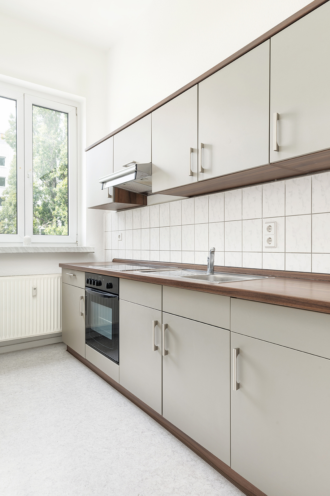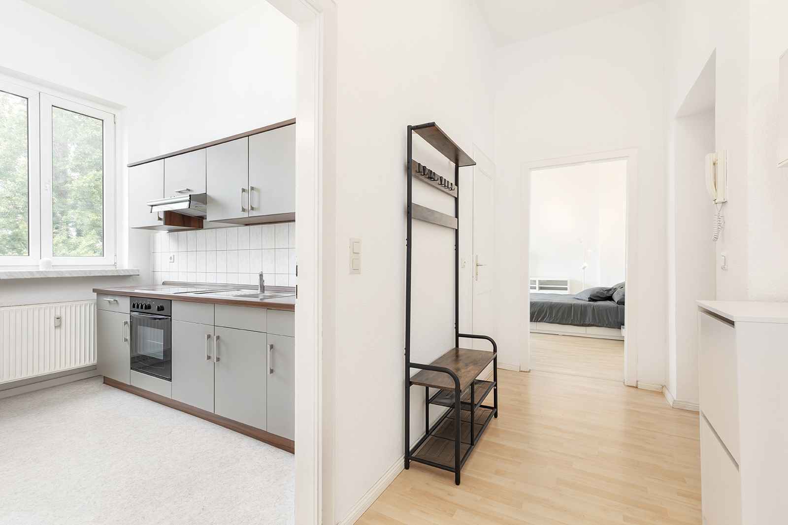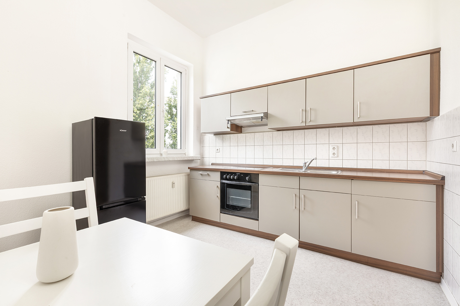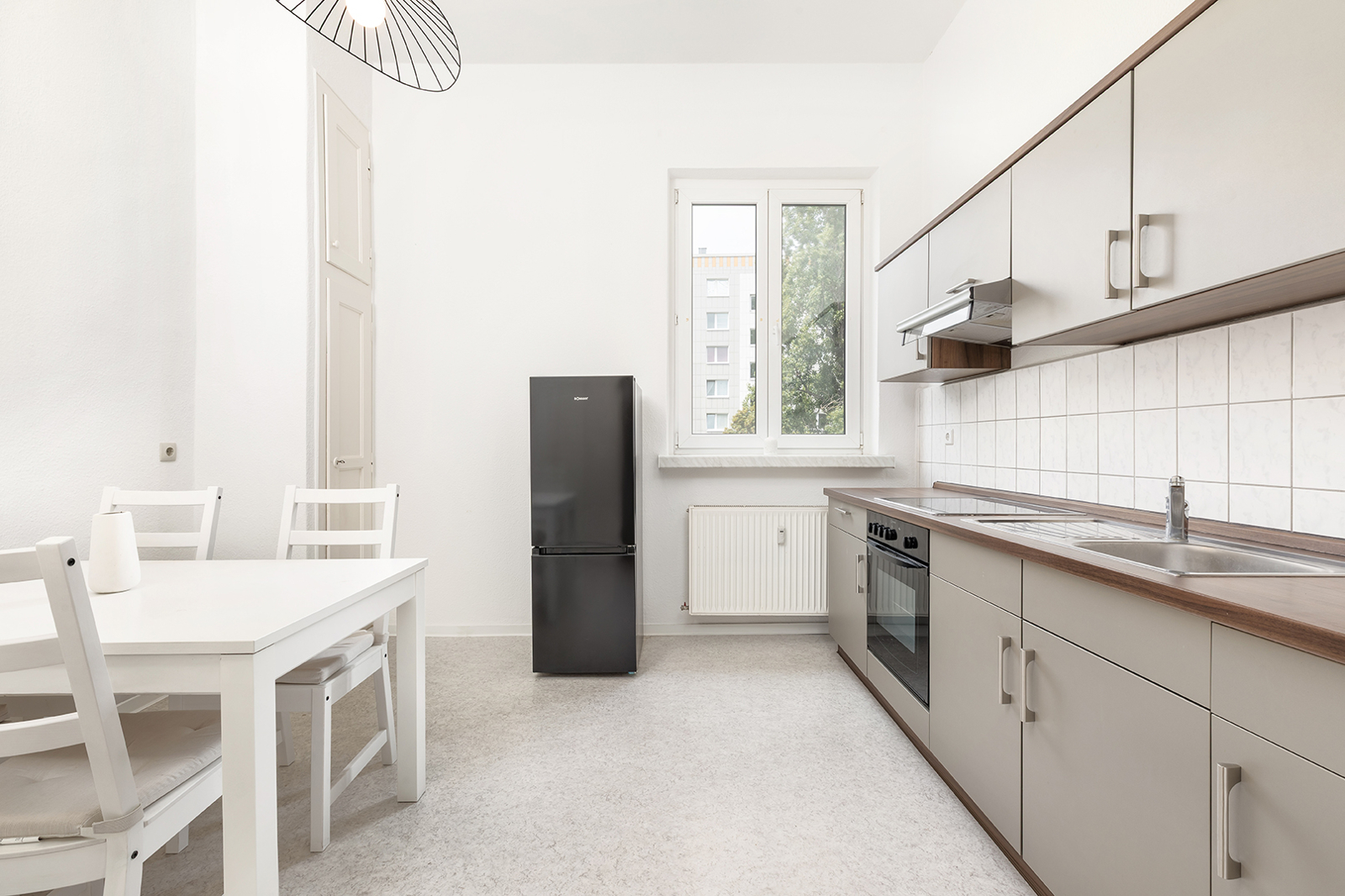 Friedrichshain, zwischen Strausberger Platz und Ostbahnhof - Sehr gut geschnittene Altbau-Wohnung in historischem Gebäude In einem der historischen Stalinbauten nahe der Karl-Marx-Allee verbindet sich die Architektur der 1950er Jahre mit ruhigem Wohnen mitten in Friedrichshain. Das Haus überzeugt mit klarer Fassadengliederung, hohen Decken, dicken Wänden und typischen Details wie Naturstein und einem gepflegten Treppenhaus – solide gebaut, mit Charakter. Die Wohnung im 4. Obergeschoss überzeugt schon beim Eintreten mit einem klaren, gut nutzbaren Schnitt: Vom Flur aus sind Küche, Bad und das großzügige Wohn- und Schlafzimmer direkt zugänglich. Letzteres bietet viel Raum zur Entfaltung – hohe Decken und zwei große Fenster sorgen für eine angenehme, ruhige Wohnatmosphäre. In der Küche ist Platz für eine Einbauküche und einen Tisch mit bis zu vier Sitzplätzen, direkt daneben liegt ein großer Hauswirtschaftsraum – praktisch und selten. Das Tageslichtbad mit Fenster und Badewanne fügt sich stimmig in den funktionalen Grundriss. Alle Räume blicken ins Grüne: durch die Baumkronen fällt weiches Licht, das die Wohnung ruhig und freundlich wirken lässt. Die Wohnung befindet sich in einem gepflegten Zustand – ist bezugsfrei nach Absprache somit steht einer schnellen Neuvermietung oder dem direkten Einzug nichts im Weg.