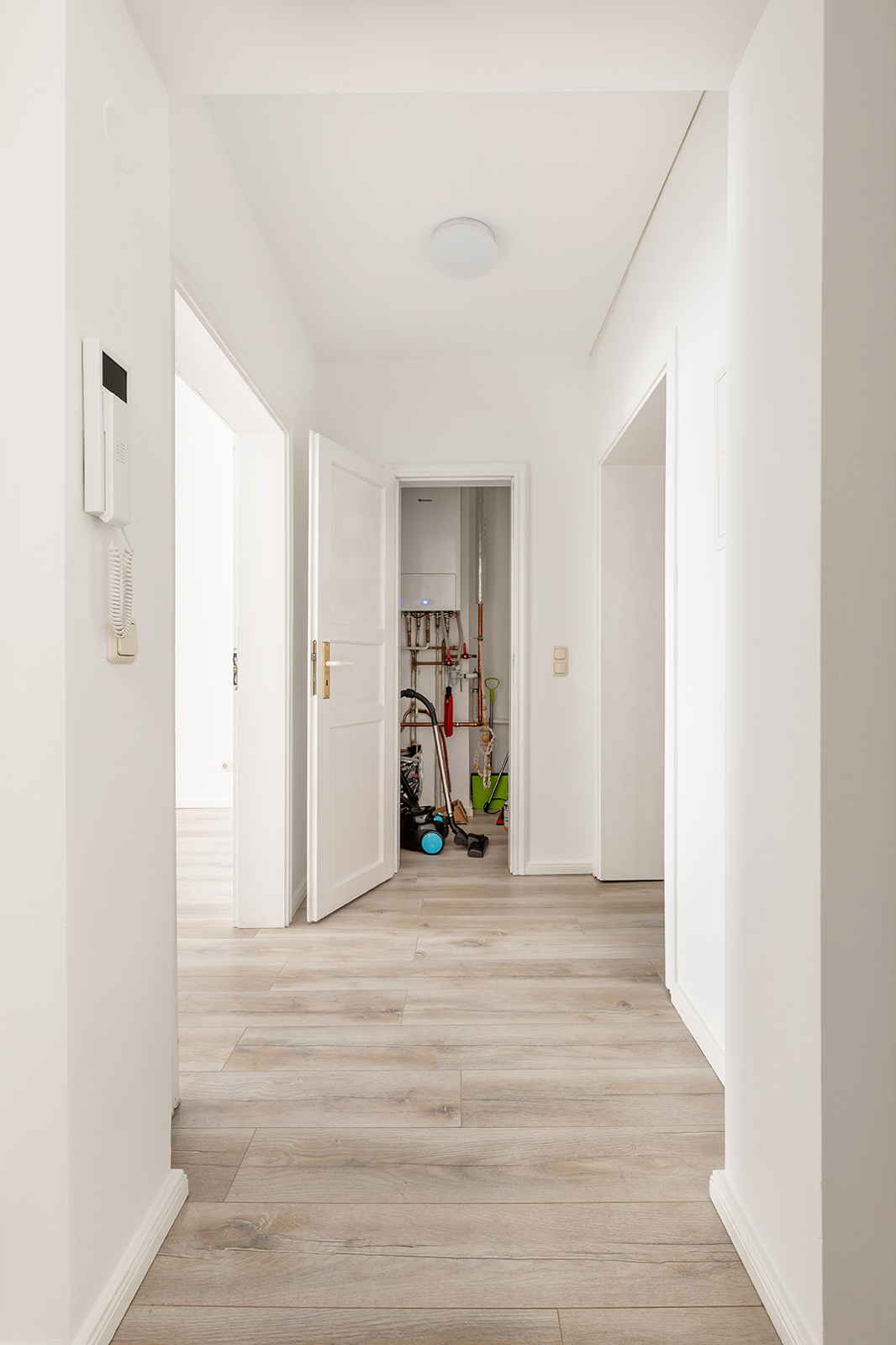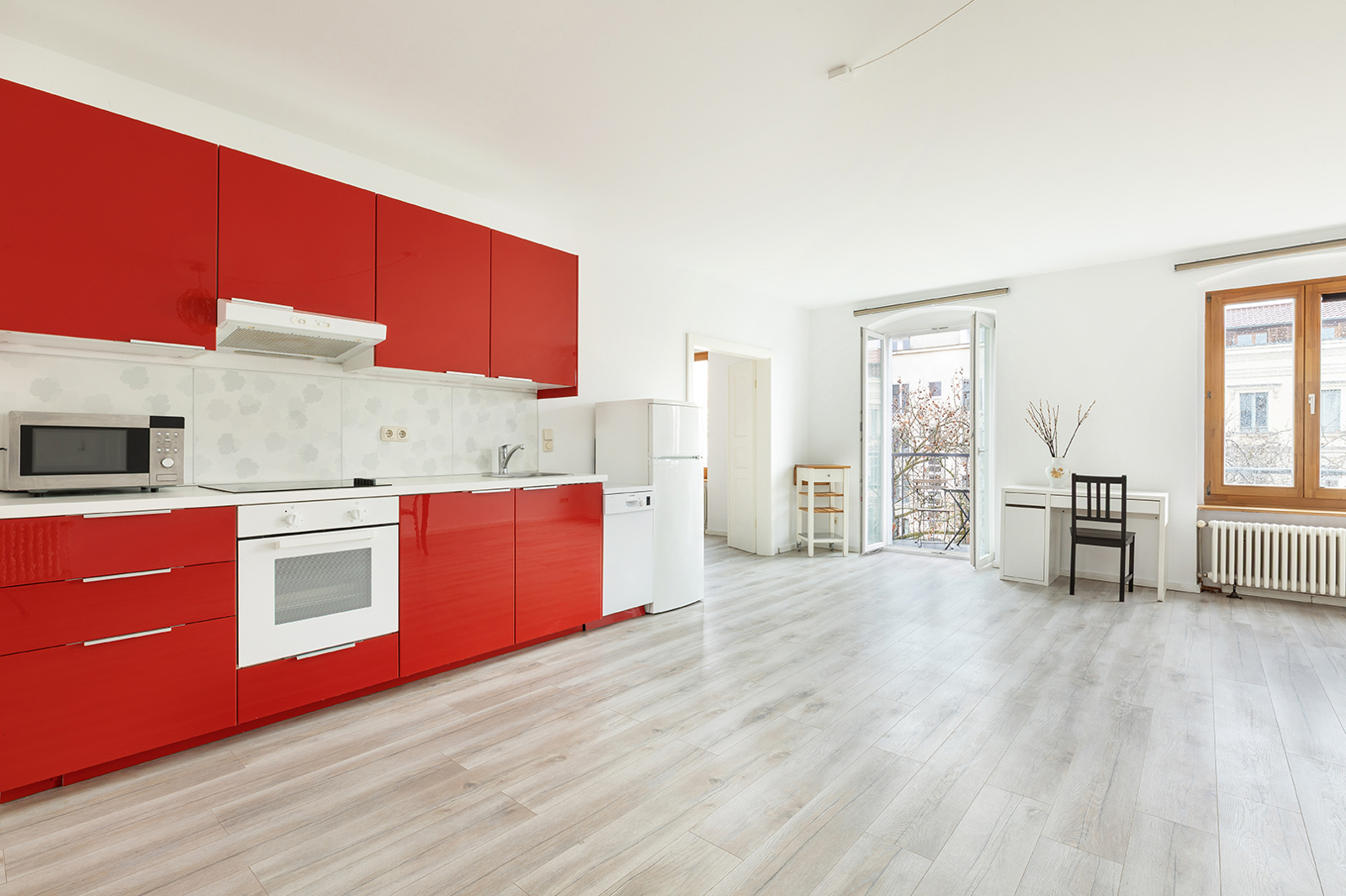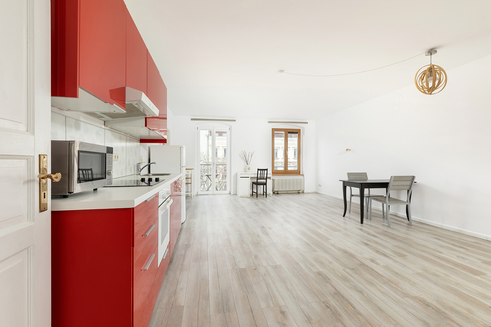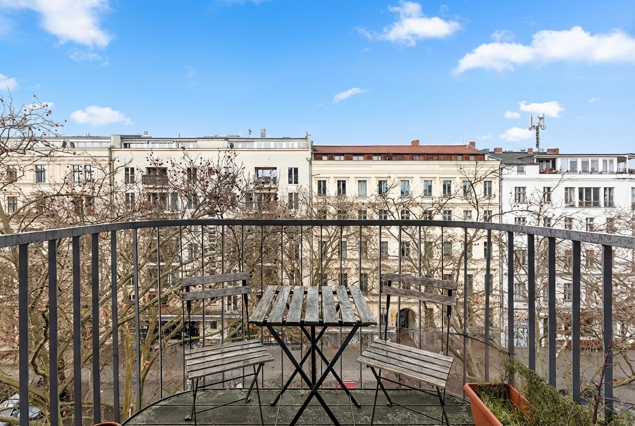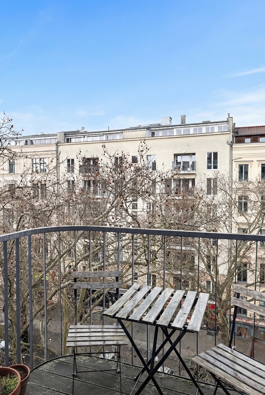 Kollwitzstraße / Knaackstraße: 3-Zimmer Altbauwohnung mit West-Balkon und fantastischem Ausblick Diese charmante 3-Zimmer-Altbauwohnung befindet sich in absoluter Toplage von Prenzlauer Berg – direkt an der Ecke Kollwitzstraße / Knaackstraße, nur wenige Schritte vom Kollwitzplatz entfernt. Bei dem schönen Jugendstil-Eckgebäude wurde um 2014 Balkone angebaut sowie das Dachgeschoss zu Wohnzwecken ausgebaut. Über das gepflegte Treppenhaus gelangen Sie in das 4. Obergeschoss zu der hier angebotenen Wohnung. Herzstück der Wohnung ist die großzügige, ca. 35 m² große Wohnküche mit direktem Zugang zum West-Balkon. Vom Balkon aus eröffnet sich ein fantastischer Blick in die Straßenschlucht von Knaackstraße und Kollwitzstraße sowie in Richtung Kollwitzplatz. Der Balkon bietet ausreichend Platz für zwei Stühle und einen kleinen Tisch – ideal für einen Kaffee in der Nachmittagssonne. Die offene Wohnküche bietet ausreichend Platz für einen großen Esstisch sowie einen komfortablen Wohnbereich. Die funktionale Einbauküche ist bereits im Kaufpreis enthalten. Vom Wohnzimmer aus gelangen Sie in das erste der beiden Schlafzimmer. Mit ca. 17 m² überzeugt es durch Großzügigkeit und bietet komfortabel Platz für Bett, Kleiderschrank sowie optional einen Schreibtisch. Das zweite Schlafzimmer befindet sich am Eingangsbereich der Wohnung mit Blick in den ruhigen Innenhof. Mit ca. 16 m² ist auch dieser Raum sehr gut geschnitten und flexibel nutzbar – ob als weiteres Schlafzimmer, Kinderzimmer oder Homeoffice. Das geflieste Badezimmer ist funktional ausgestattet mit Duschwanne, WC und Waschbecken. Abgerundet wird das Raumangebot durch eine praktische Abstellkammer am Ende des Flures. In den Wohn- und Schlafräumen ist Laminat verlegt. Zur Wohnung gehört ein Keller.