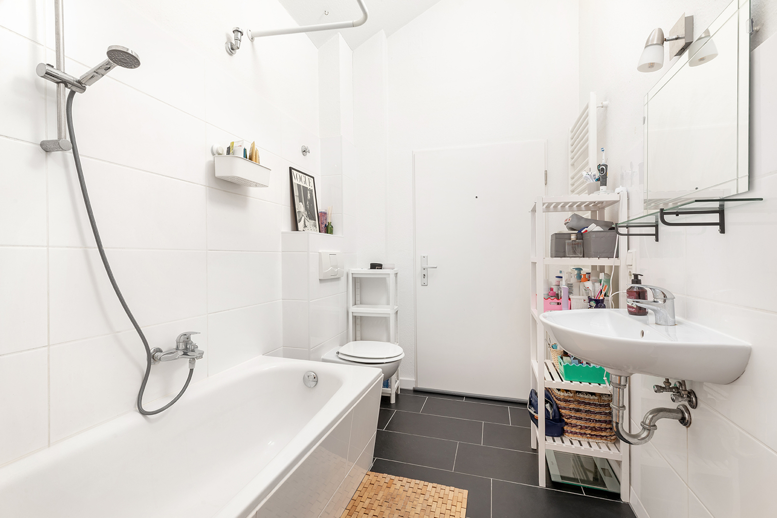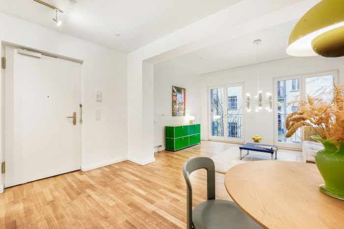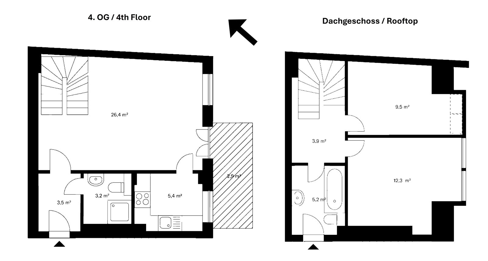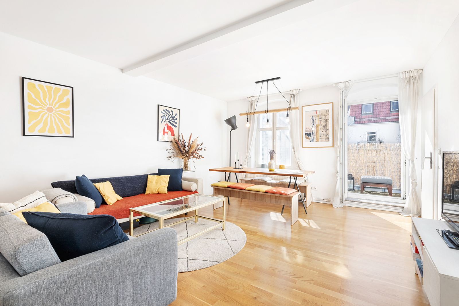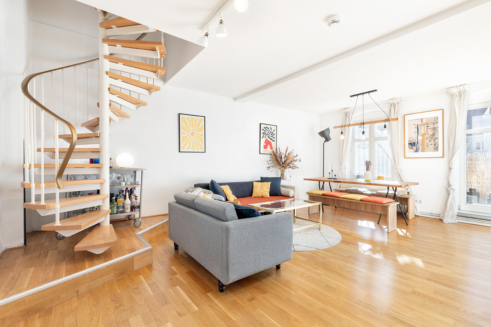 Torstraße, Mitte: Lichtdurchflutete 3 Zimmer DG-Maisonette im Gartenhaus, Süd-Terrasse, Effizienz B Das Gebäudeensemble wurde um die Jahrtausendwende umfassend saniert und präsentiert sich heute in einem gepflegten Zustand. Vor wenigen Jahren wurden zudem die Treppenhäuser renoviert, die Fassaden neu gestrichen und die Innenhöfe neu gestaltet. Insgesamt verfügt die Anlage über zwei begrünte Innenhöfe, die eine ruhige und angenehme Wohnatmosphäre mitten in Berlin schaffen. Ein zusätzlicher Pluspunkt ist die Energieeffizienzklasse B, die für ein Gebäude dieser Bauzeit einen sehr guten energetischen Standard darstellt. Die hier angebotene 3-Zimmer-Maisonette-Wohnung erstreckt sich über das 4. OG und Dachgeschoss des Gartenhauses. Auf rund 72 m² Wohnfläche überzeugt die Wohnung mit einer attraktiven und gut nutzbaren Raumaufteilung. Herzstück der unteren Ebene ist das großzügige Wohnzimmer mit offener Treppe zur oberen Ebene. Große Fensterflächen und die Südausrichtung sorgen für viel Tageslicht und eine helle, freundliche Wohnatmosphäre. Vom Wohnbereich aus gelangt man auf den sonnigen Südbalkon mit Blick in den ruhigen Innenhof – von hier lässt sich sogar die Spitze des Berliner Fernsehturms erkennen. Ebenfalls auf dieser Ebene befinden sich die separate, voll ausgestattete Küche sowie ein vollwertiges Badezimmer mit Dusche. Die Einbauküche ist im Kaufpreis enthalten. Über eine elegante Wendeltreppe erreicht man das Dachgeschoss der Maisonette. Hier befinden sich zwei gut geschnittene Schlafzimmer sowie ein weiteres Badezimmer mit Badewanne. Große Fensterflächen sorgen auch auf dieser Ebene für eine helle und angenehme Wohnatmosphäre. In der gesamten Wohnung ist Echtholzparkett verlegt. Zur Wohnung gehört kein Keller.