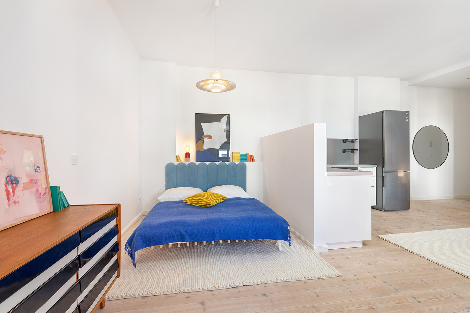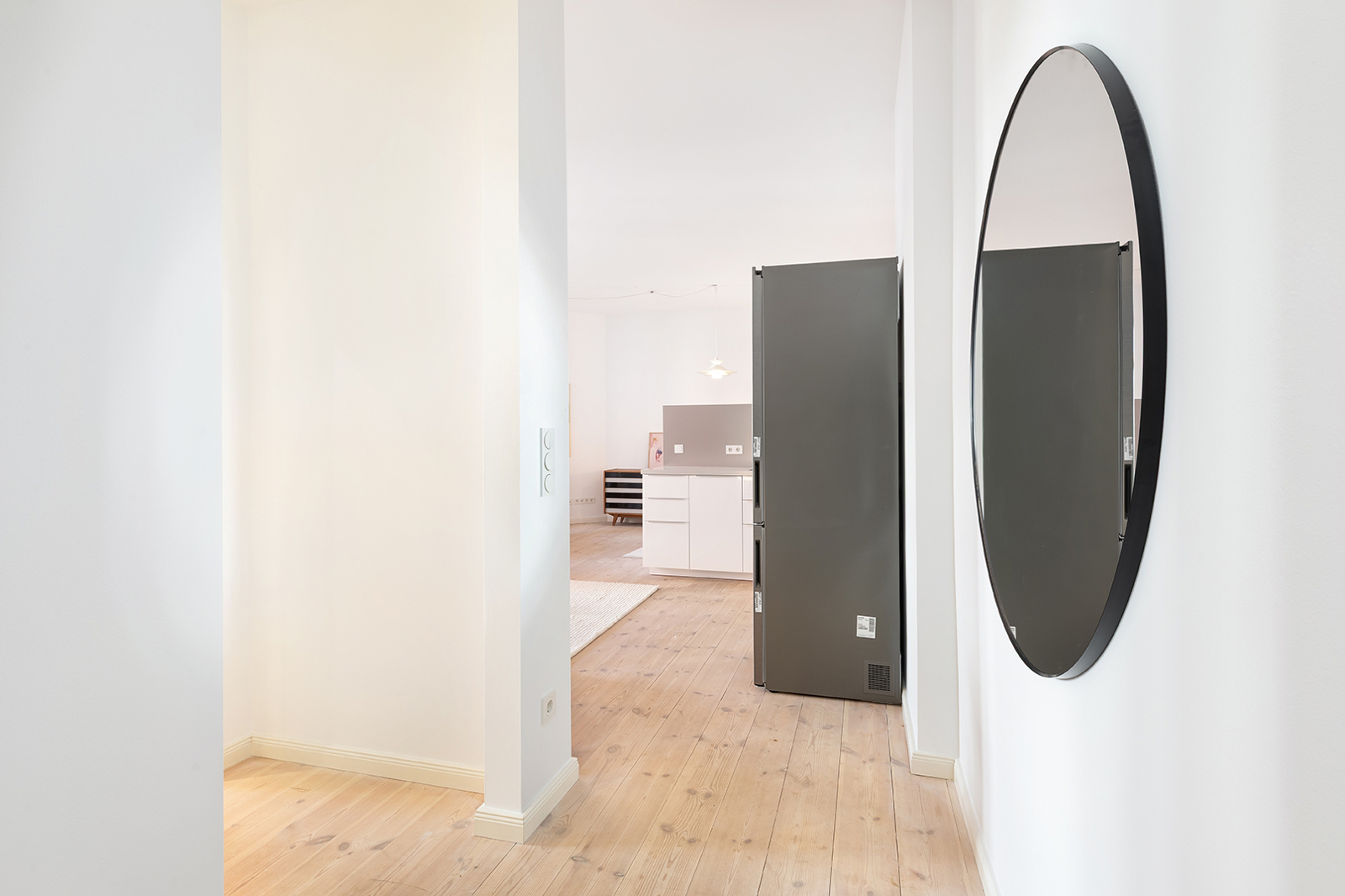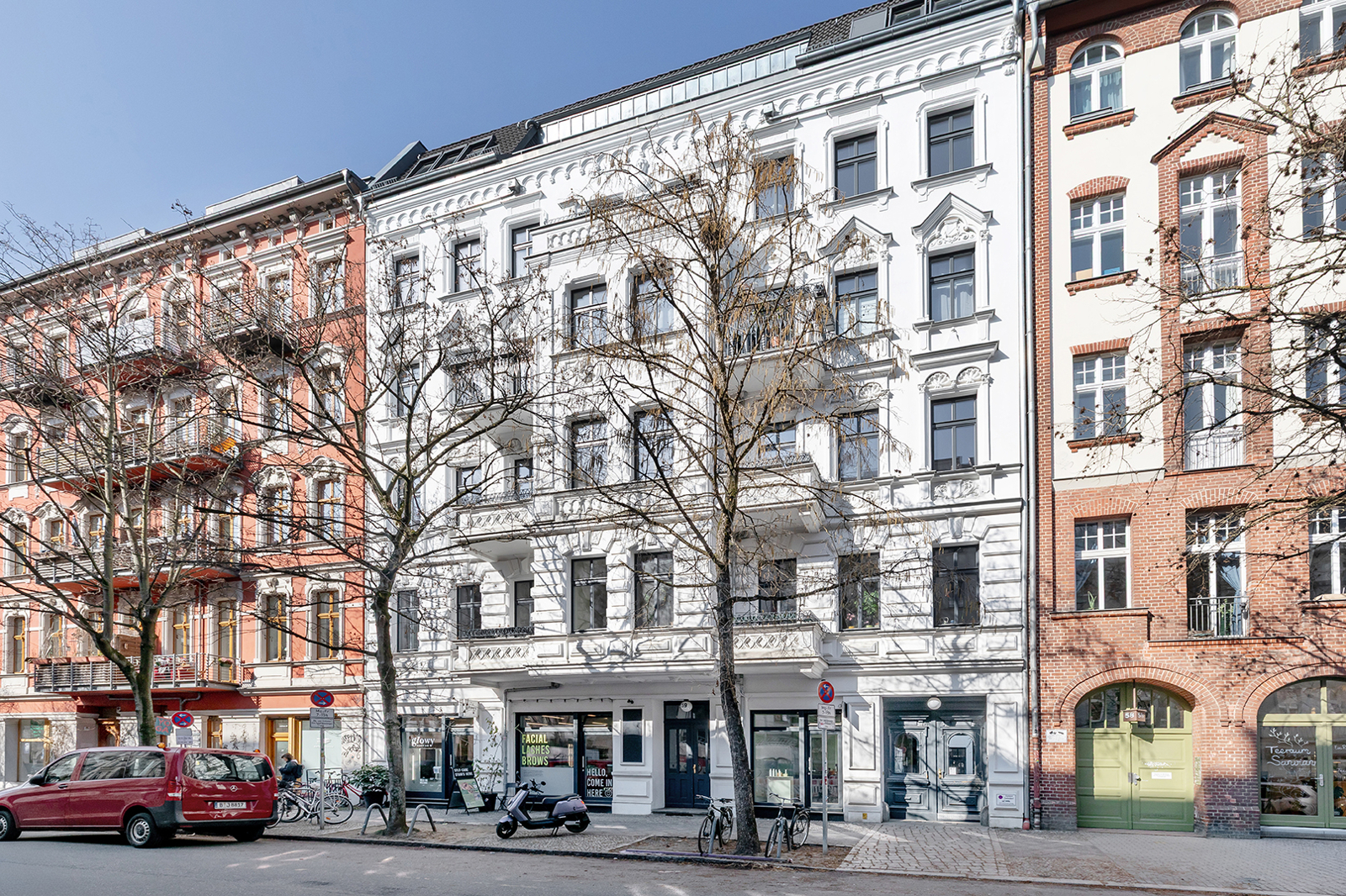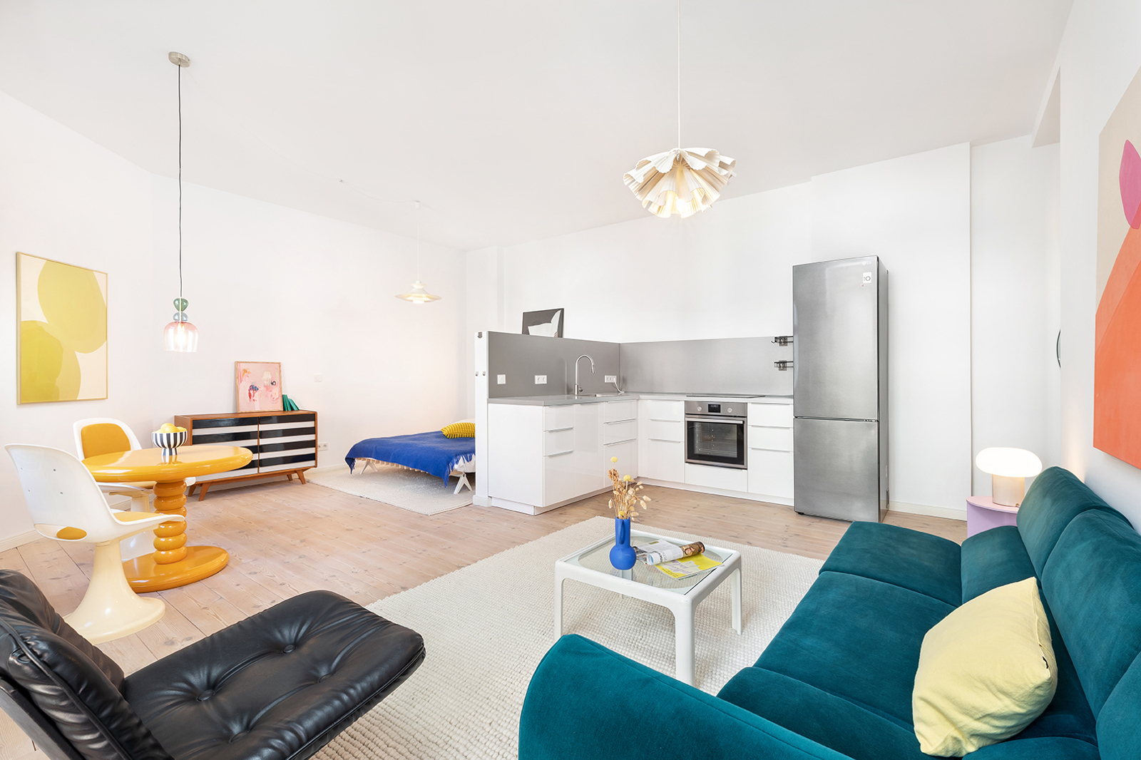 Winsstraße: Helles, großzügiges Studio-Apartment mit Balkon in ruhiger Innenhoflage In den Jahren 2015–2017 wurde dem klassischen Altbau neues Leben eingehaucht: Das Architektenduo Bruzkus Batek entwickelte ein zurückhaltendes, zugleich elegantes Designkonzept für das gesamte Gebäude. Die fein gegliederte Stuckfassade wurde aufwendig restauriert und bildet einen stilvollen Kontrast zu den dunkel gefassten Fenstern sowie der markanten Farbgebung der Penthäuser. Hochwertige Farbakzente von Farrow & Ball setzen das gestalterische Konzept im Inneren des Hauses konsequent fort, während edle Messingbeschläge besondere Akzente setzen. Auch in den Wohnungen wurde die Sanierung mit höchstem Anspruch an Qualität und Detail umgesetzt. Hervorzuheben ist auch die Energieeffizienzklasse B. Die angebotene Wohnung befindet sich im zweiten Hinterhaus im 3. OG und überzeugt durch ihre außergewöhnlich ruhige Lage sowie einen durchdacht gestalteten Grundriss. Das Herzstück der Wohnung bildet der großzügige Wohnbereich, der mit seiner offenen Gestaltung und einem angenehmen Raumgefühl begeistert. Große Fensterflächen sorgen für viel Tageslicht und schaffen eine helle, einladende Atmosphäre. Auf ca. 49,12 m² bietet sich ausreichend Platz zum Wohnen und Arbeiten. Der Wohnbereich geht fließend in die offen gestaltete Küche über: Die zeitlos weiße Einbauküche fügt sich harmonisch in das Raumkonzept ein und unterstreicht den modernen, klaren Charakter des Studios. Eine geschickt integrierte Schlafnische sorgt für eine angenehme räumliche Trennung und ermöglicht eine klare Gliederung von Wohn- und Schlafbereich, ohne die Offenheit der Wohnung zu beeinträchtigen. Vom Wohnbereich aus gelangen Sie auf den Balkon mit Blick in den ruhigen, begrünten Innenhof – ein idealer Ort zum Entspannen. Das Tageslichtbad ist in modernen Grautönen gestaltet und mit einer Badewanne ausgestattet. Ergänzt wird es durch eine praktische, separate Abstellnische mit Waschmaschinenanschluss, die zusätzlichen Stauraum bietet und funktional in den Grundriss integriert ist.