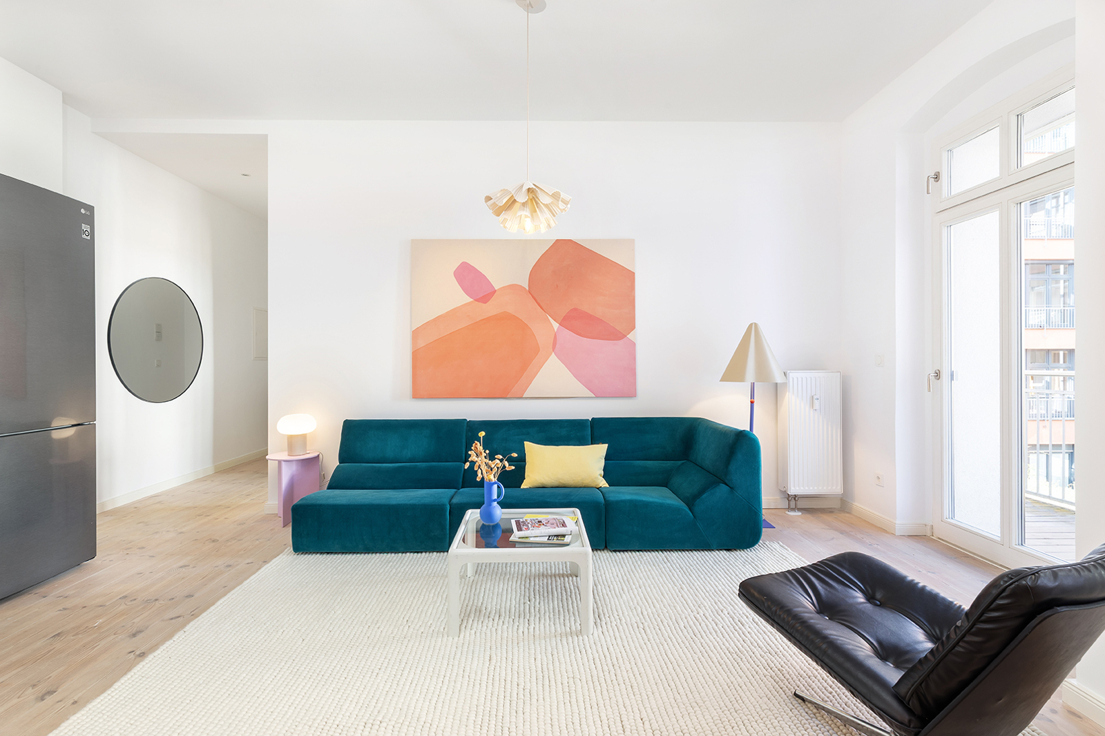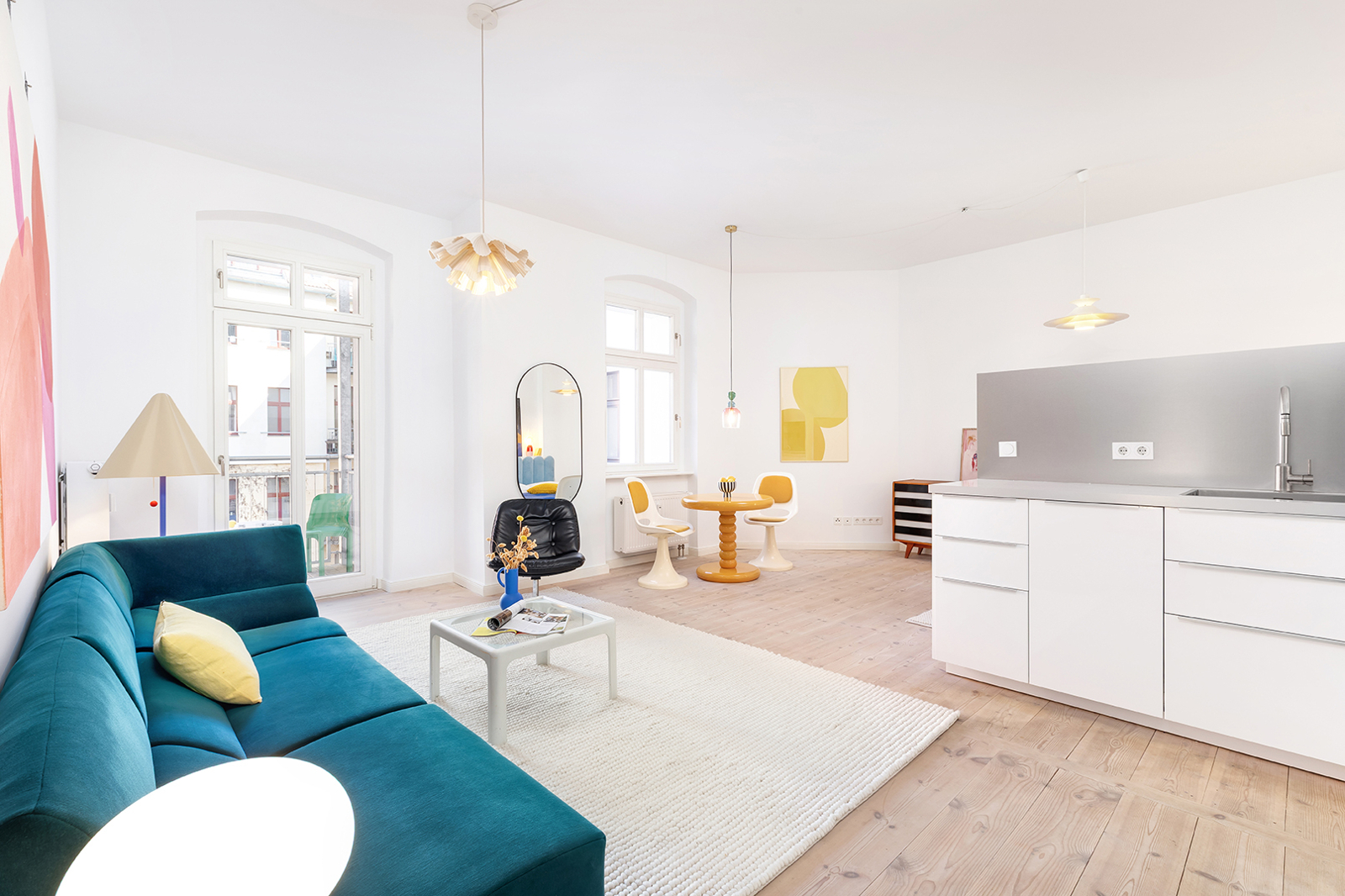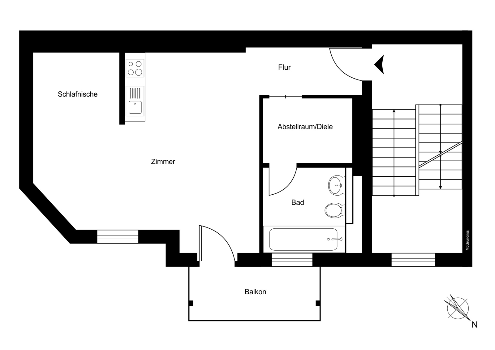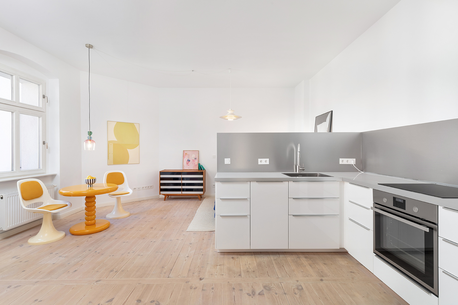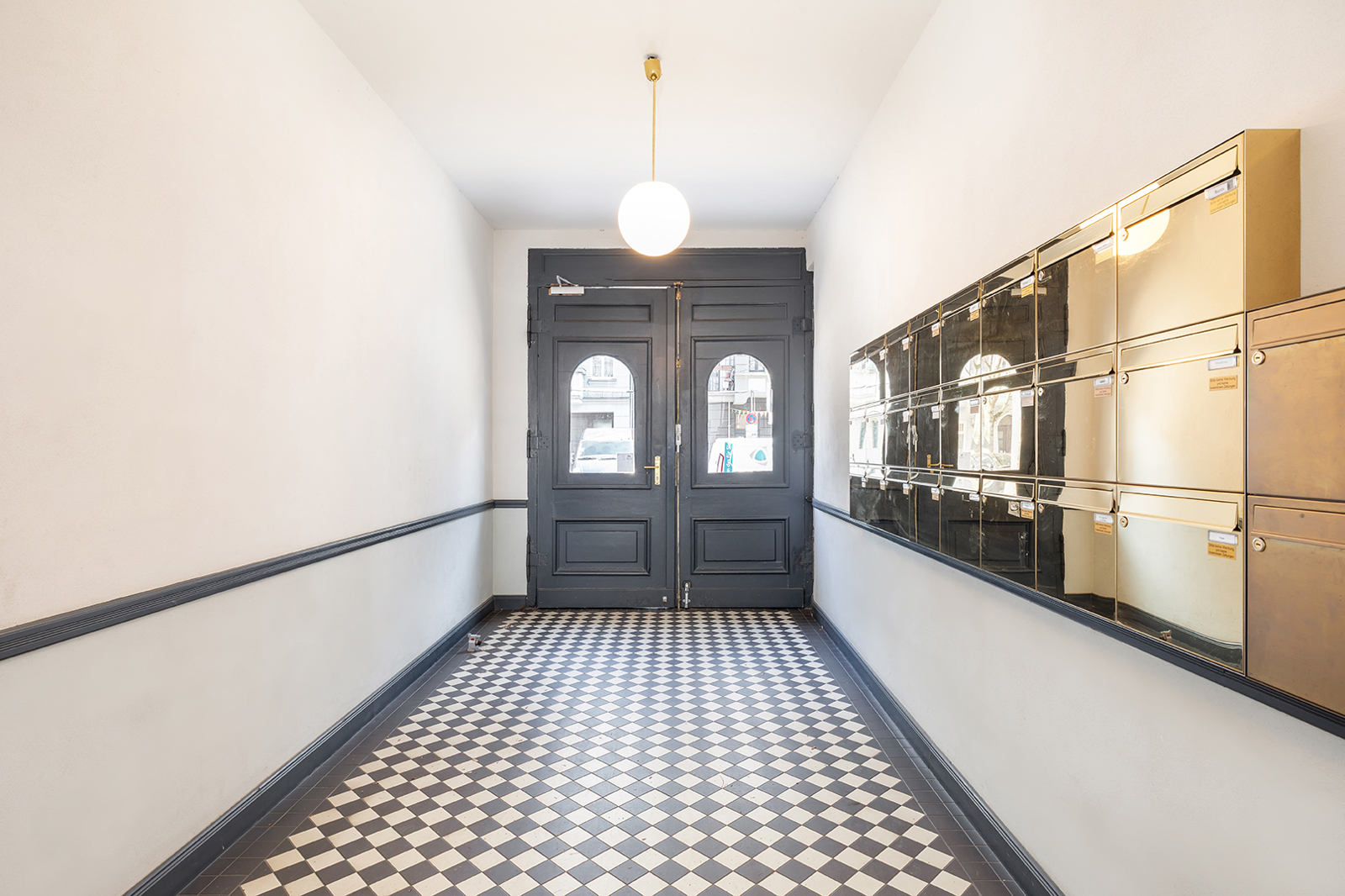Winsstraße: Helles, großzügiges Studio-Apartment mit Balkon in ruhiger Innenhoflage In den Jahren 2015–2017 wurde dem klassischen Altbau neues Leben eingehaucht: Das Architektenduo Bruzkus Batek entwickelte ein zurückhaltendes, zugleich elegantes Designkonzept für das gesamte Gebäude. Die fein gegliederte Stuckfassade wurde aufwendig restauriert und bildet einen stilvollen Kontrast zu den dunkel gefassten Fenstern sowie der markanten Farbgebung der Penthäuser. Hochwertige Farbakzente von Farrow & Ball setzen das gestalterische Konzept im Inneren des Hauses konsequent fort, während edle Messingbeschläge besondere Akzente setzen. Auch in den Wohnungen wurde die Sanierung mit höchstem Anspruch an Qualität und Detail umgesetzt. Hervorzuheben ist auch die Energieeffizienzklasse B. Die angebotene Wohnung befindet sich im zweiten Hinterhaus im 3. OG und überzeugt durch ihre außergewöhnlich ruhige Lage sowie einen durchdacht gestalteten Grundriss. Das Herzstück der Wohnung bildet der großzügige Wohnbereich, der mit seiner offenen Gestaltung und einem angenehmen Raumgefühl begeistert. Große Fensterflächen sorgen für viel Tageslicht und schaffen eine helle, einladende Atmosphäre. Auf ca. 49,12 m² bietet sich ausreichend Platz zum Wohnen und Arbeiten. Der Wohnbereich geht fließend in die offen gestaltete Küche über: Die zeitlos weiße Einbauküche fügt sich harmonisch in das Raumkonzept ein und unterstreicht den modernen, klaren Charakter des Studios. Eine geschickt integrierte Schlafnische sorgt für eine angenehme räumliche Trennung und ermöglicht eine klare Gliederung von Wohn- und Schlafbereich, ohne die Offenheit der Wohnung zu beeinträchtigen. Vom Wohnbereich aus gelangen Sie auf den Balkon mit Blick in den ruhigen, begrünten Innenhof – ein idealer Ort zum Entspannen. Das Tageslichtbad ist in modernen Grautönen gestaltet und mit einer Badewanne ausgestattet. Ergänzt wird es durch eine praktische, separate Abstellnische mit Waschmaschinenanschluss, die zusätzlichen Stauraum bietet und funktional in den Grundriss integriert ist.