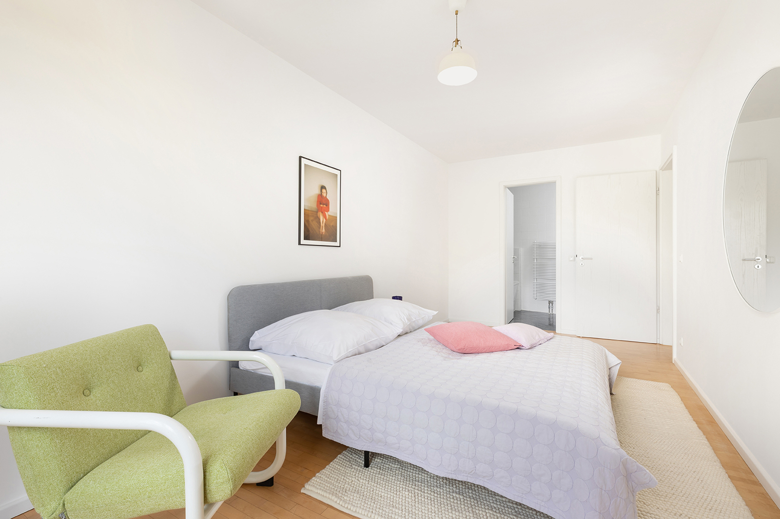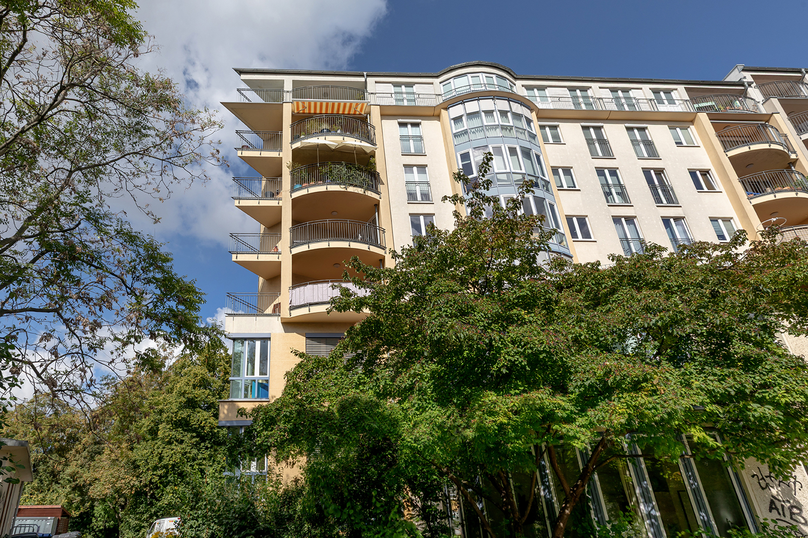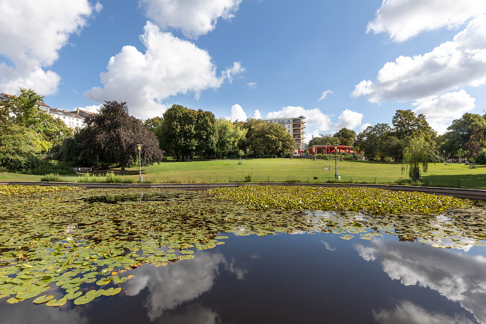 Veteranenstraße mit Blick auf den Weinbergspark: 3-4 Zimmerneubauwohnung mit Süd-West Loggia, Fahrstuhl, TG-Stellplatz, 2 Bäder Diese stilvolle, großzügig geschnittene Wohnung liegt im 2. Obergeschoss eines gepflegten Wohnensembles aus dem Jahr 1997 – ruhig gelegen im Seitenflügel und mit freiem, unverbaubarem Blick über den grünen Weinbergspark. Das Gebäude befindet sich am südwestlichen Ende des Parks und thront in erhöhter Position über der Umgebung. Dank dieser einzigartigen Lage genießen Sie nicht nur viel Ruhe, sondern auch ein außergewöhnliches Panorama – inklusive Seerosenteich. Die Wohnung erstreckt sich über ca. 103 m² Wohnfläche und überzeugt durch einen durchdachten Grundriss sowie helle, freundliche Räume. Mittelpunkt ist das großzügige Wohn- und Esszimmer mit weitläufigen, bodentiefen Fensterflächen, die für ideale Lichtverhältnisse sorgen. Der Raum öffnet sich zur sonnigen Loggia mit West/Südwest-Ausrichtung – ein perfekter Ort, um den Tag bei einem Abendessen und einem Glas Wein mit Blick ins Grüne ausklingen zu lassen. Die separate Küche ist mit einer Einbauküche ausgestattet und bietet Gestaltungsspielraum für individuelle Anpassungen. Zwei gut geschnittene Schlafzimmer befinden sich im vorderen Teil der Wohnung – das größere davon verfügt über ein eigenes, innenliegendes En-Suite-Bad mit Badewanne. Ein weiteres Duschbad mit Waschmaschinenanschluss sowie ein praktischer Flur mit Platz für eine Garderobe ergänzen das Raumangebot. In allen Wohnräumen wurde helles Echtholzparkett verlegt, das der Wohnung eine warme und hochwertige Atmosphäre verleiht. Ein Personenaufzug bringt Sie bequem und stufenlos in die Etage. Zum Gemeinschaftseigentum gehört ein großzügiger, gepflegter Innenhof mit überdachten Fahrradstellplätzen – ein Pluspunkt für alle, die urban und dennoch entspannt wohnen möchten. Es besteht die Möglichkeit, die Küche ins Wohnzimmer zu legen und aus der jetzigen Küche ein zusätzliches Schlaf/Arbeits/Gästezimmer zu machen. Ein geräumiger Kellerraum ist der Wohnung zugeordnet. Zusätzlich kann ein Tiefgaragen-Stellplatz für 50.000 € erworben werden (Hausgeld: 15 €/Monat). Die Wohnung ist kurzfristig verfügbar und bietet eine seltene Gelegenheit, in einer der begehrtesten Lagen Berlins zu wohnen – ruhig, grün und dennoch mitten im pulsierenden Herzen von Mitte.