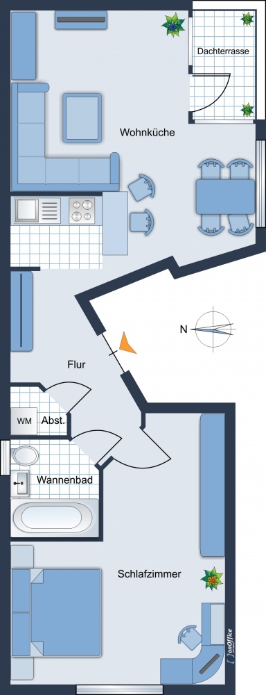 In allen Wohnungen wurden in den letzten Jahren die Küchen, die Bäder sowie die Fußböden renoviert. Im Allgemeinen, befindet sich das Haus in einem guten Zustand. Allerdings ist kein Fahrstuhl vorhanden und die Wohnung liegt im 5.OG als Dachgeschosseinheit. Die Wohnung selbst wurde in den vergangenen Jahren als Freinwohnung vermietet und ist nun renovierungsbedürftig. Die Aufteilung ist ideal. Der Schlafbereich und der Wohn-Küchenbereich mit Terrasse sind mit einem Flur voneinander getrennt.