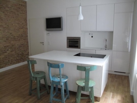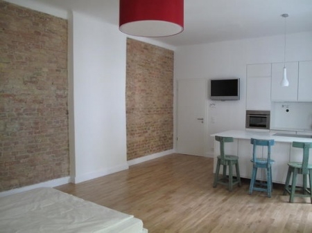 Dieses "Miniloft" befindet sich in einem klassischen Berliner Altbau der Jahrhundertwende um 1900. Der Gesamteindruck des Objektes ist sehr gepflegt. Das Miniloft ist luxuriös ausgestattet und verfügt über eine - Top Einbauküche mit Corianarbeitsflächen und sämtlichen Einbaugeräten. Die Fronten sind rund um in weißem Klavierlack ausgebildet. Der freistehende Küchenblock beherbergt das berührungsempfindliche Ceran-Kochfeld, viel Stauraum und dient als Esstisch und Arbeitsbereich gleichermaßen. - der massive neue Eichenboden verleiht dem Miniloft einen stylischen Look - Sichtmauerwerk unterstreicht den architektonischen Stil - Sämtliche gut erhaltene Doppelkastenfenster wurden aufgearbeitet und lackiert - Eine neue Kombi-Heizungsanlage versorgt die Wohnung mit Wärme und Warmwasser und das energieeffizient und autark. - Ein LCD-Fernsehgerät (SONY) ist bereits installiert - Das Bad ist ein besonderes Highlight dieses Minilofts! Die Perlmuttoptik der weißen Keramik und die Corianelemente, die bodentiefe Dusche und Luxusarmaturen sowie der riesige Wandspiegel verleihen dem Raum einen absoluten Wellness-Look Das Miniloft ist voll möbliert: Designerbett und Nachttisch in Klavierlack, Designerlampen und Armaturen, Luxuseinbauküche mit Ceranfeld und Corianoberflächen, Luxusbad mit edlen Armaturen und raumhoher Echtglas-Duschabtrennung, antike Barstühle am Küchenblock, LCD TV von SONY, neuer Wäschetrockner in der Kammer, Staubsauger und sämtliche Elektrogeräte sowie sämtliche Küchenutensilien sind vorhanden