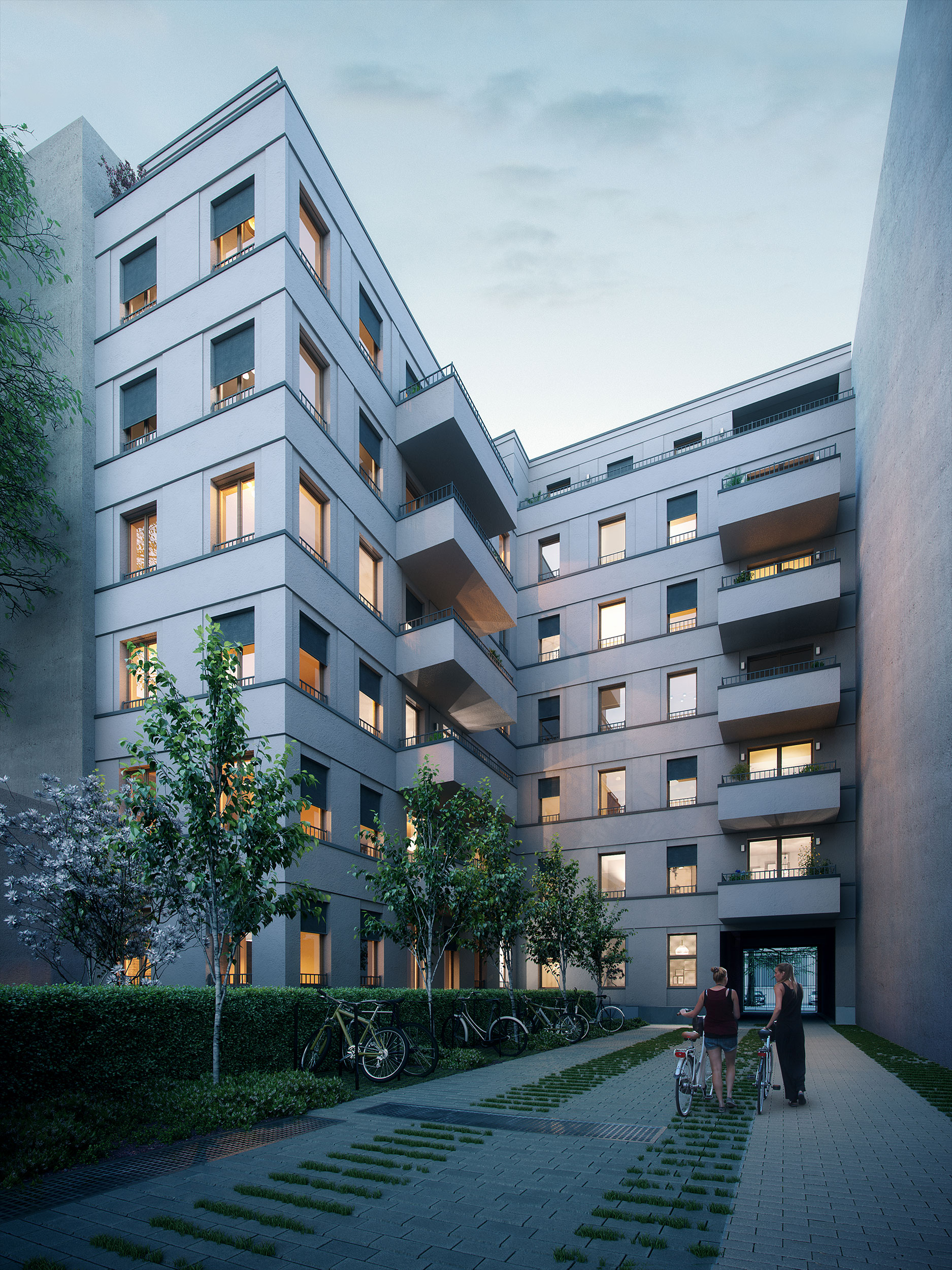 Die klar strukturierte Fassade mit hochwertigen Putz- und Ziegeloberflächen gibt dem Haus einen besonderen Charakter und ist durch Verwendung von mineralischem Dämmmaterial darüber hinaus nachhaltig gefertigt. Dieser setzt sich durch die vielfältigen Wohnungszuschnitte und unterschiedlichen Größen – mit Blick in den städtischen Raum und in den privaten Hofgarten – fort.