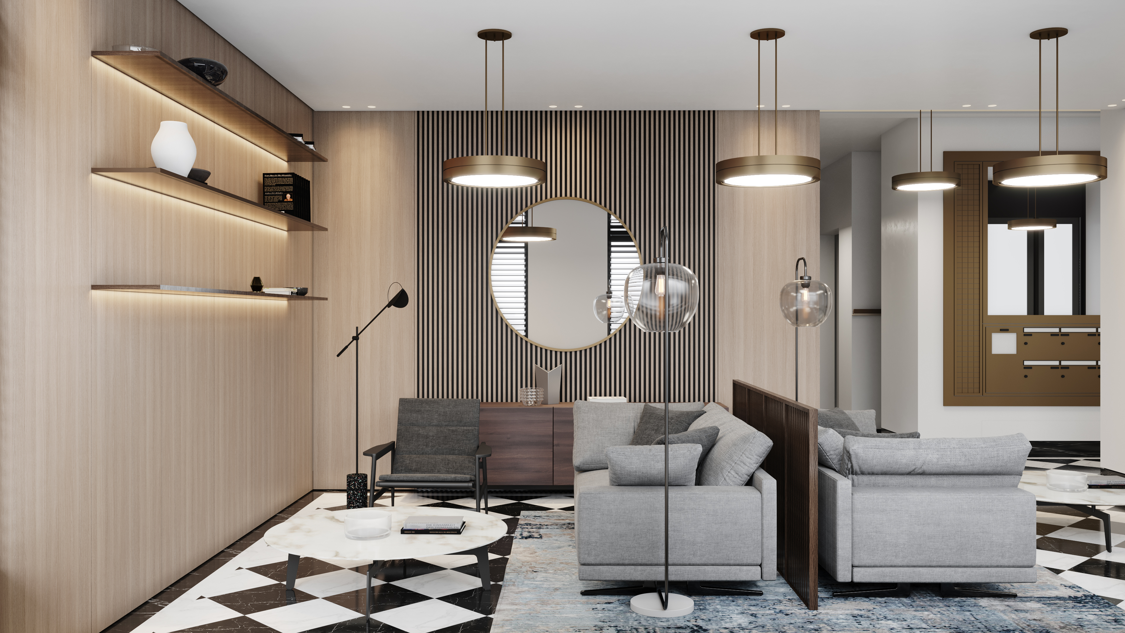 Alle Wohnungen und das Untergeschoss werden über den Aufzug barrierefrei erschlossen. Der Eingangsbereich soll in seiner Konzeption den anspruchsvollen Charakter des Gebäudes wieder spiegeln und die Bedeutung der neuen Adresse im städtischen Kontext unterstreichen. In der 30 qm großen Lobby kommen ausgesuchte Materialien wie Naturstein, patiniertes Messing und großformatige Spiegel zum Einsatz und strahlen Eleganz aus.