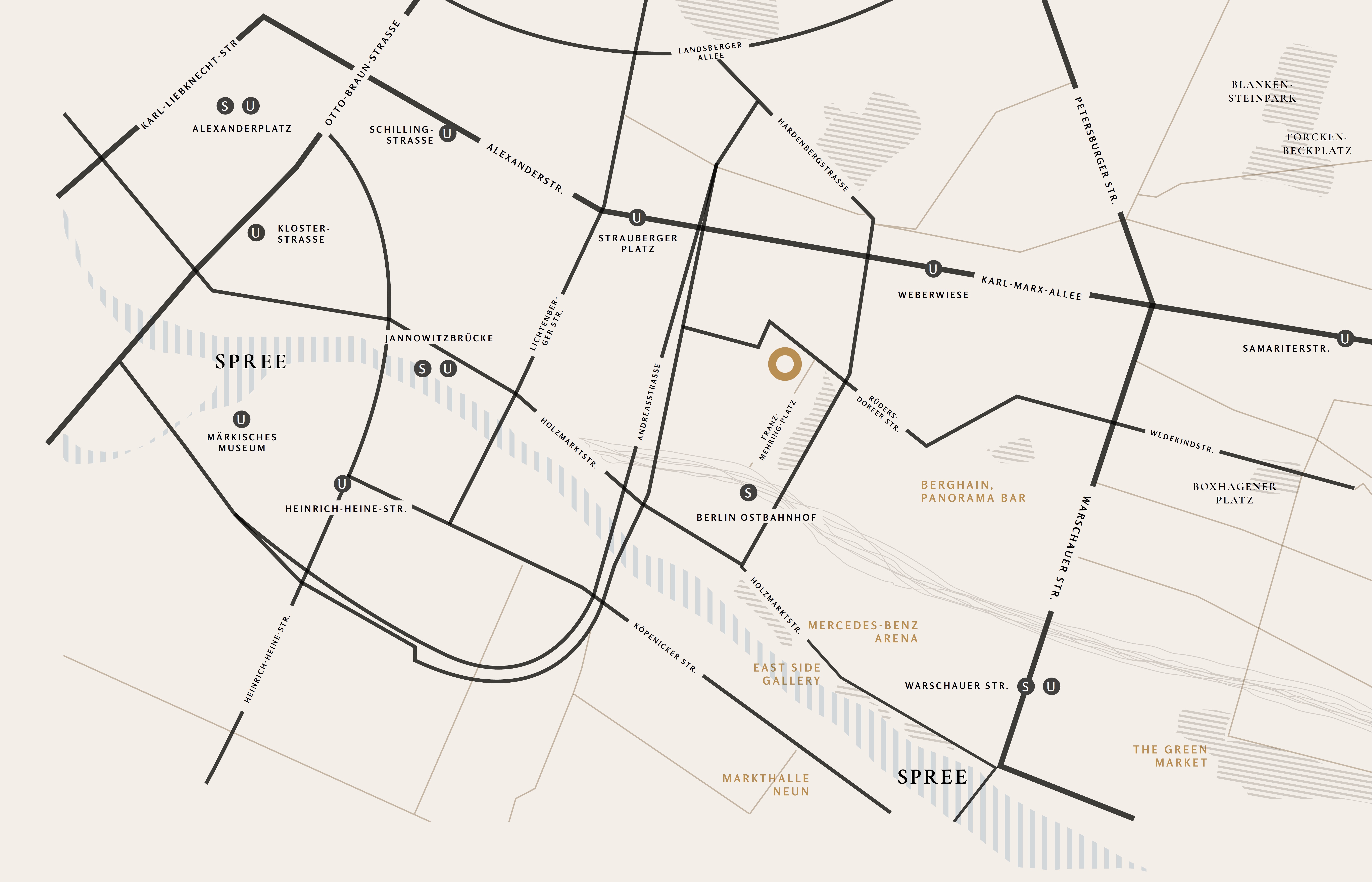 An der Grenze von Mitte und Kreuzberg gelegen, fügt sich das Wohnensemble am Franz-Mehring-Platz in seine lebendige Umgebung ein. Die Gegend ist bekannt für das weltberühmte Berghain in unmittelbarer Nähe sowie die Clubs entlang der Holzmarktstraße und die East Side Gallery an der Spree. Die umliegenden Quartiere, wie z.B. rund um den Boxhagener Platz, locken mit alternativem Einzelhandel, kulinarischen Spezialitäten und Bars und lassen keine Wünsche offen.