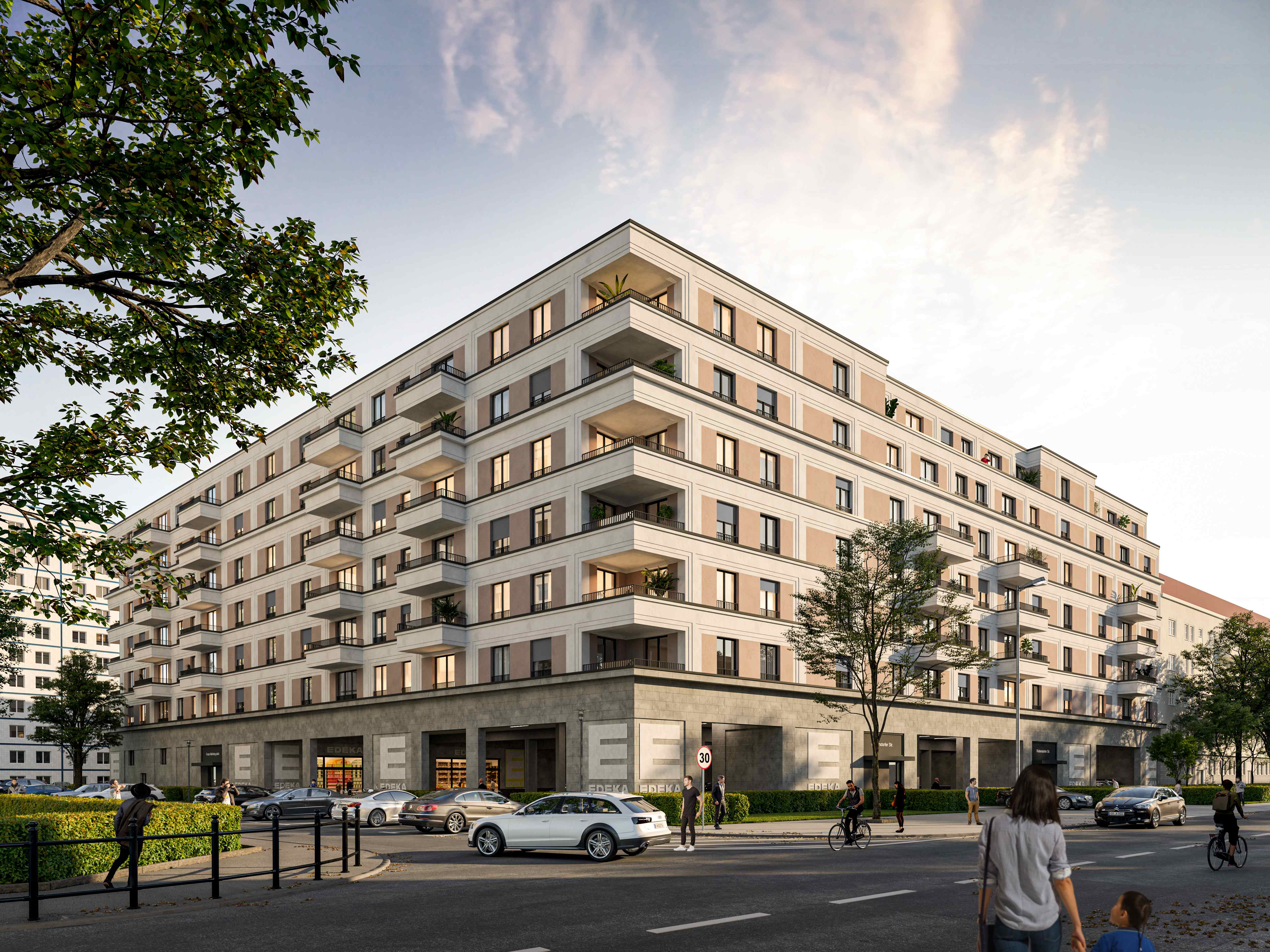 Zu den Straßenzügen Franz-Mehring-Platz, Rüdersdorfer Straße und Singerstraße wird an drei Straßenseiten ein Baukörper mit sieben Vollgeschossen errichtet.