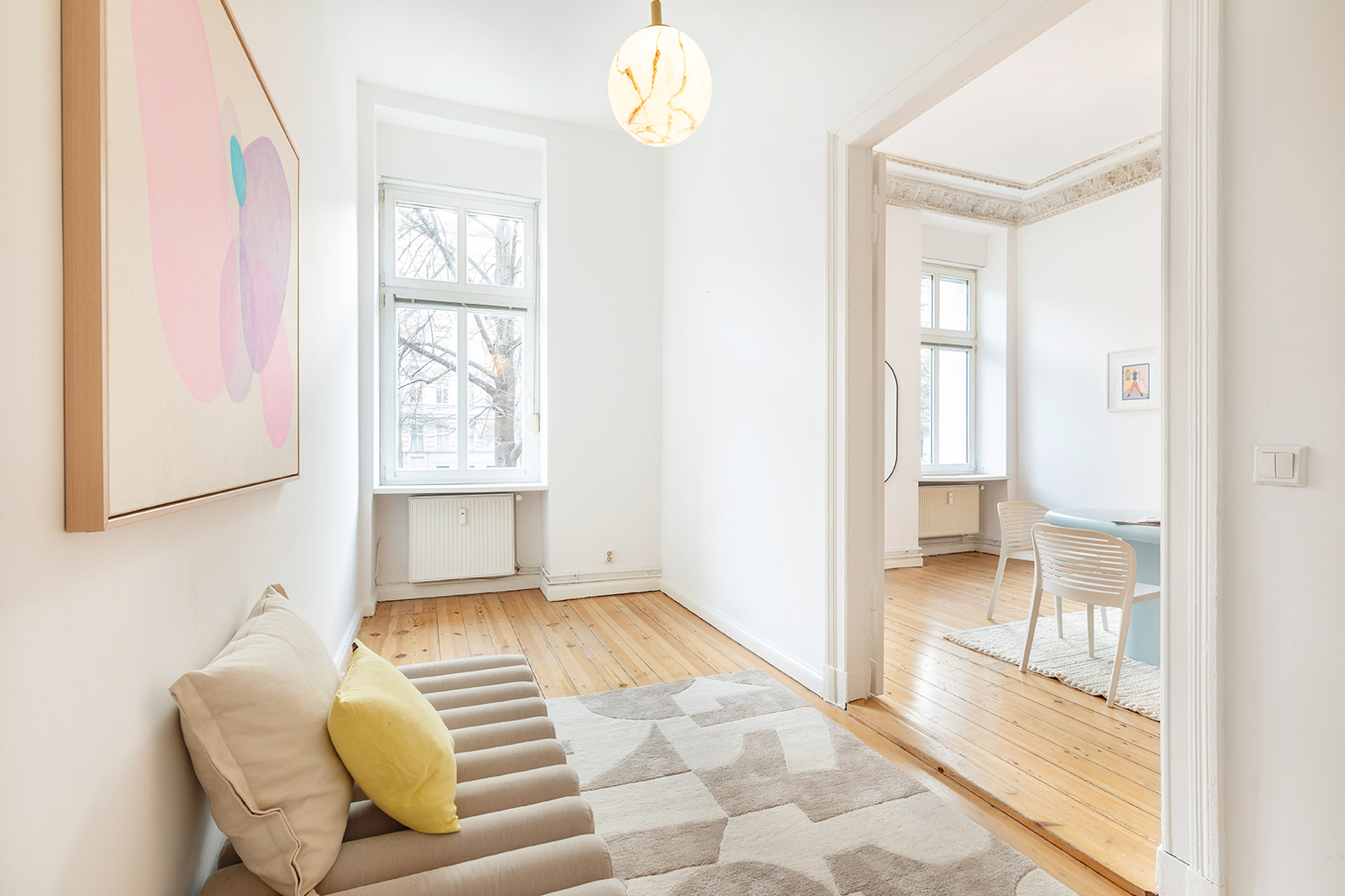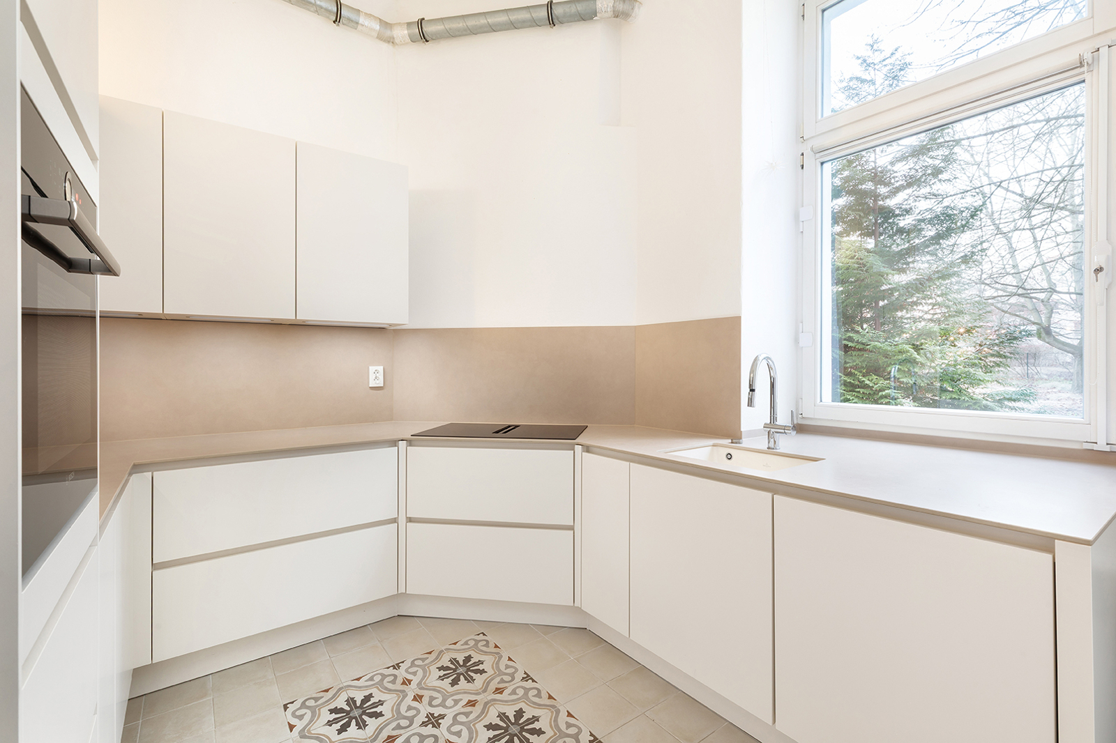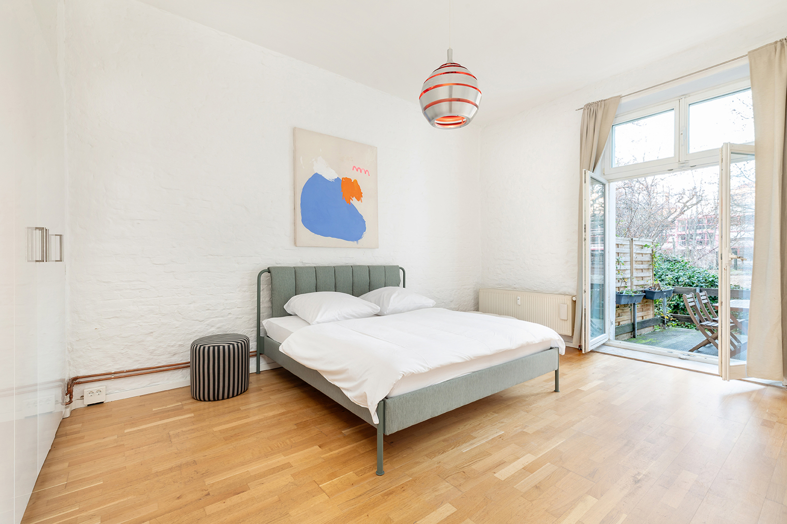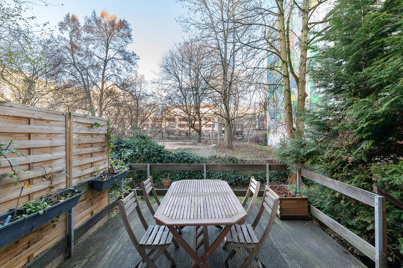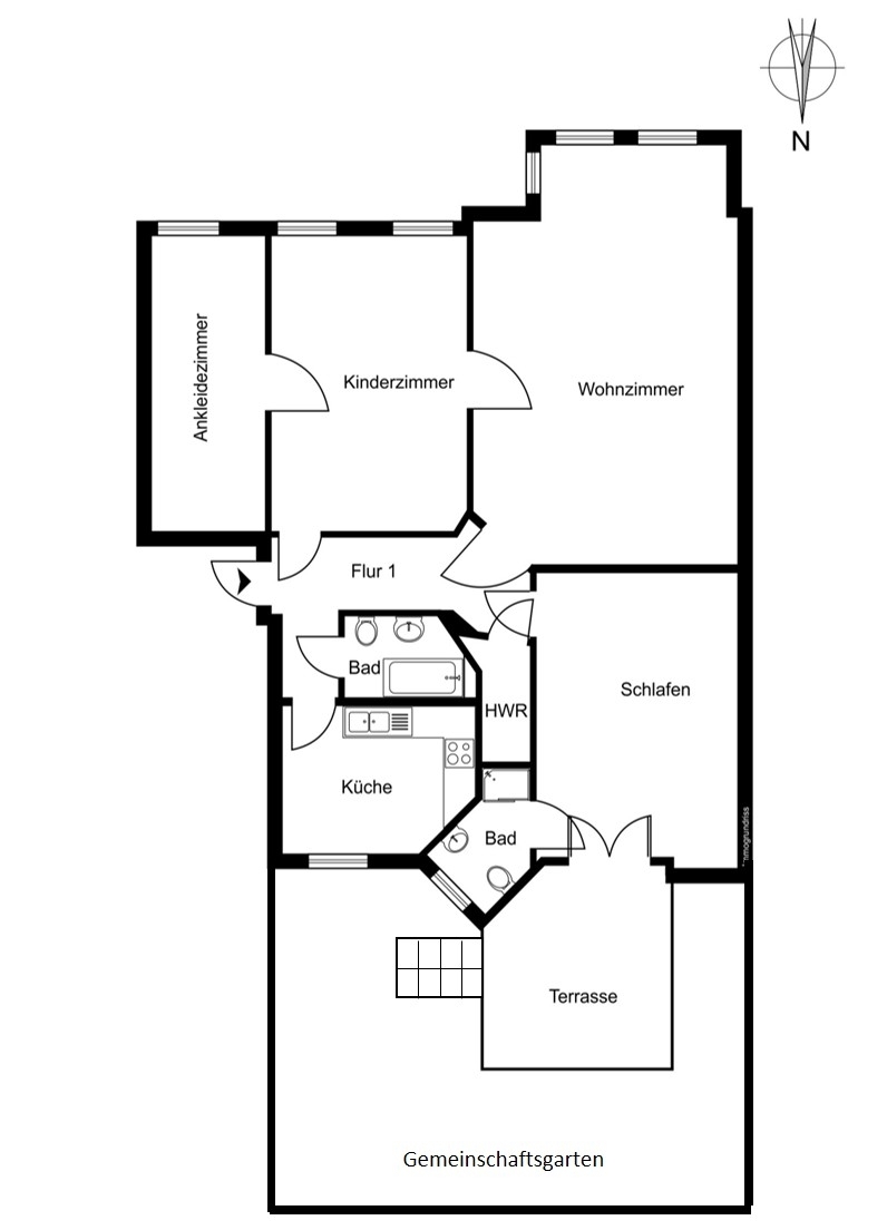 Metzer Straße, Kollwitzkiez: 4-room period apartment, garden terrace, bay window, 2 renovated bathrooms, Nolte fitted kitchen, elevated ground floor This prestigious period building blends harmoniously into the magnificent architecture of the picturesque Metzerstraße and consists of just one front building. Together with the neighboring buildings, it encloses a spacious, park-like inner courtyard. The manageable community comprises 11 apartments across the elevated ground floor and five upper stories. The shared property is in very good condition. After a complete renovation in 2003/2004, the building and its systems have been continuously maintained. For example, the central gas heating system was replaced in 2024. The apartment on offer, approx. 128 sqm, is located on a very elevated ground floor, providing a high level of privacy. Facing the rear, toward the park-like courtyard, are the newly installed Nolte kitchen (from two years ago) with high-quality appliances, the internal bathroom with bathtub, as well as a spacious bedroom or living room with en-suite bathroom and direct access to the terrace. The large terrace is perfect for cozy BBQ evenings in summer. Access to the communal garden is a highlight of this family-friendly apartment. The garden is primarily used by this apartment and is directly accessible both from the apartment and through the courtyard entrance. It is regularly mowed by the caretaker but also offers space for your own gardening. Facing the street are three interconnected rooms. Two of the three can also be accessed directly from the hallway, making them suitable for separate use. Currently, the middle room is used as the master bedroom. The smaller room on the left serves as a home office but could just as well be used as a child’s room or bedroom. The living room with bay window is to the right of the large bedroom and is also accessible from the hallway. Thanks to the bay windows, the room is flooded with beautiful natural light. Even in winter, the rooms are bright due to the wide street and central median of Metzerstraße, allowing sunlight to enter year-round. The three front rooms are south-facing, and two feature stunning original stucco details. The apartment also includes a second internal bathroom with a bathtub, and a storage room with hookups for a washer and dryer. Both bathrooms were fully renovated just last year and impress with carefully selected tiles and high-quality fixtures and ceramics. The insulated wood-framed windows were installed during the 2003/2004 renovation. The windows facing the street are equipped with manually operated external shutters, while the rear-facing windows have recently been fitted with security features. The high ceilings and original wooden floorboards, together with the stucco elements, create the classic charm of a Berlin Altbau. Bike racks and a clean waste disposal area are located in the courtyard. The dry basement provides a dedicated storage unit for each apartment, including this one. The apartment is available for immediate occupancy.