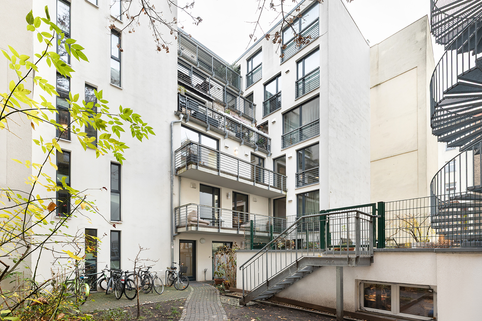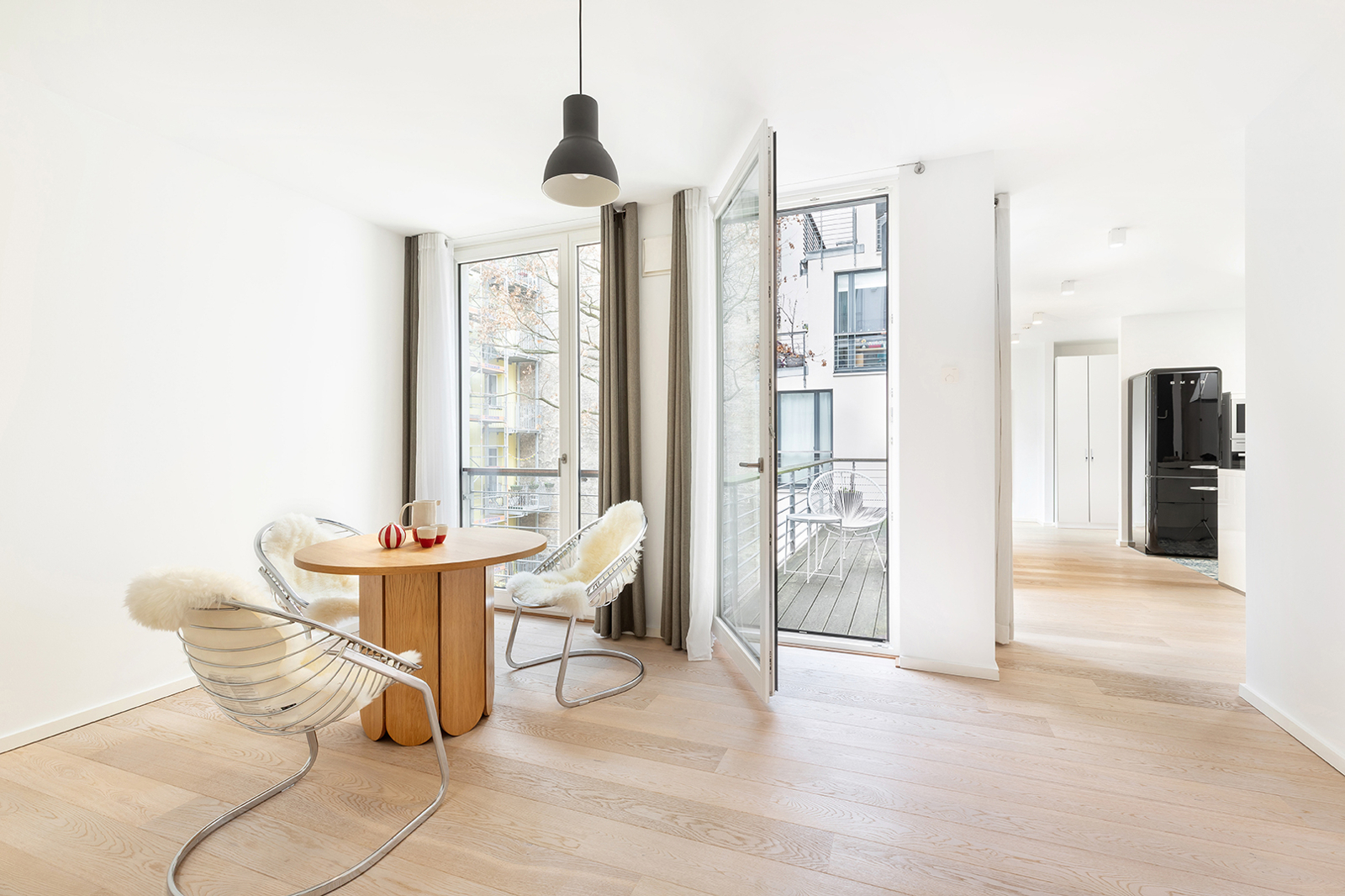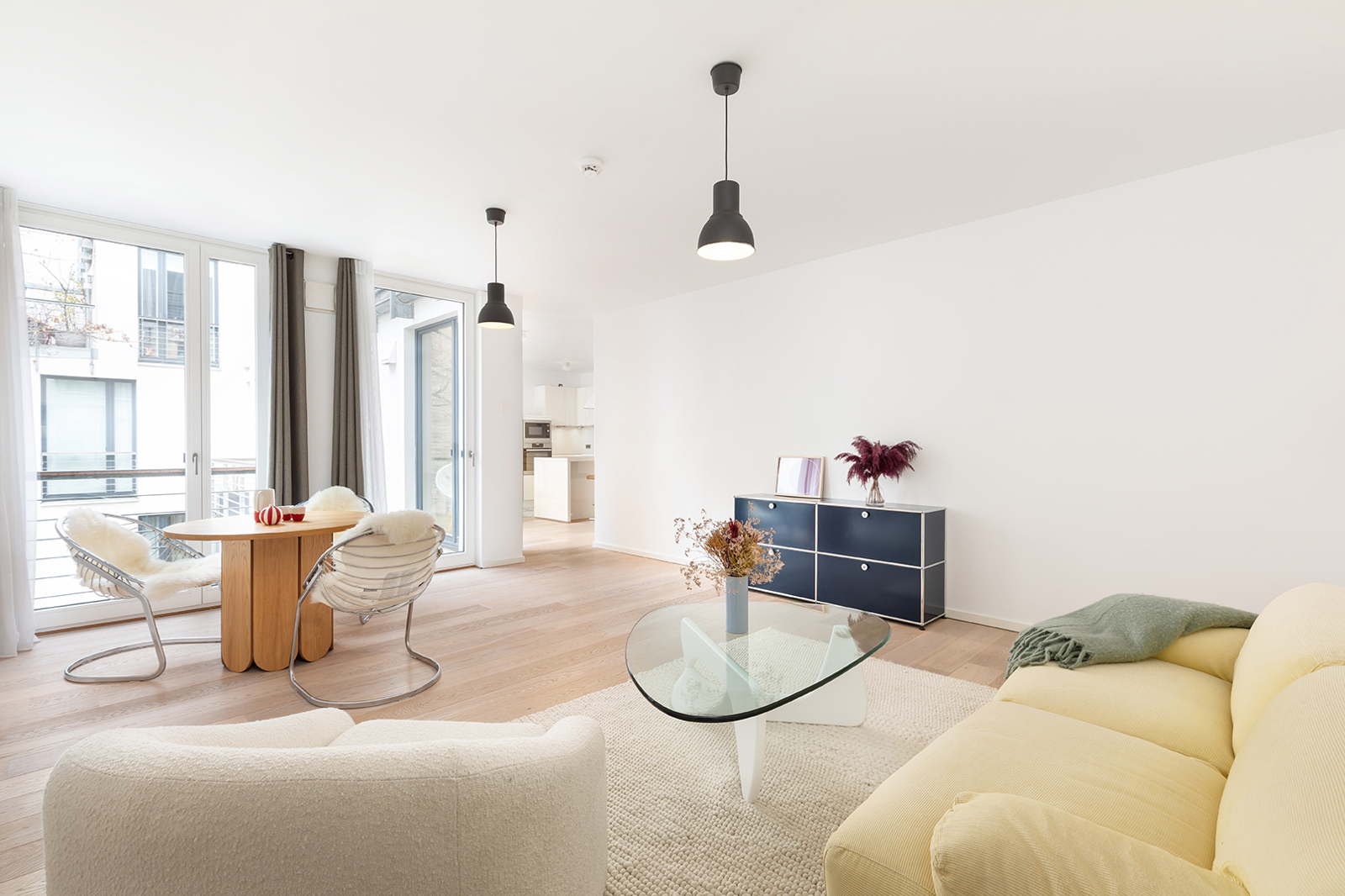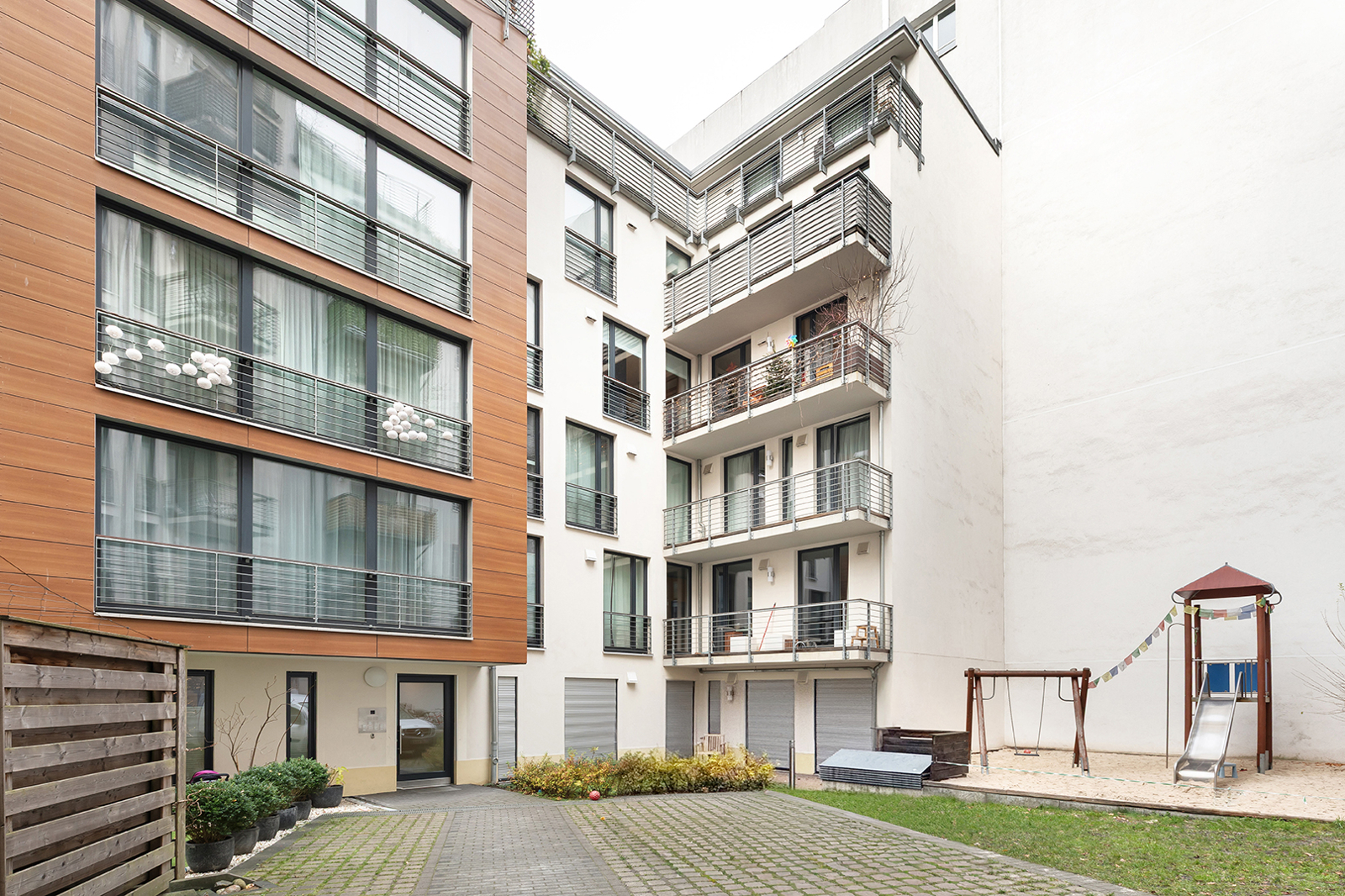 Prenzlauer Berg, Pappelallee: Bright new-build apartment with large west-facing balconie, lift, energy rating A This new-build property in the popular Prenzlauer Berg district was constructed in 2012 to KfW70 standards and is in very good condition. The modern heating system, which combines gas and a combined heat and power plant, ensures unusually low costs (energy rating A). The building consists of a front and rear building, in which the flat is located on the 2nd floor. The lift takes you comfortably to the 3-room apartment on offer here, which measures approx. 82.12 m². The spacious kitchen-diner opens up as soon as you enter the flat. The custom-made fitted kitchen is fully equipped with brand-name appliances, and the room offers enough space for a large dining table. The entire west side of the room has floor-to-ceiling windows and offers direct access to the approx. 8 m² balcony. The living room, measuring just under 26 m², also has generous windows and access to the balcony. Both rooms face the quiet second courtyard. On the other side, the bedroom faces the first courtyard, which is also very quiet. A large, white-tiled bathroom with a floor-level shower and double sink, as well as a practical storage room with a washing machine connection, complete the apartment. It is conceivable to combine the living room and kitchen and use the current living room as an additional bedroom/study. All living areas are fitted with light wooden floorboards, under which underfloor heating provides pleasant warmth. Overall, the apartment is very bright and modern and is in very good condition. A basement room provides additional storage space. The apartment is available for occupancy on short notice.