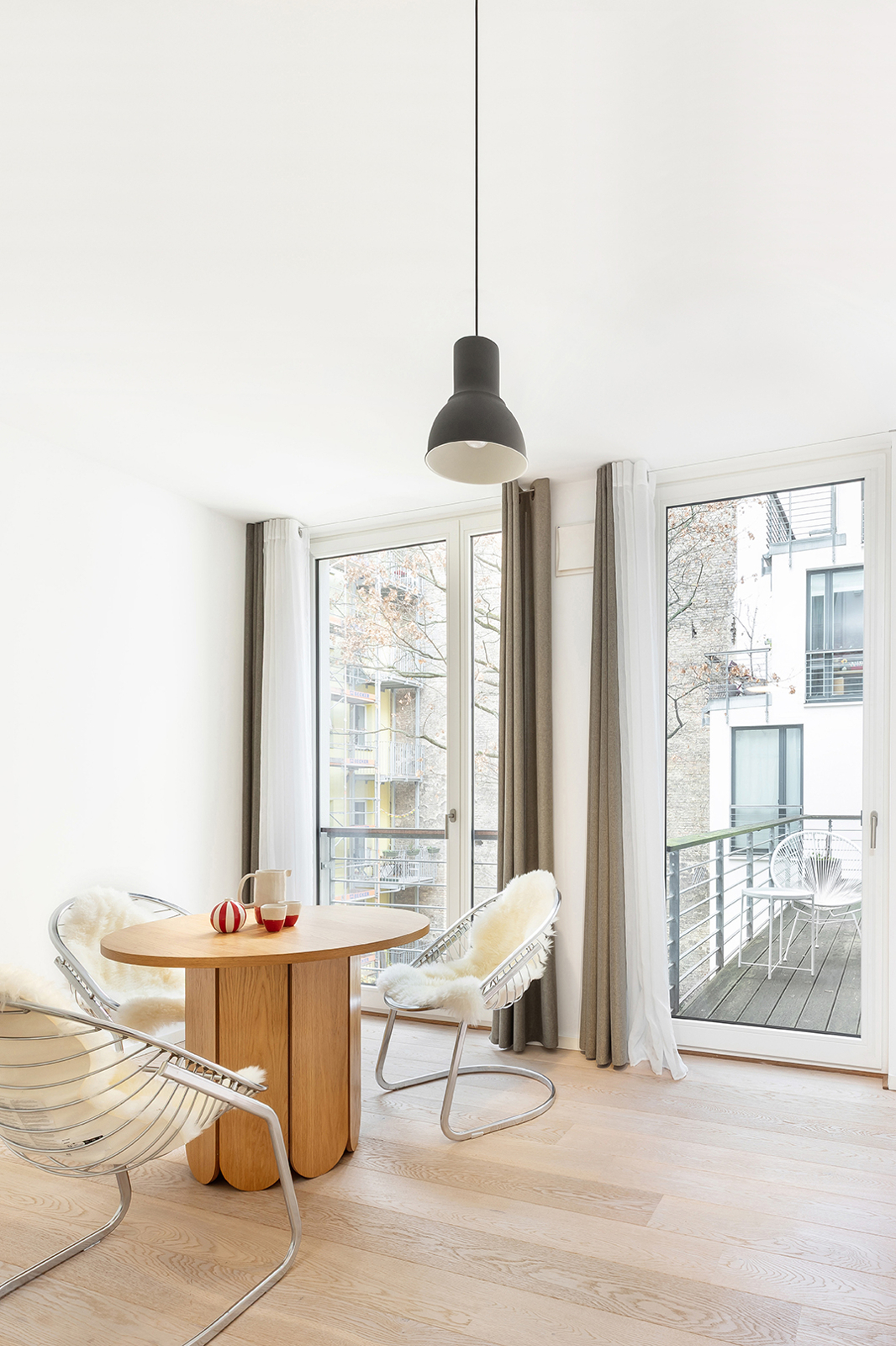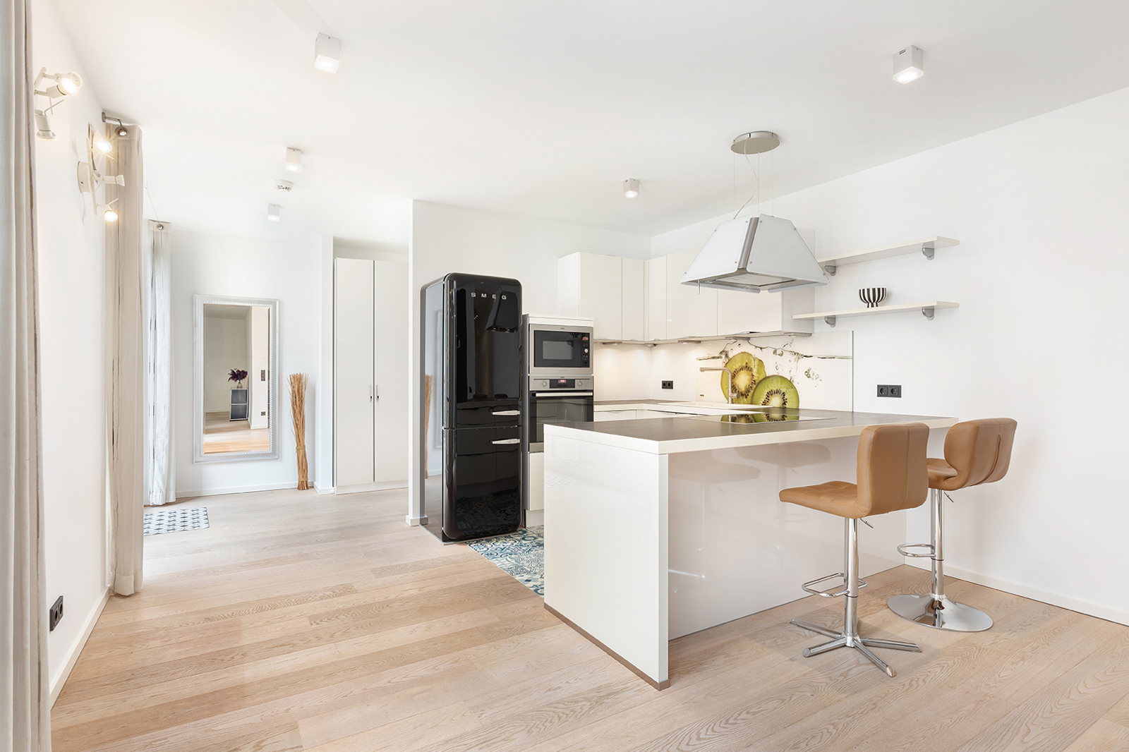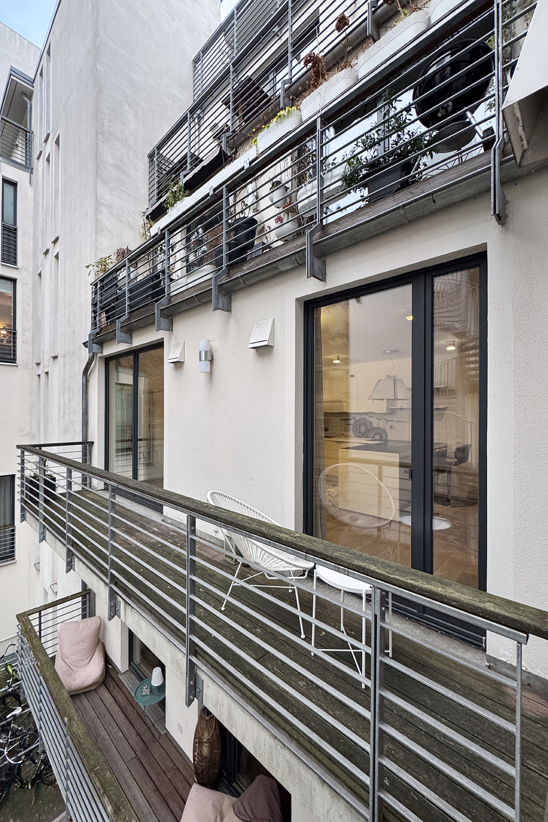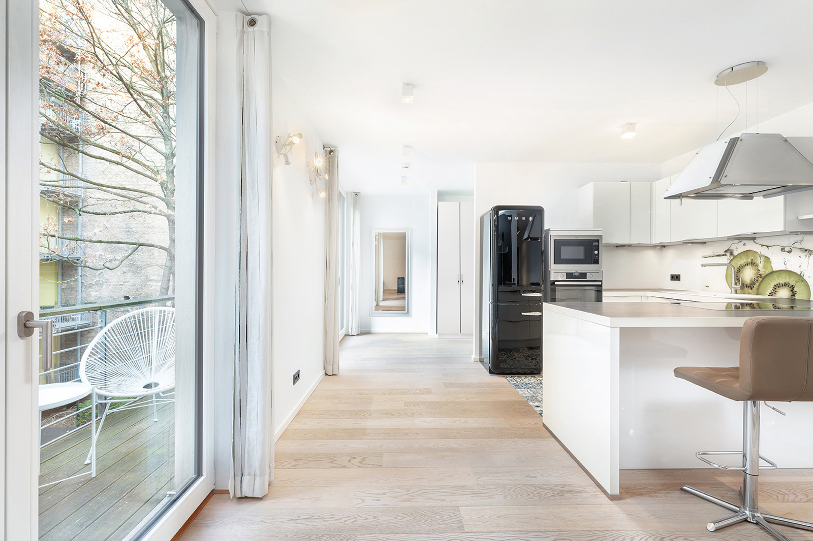 Prenzlauer Berg, Pappelallee: Bright new-build apartment with large west-facing balconie, lift, energy rating A This new-build property in the popular Prenzlauer Berg district was constructed in 2012 to KfW70 standards and is in very good condition. The modern heating system, which combines gas and a combined heat and power plant, ensures unusually low costs (energy rating A). The building consists of a front and rear building, in which the flat is located on the 2nd floor. The lift takes you comfortably to the 3-room apartment on offer here, which measures approx. 82.12 m². The spacious kitchen-diner opens up as soon as you enter the flat. The custom-made fitted kitchen is fully equipped with brand-name appliances, and the room offers enough space for a large dining table. The entire west side of the room has floor-to-ceiling windows and offers direct access to the approx. 8 m² balcony. The living room, measuring just under 26 m², also has generous windows and access to the balcony. Both rooms face the quiet second courtyard. On the other side, the bedroom faces the first courtyard, which is also very quiet. A large, white-tiled bathroom with a floor-level shower and double sink, as well as a practical storage room with a washing machine connection, complete the apartment. It is conceivable to combine the living room and kitchen and use the current living room as an additional bedroom/study. All living areas are fitted with light wooden floorboards, under which underfloor heating provides pleasant warmth. Overall, the apartment is very bright and modern and is in very good condition. A basement room provides additional storage space. The apartment is available for occupancy on short notice.