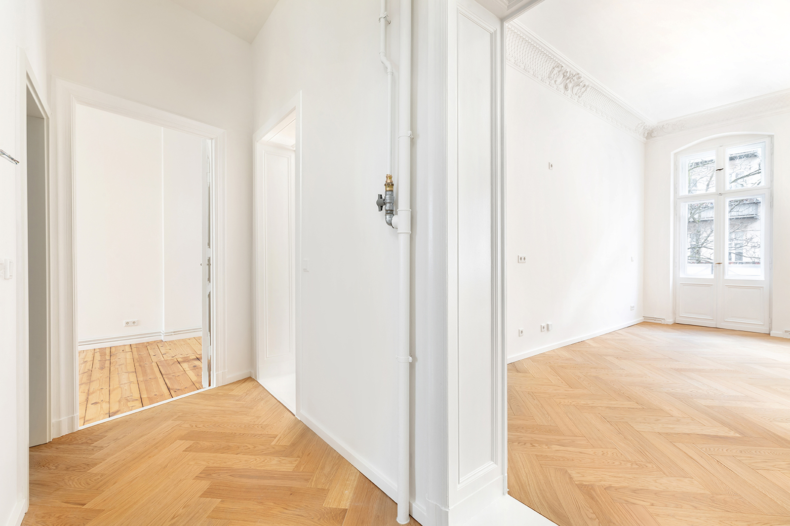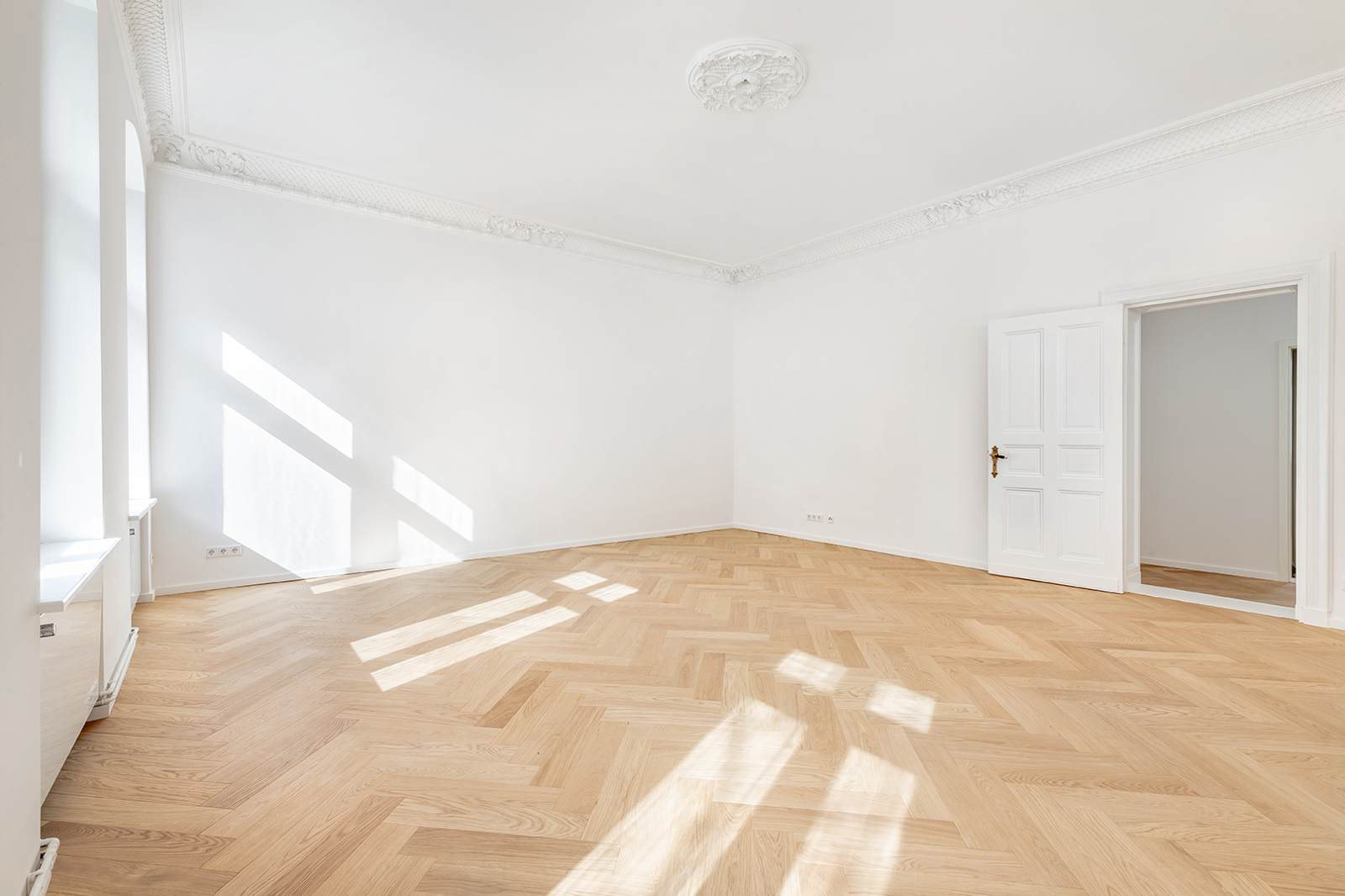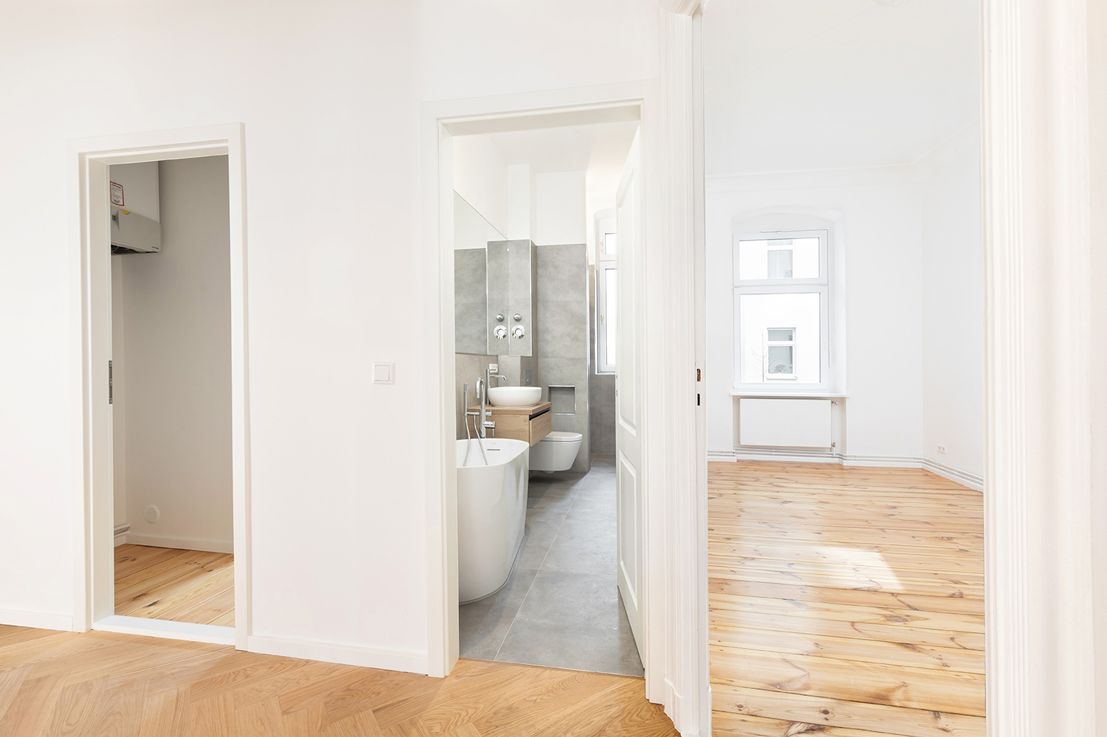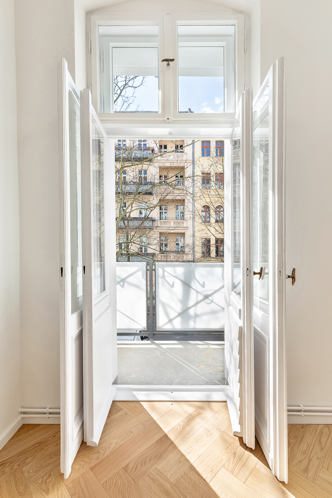 Prenzlauer Berg: Newly and fully refurbished 4-room period apartment with south-facing balcony, new electrics and heating system The apartment offered here has been recently refurbished and is located on the first floor of a very well-maintained historic Berlin building dating back to the Gründerzeit era. A total of 36 units are distributed across the front building, side wing, and rear building. As part of the refurbishment, the apartment was comprehensively upgraded: high-quality solid wood parquet flooring in a herringbone pattern was installed, and existing wooden floorboards were carefully restored. The historic double box windows were refurbished, the beautiful original stucco elements were restored and partially supplemented, and walls and ceilings were replastered and finished. The bathroom was fully modernized. Overall, the apartment offers a classic yet warm living atmosphere. In addition, a new, modern, and energy-efficient boiler with Wi-Fi control, along with new radiators, has been installed. Combined with an energy efficiency rating of class C, the apartment is also technically up to modern standards. Thanks to a clear and well-structured layout, approximately 100 sqm of living space is distributed across three bedrooms, a spacious eat-in kitchen, a bathroom, and a sun-filled south-facing balcony. The heart of the apartment is the generous eat-in kitchen, designed as the central living area. Cooking, dining, and relaxing come together here in a comfortable and inviting way. The space offers ample room for a fully fitted kitchen, a large dining table, and a cozy living area. From here, you have direct access to the south-facing balcony, which perfectly complements the living space and provides plenty of natural light. A well-maintained fitted kitchen can be provided free of charge by the owner upon request. The apartment features a total of three rooms that can be used flexibly. The largest bedroom is located adjacent to the main living area and offers ample space for a bed, wardrobes, and a desk. Another room is situated opposite and overlooks the quiet courtyard—ideal as a children’s room or home office. The third room is accessible via a separate anteroom, which provides additional storage space and can be perfectly used as a walk-in wardrobe or functional transition area. The bathroom has been completely redesigned and stands out with its clean and high-quality finish. It features a freestanding bathtub and a separate walk-in shower, offering both comfort and functionality. A window ensures natural ventilation and additional daylight. The offer is rounded off by a private basement storage unit.