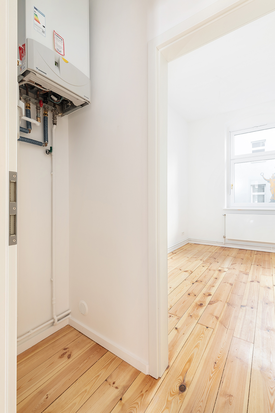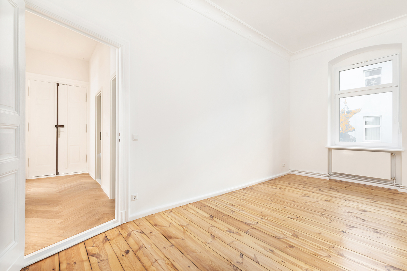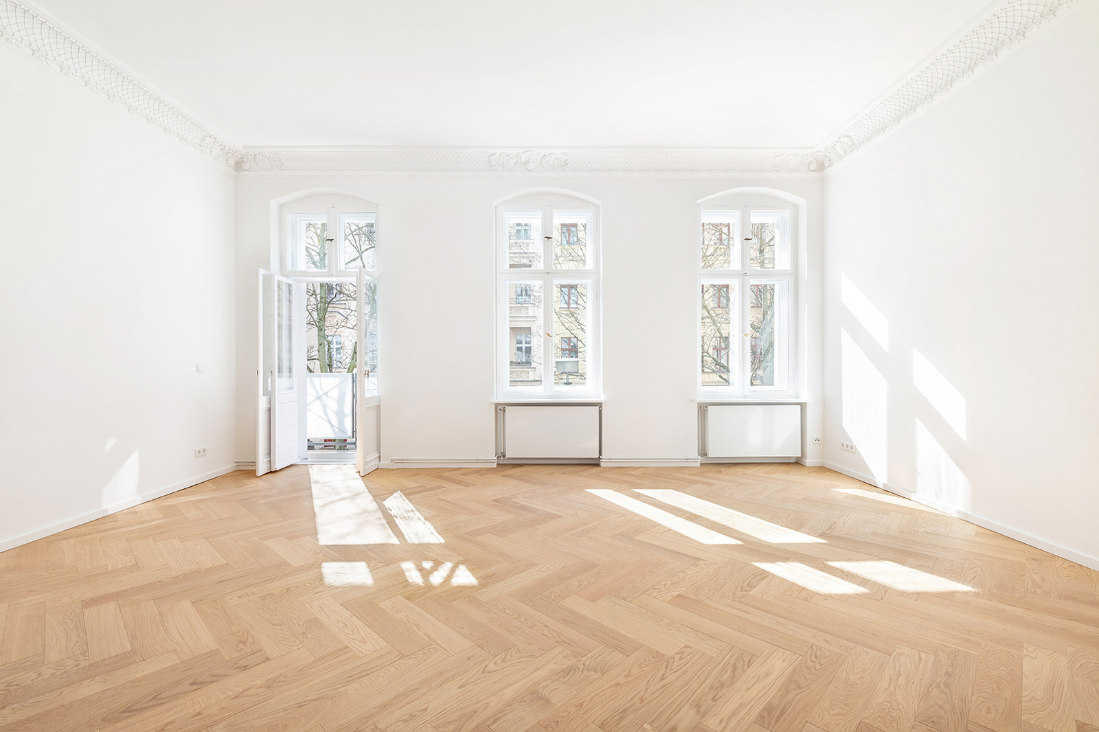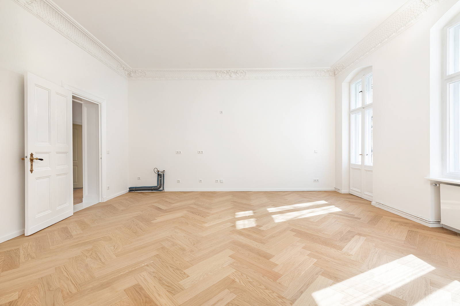 Prenzlauer Berg: Newly and fully refurbished 4-room period apartment with south-facing balcony, new electrics and heating system The apartment offered here has been recently refurbished and is located on the first floor of a very well-maintained historic Berlin building dating back to the Gründerzeit era. A total of 36 units are distributed across the front building, side wing, and rear building. As part of the refurbishment, the apartment was comprehensively upgraded: high-quality solid wood parquet flooring in a herringbone pattern was installed, and existing wooden floorboards were carefully restored. The historic double box windows were refurbished, the beautiful original stucco elements were restored and partially supplemented, and walls and ceilings were replastered and finished. The bathroom was fully modernized. Overall, the apartment offers a classic yet warm living atmosphere. In addition, a new, modern, and energy-efficient boiler with Wi-Fi control, along with new radiators, has been installed. Combined with an energy efficiency rating of class C, the apartment is also technically up to modern standards. Thanks to a clear and well-structured layout, approximately 100 sqm of living space is distributed across three bedrooms, a spacious eat-in kitchen, a bathroom, and a sun-filled south-facing balcony. The heart of the apartment is the generous eat-in kitchen, designed as the central living area. Cooking, dining, and relaxing come together here in a comfortable and inviting way. The space offers ample room for a fully fitted kitchen, a large dining table, and a cozy living area. From here, you have direct access to the south-facing balcony, which perfectly complements the living space and provides plenty of natural light. A well-maintained fitted kitchen can be provided free of charge by the owner upon request. The apartment features a total of three rooms that can be used flexibly. The largest bedroom is located adjacent to the main living area and offers ample space for a bed, wardrobes, and a desk. Another room is situated opposite and overlooks the quiet courtyard—ideal as a children’s room or home office. The third room is accessible via a separate anteroom, which provides additional storage space and can be perfectly used as a walk-in wardrobe or functional transition area. The bathroom has been completely redesigned and stands out with its clean and high-quality finish. It features a freestanding bathtub and a separate walk-in shower, offering both comfort and functionality. A window ensures natural ventilation and additional daylight. The offer is rounded off by a private basement storage unit.
