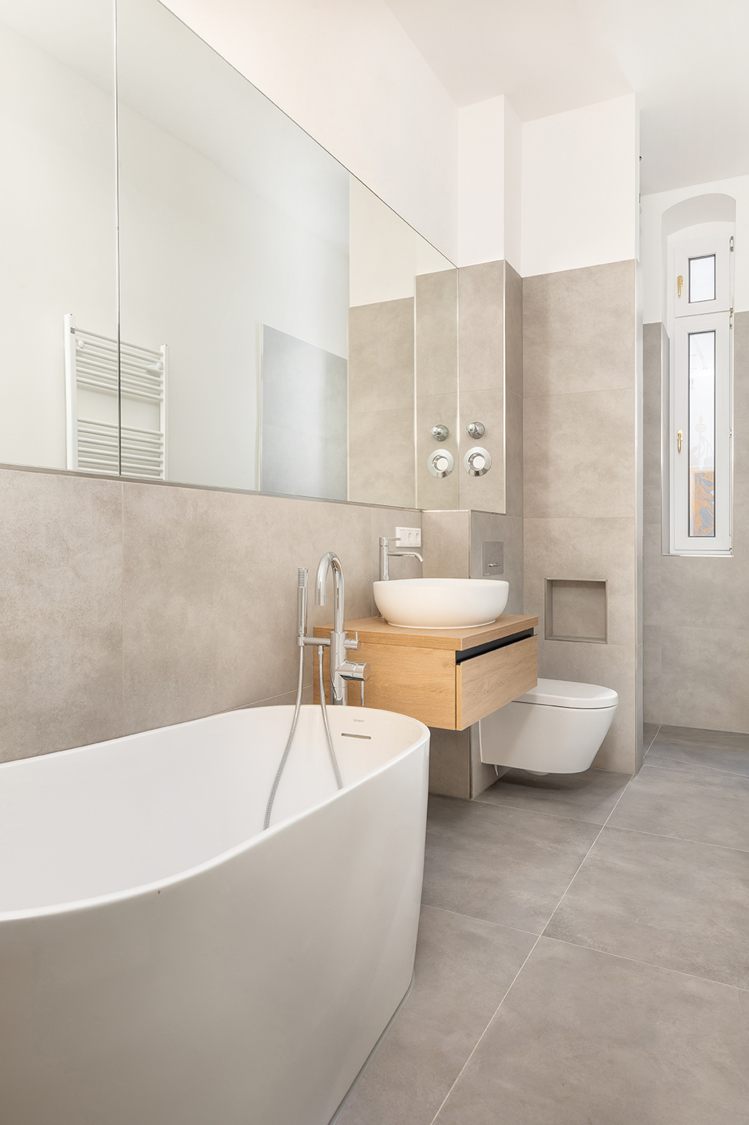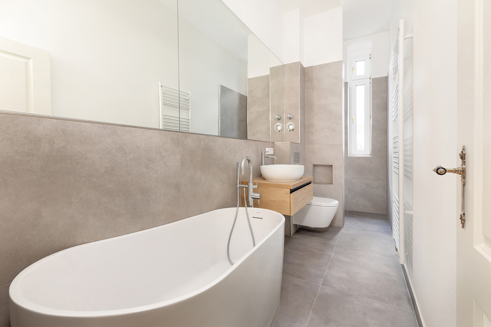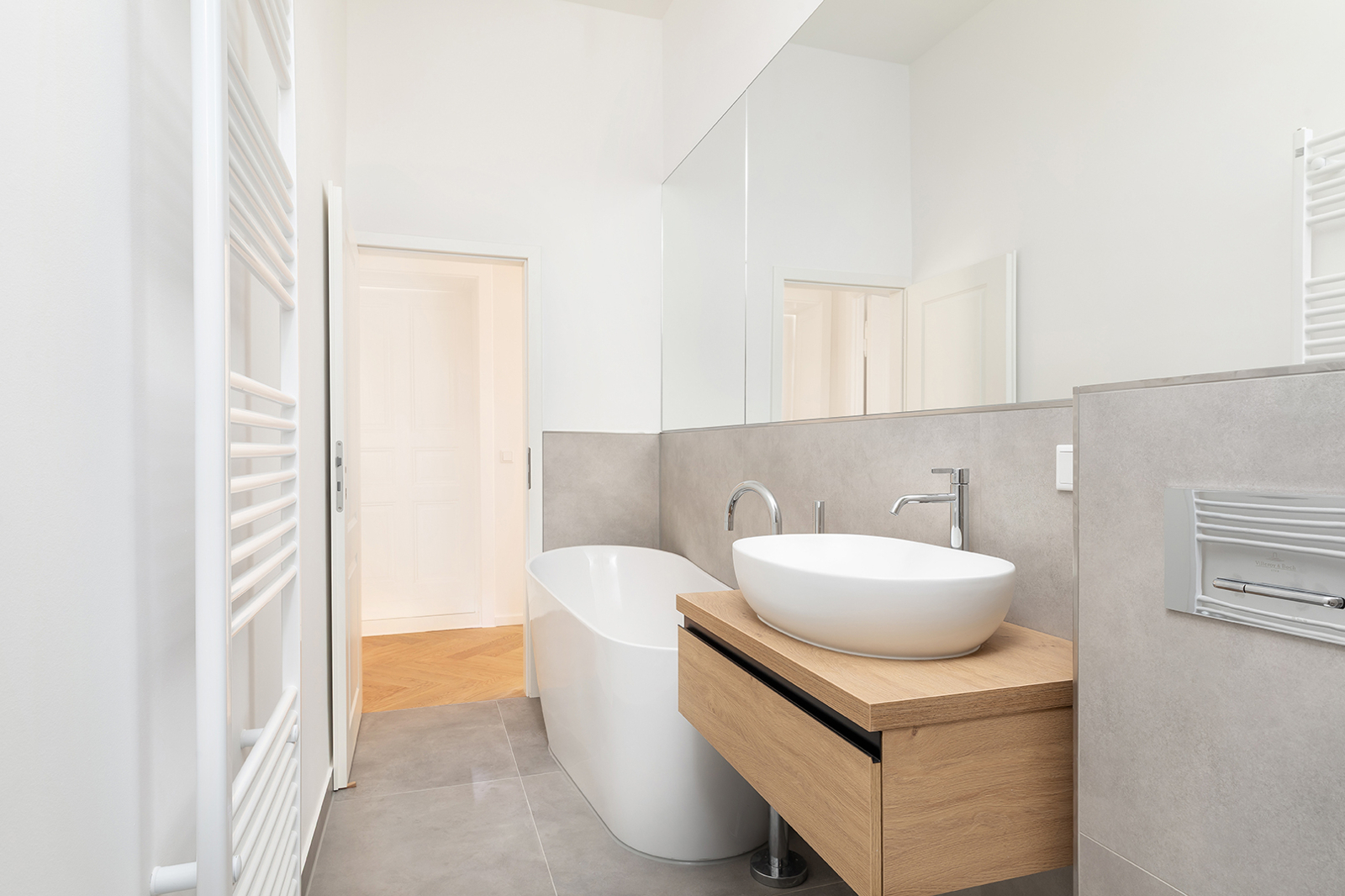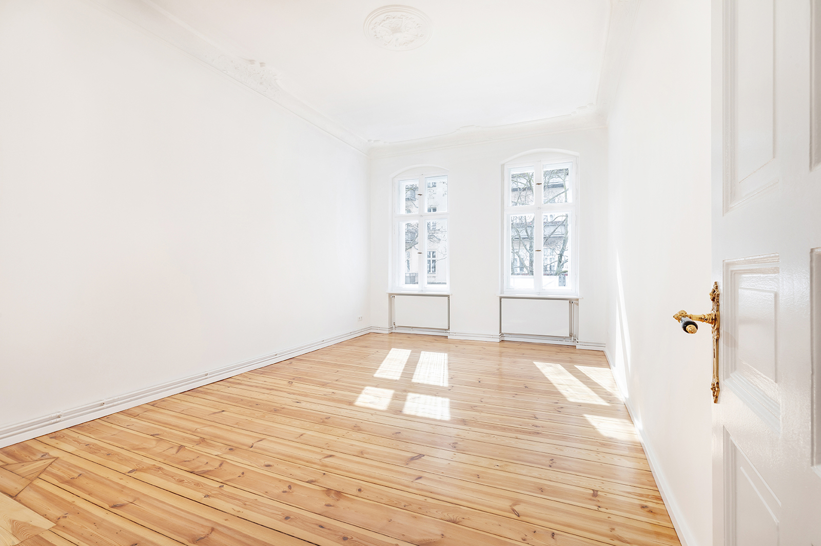 Prenzlauer Berg: Newly and fully refurbished 4-room period apartment with south-facing balcony, new electrics and heating system The apartment offered here has been recently refurbished and is located on the first floor of a very well-maintained historic Berlin building dating back to the Gründerzeit era. A total of 36 units are distributed across the front building, side wing, and rear building. As part of the refurbishment, the apartment was comprehensively upgraded: high-quality solid wood parquet flooring in a herringbone pattern was installed, and existing wooden floorboards were carefully restored. The historic double box windows were refurbished, the beautiful original stucco elements were restored and partially supplemented, and walls and ceilings were replastered and finished. The bathroom was fully modernized. Overall, the apartment offers a classic yet warm living atmosphere. In addition, a new, modern, and energy-efficient boiler with Wi-Fi control, along with new radiators, has been installed. Combined with an energy efficiency rating of class C, the apartment is also technically up to modern standards. Thanks to a clear and well-structured layout, approximately 100 sqm of living space is distributed across three bedrooms, a spacious eat-in kitchen, a bathroom, and a sun-filled south-facing balcony. The heart of the apartment is the generous eat-in kitchen, designed as the central living area. Cooking, dining, and relaxing come together here in a comfortable and inviting way. The space offers ample room for a fully fitted kitchen, a large dining table, and a cozy living area. From here, you have direct access to the south-facing balcony, which perfectly complements the living space and provides plenty of natural light. A well-maintained fitted kitchen can be provided free of charge by the owner upon request. The apartment features a total of three rooms that can be used flexibly. The largest bedroom is located adjacent to the main living area and offers ample space for a bed, wardrobes, and a desk. Another room is situated opposite and overlooks the quiet courtyard—ideal as a children’s room or home office. The third room is accessible via a separate anteroom, which provides additional storage space and can be perfectly used as a walk-in wardrobe or functional transition area. The bathroom has been completely redesigned and stands out with its clean and high-quality finish. It features a freestanding bathtub and a separate walk-in shower, offering both comfort and functionality. A window ensures natural ventilation and additional daylight. The offer is rounded off by a private basement storage unit.