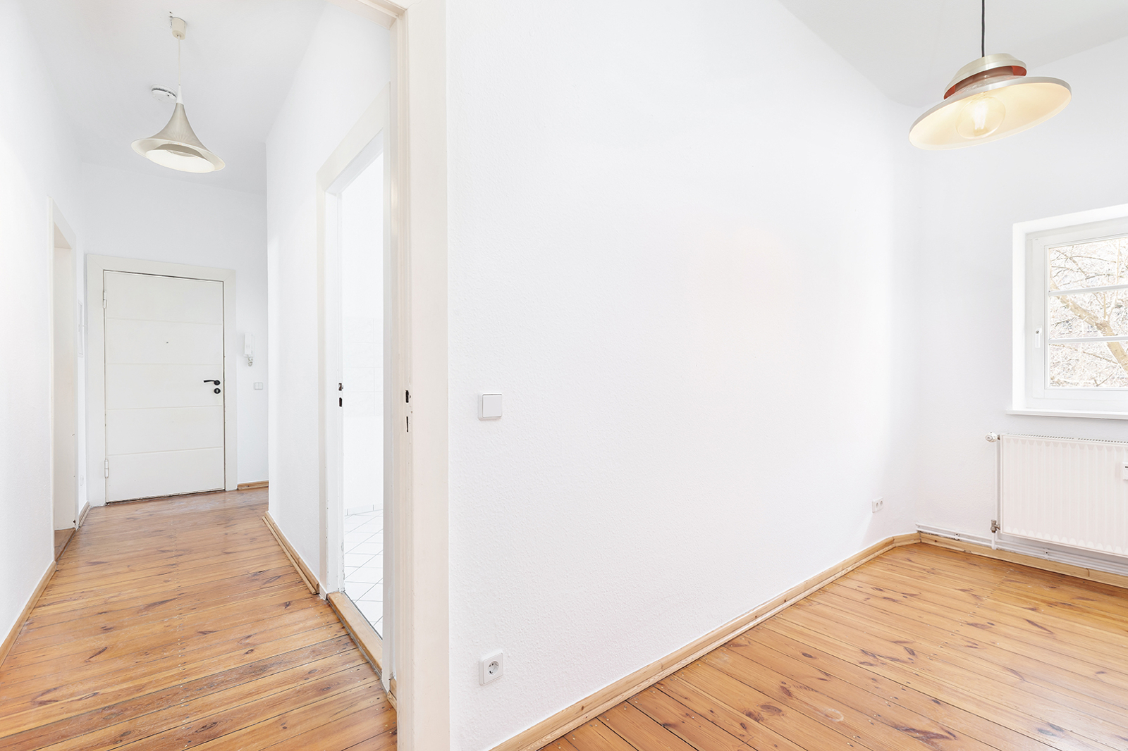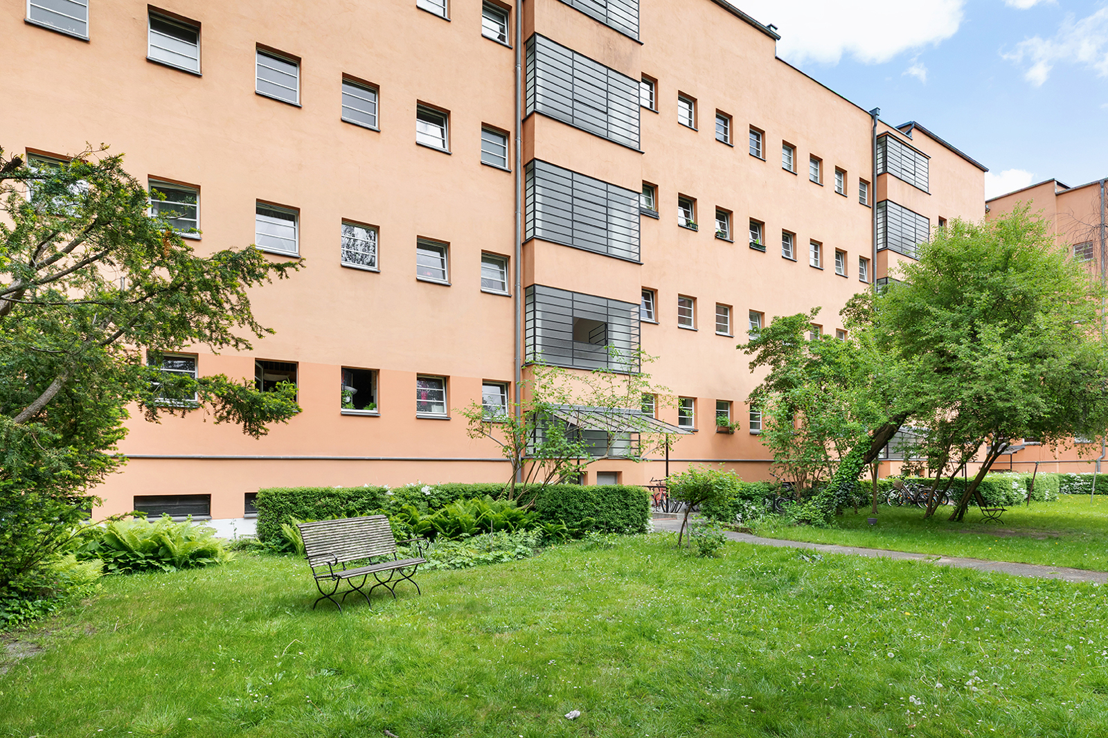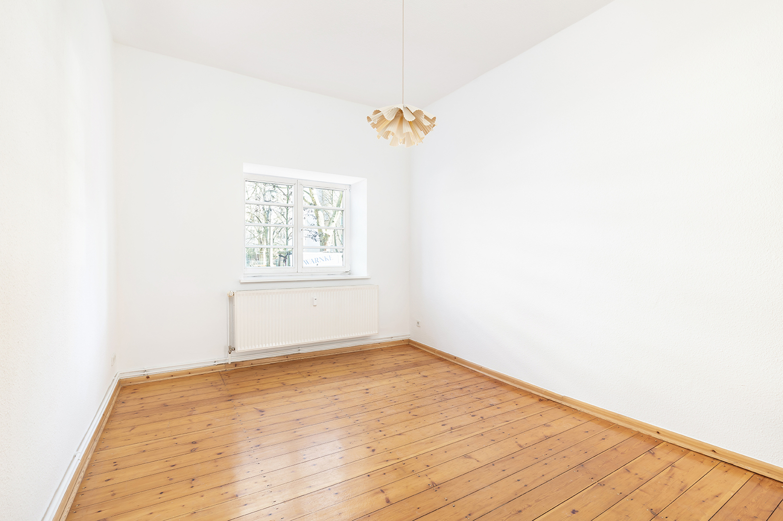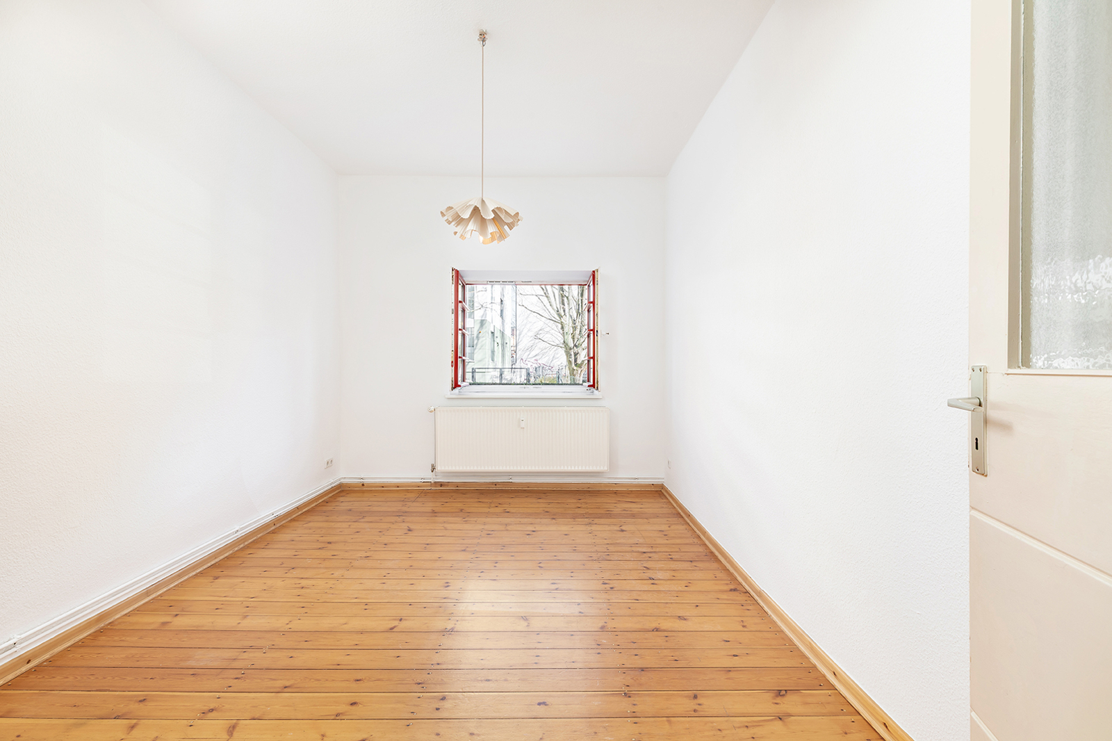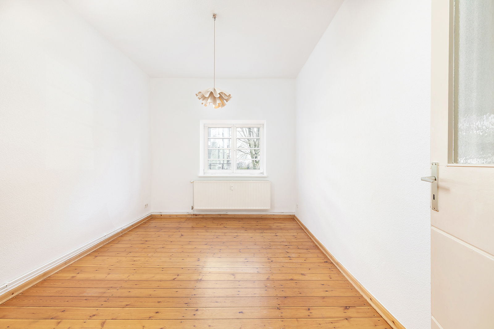 Talstraße, near Prenzlauer Berg: 2.5-room apartment in a listed historic building, communal garden, district heating The apartment on offer is located in an architecturally distinctive residential complex on Talstraße, constructed between 1925 and 1926 based on designs by the renowned architect Erwin Anton Gutkind. This listed ensemble is a prime example of the high-quality residential architecture of the Weimar Republic, characterized by its open layout, spacious inner courtyards, and an exceptionally green and მშვიდ living environment. A particular highlight is the expansive communal garden, offering plenty of greenery, light, and space, and available to all residents – significantly enhancing the overall quality of living. Despite its ground-floor position, the apartment enjoys a high level of privacy: a small front garden area with hedges provides natural screening and creates a comfortable distance from the sidewalk. Talstraße itself is a quiet residential street and has recently been converted into a one-way street, further reducing traffic. The apartment has been freshly painted and is presented in a very well-maintained condition. Typical period features such as ceiling heights of approximately 3 meters, well-preserved original wooden floorboards, and historic windows emphasize its distinctive character. The well-balanced layout spans approximately three well-proportioned rooms: two rooms of around 15 sqm each facing the street offer flexible usage options, while an additional room facing the garden provides a शांत retreat – ideal as a study, guest room, or children's room. The spacious kitchen offers ample room for the installation of a new fitted kitchen as well as a dining area. The previous kitchen has already been removed, allowing for full customization. From here, you also enjoy a pleasant view of the green communal garden. The apartment is completed by a daylight bathroom. A private cellar compartment is included.
